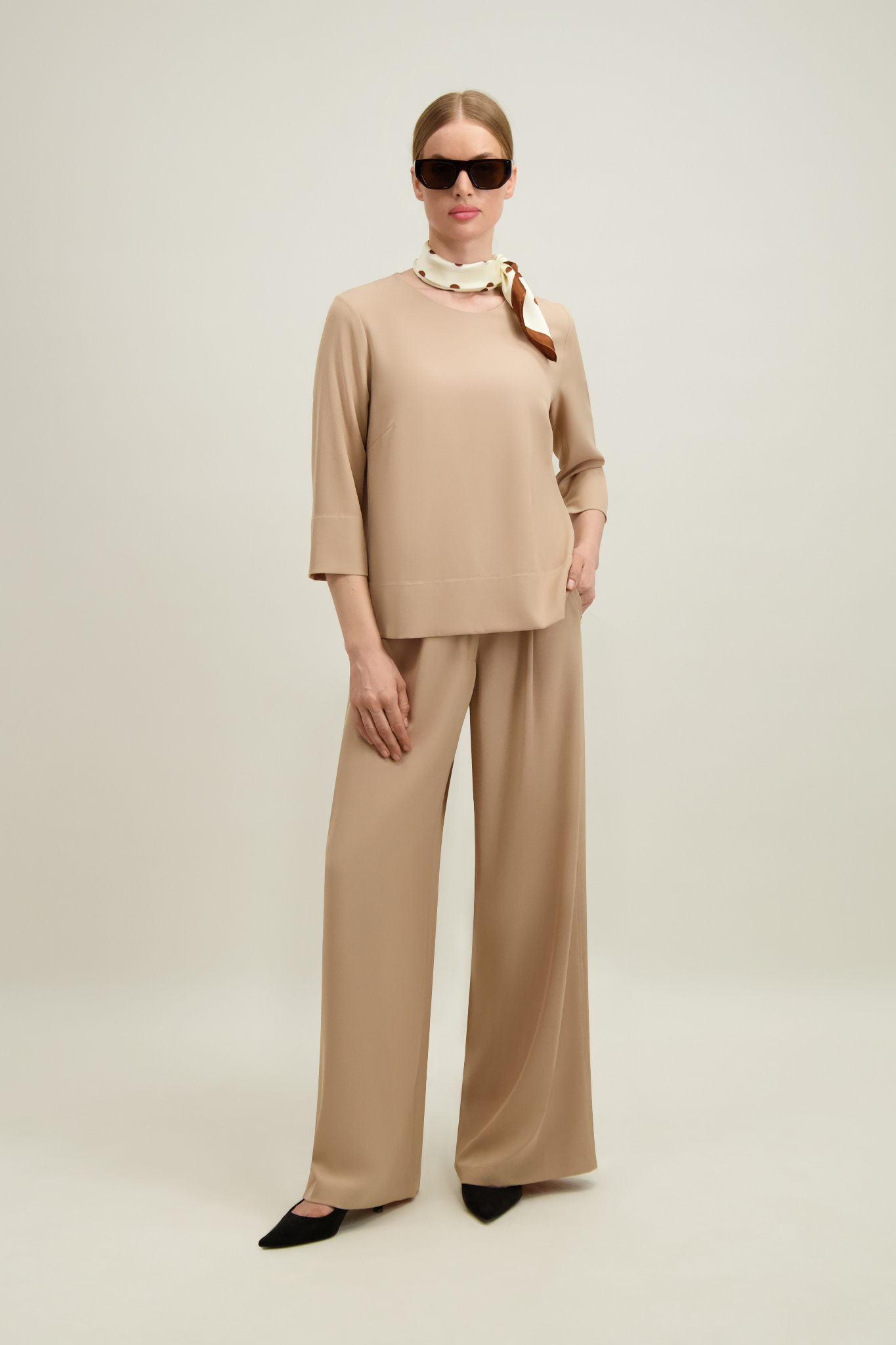 Bluzka ze spodniami (57798) z tej samej tkaniny tworzy komplet.