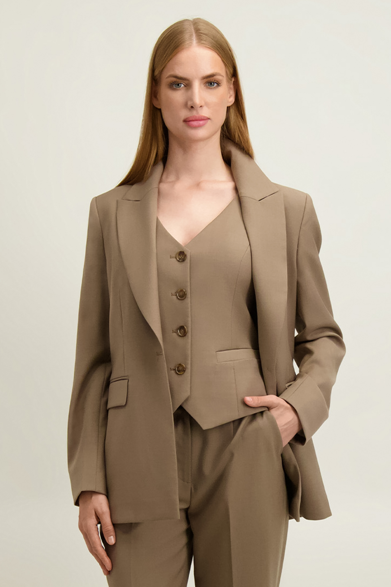 Marynarka z kamizelką (87525) i spodniami (87524) z tej samej tkaniny tworzy komplet.