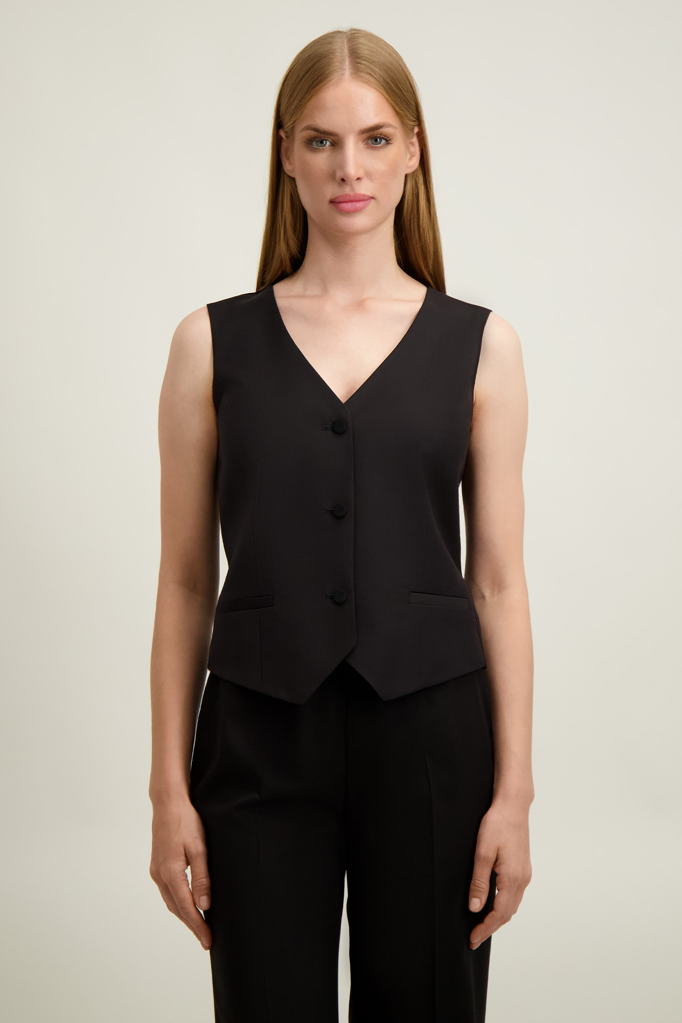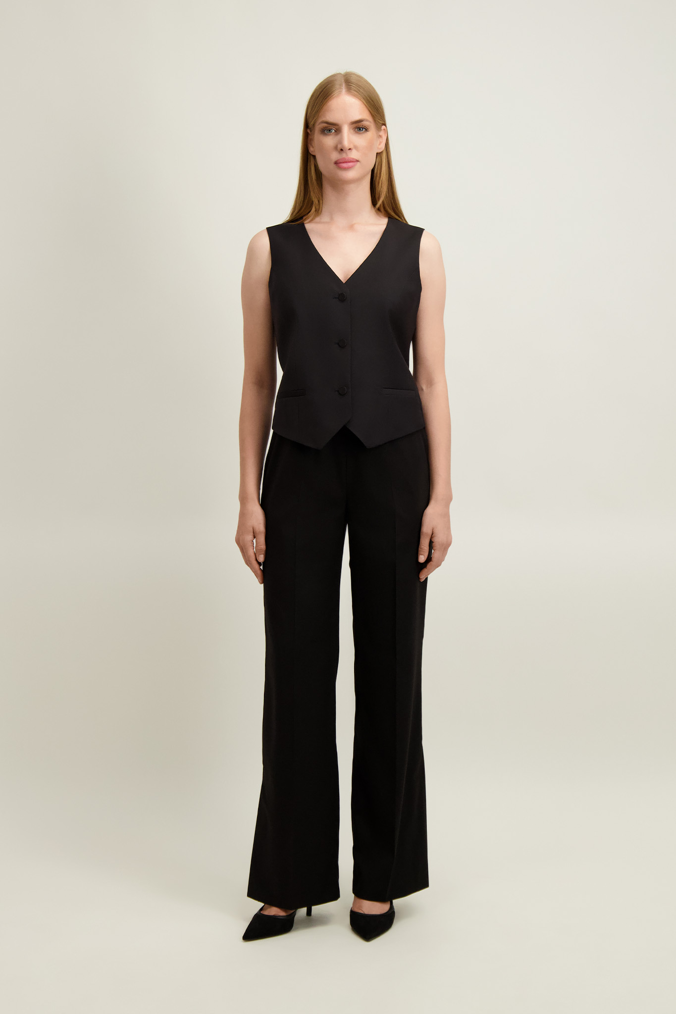 Kamizelka z marynarką (87545) i spodniami (87546 lub 87555) z tej samej tkaniny tworzy komplet.