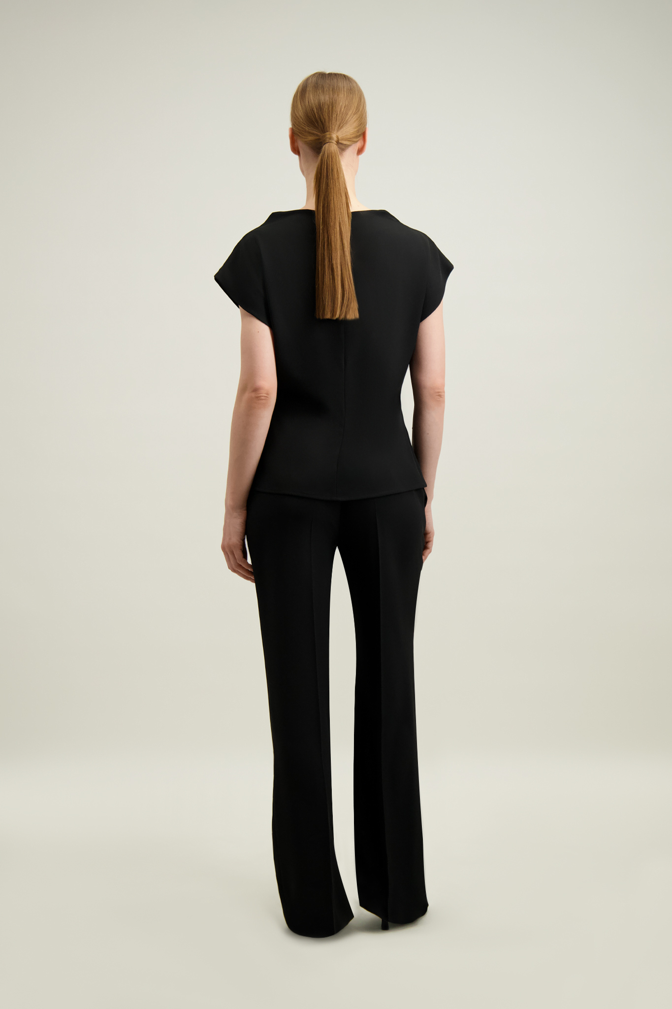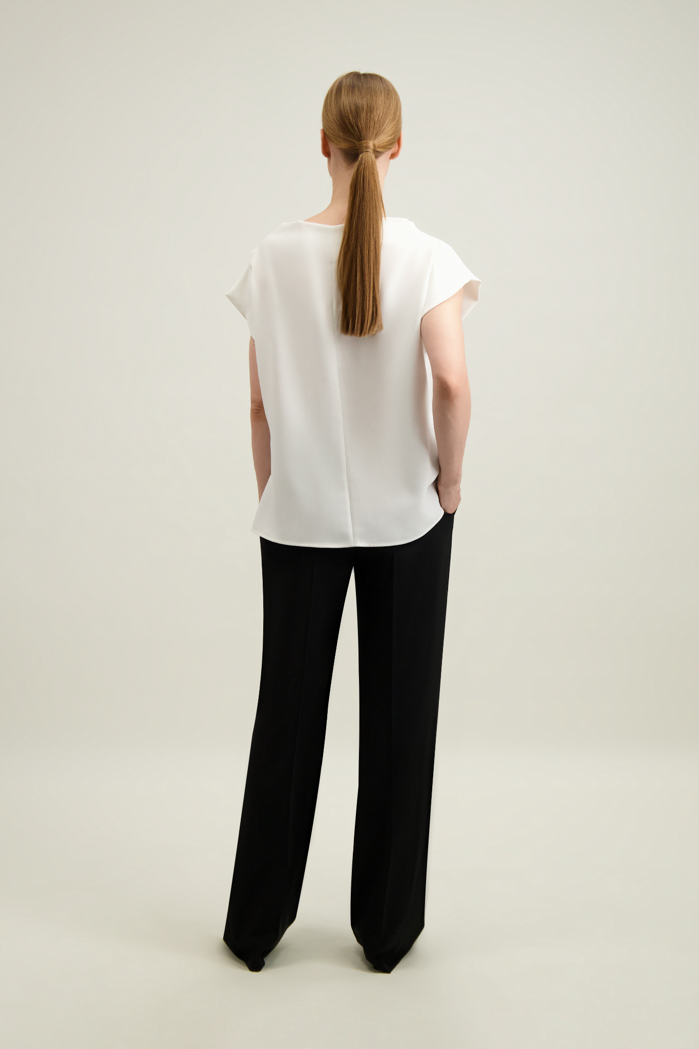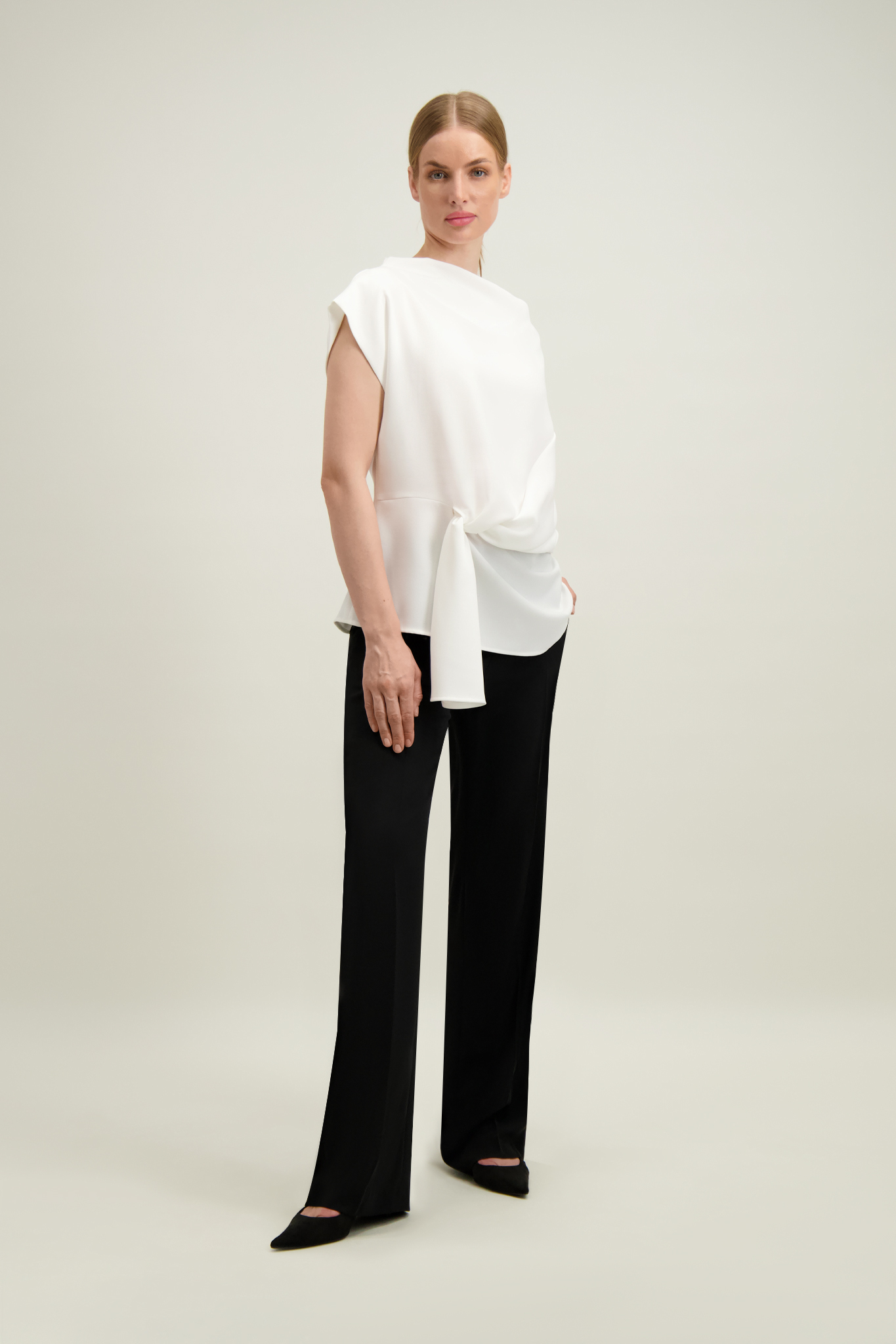 Spodnie z bluzką (57801) z tej samej tkaniny tworzą komplet. Modele można łączyć w zestaw również z wersją ecru - bluzką (57800) oraz spodniami (57796).