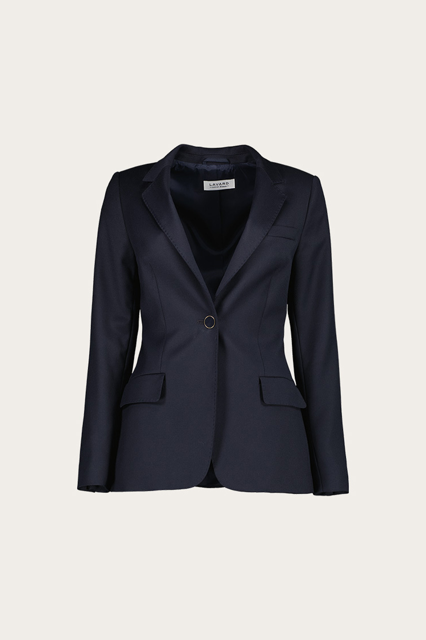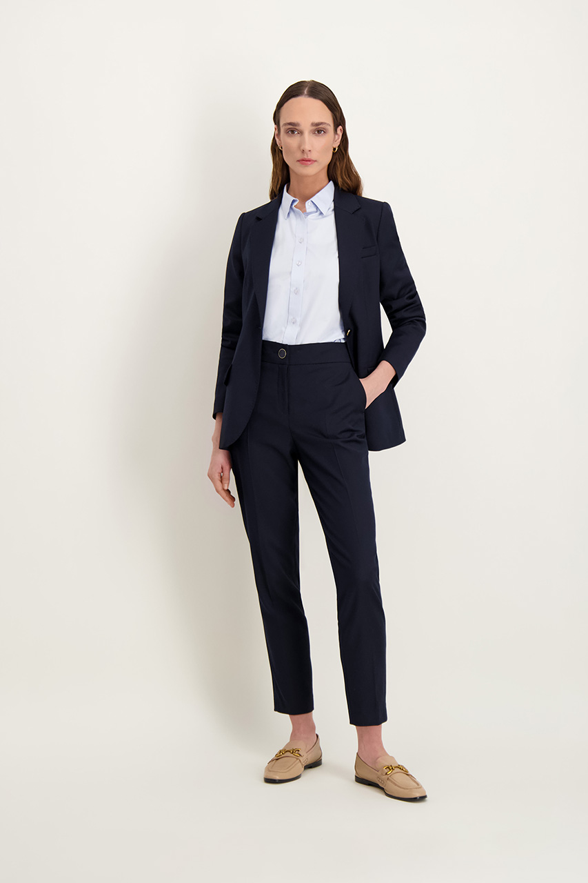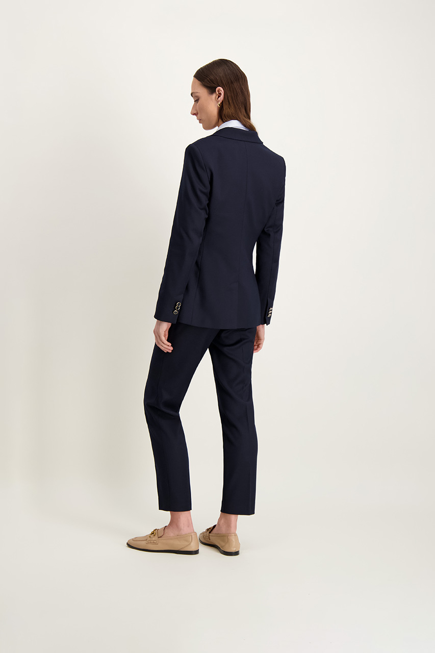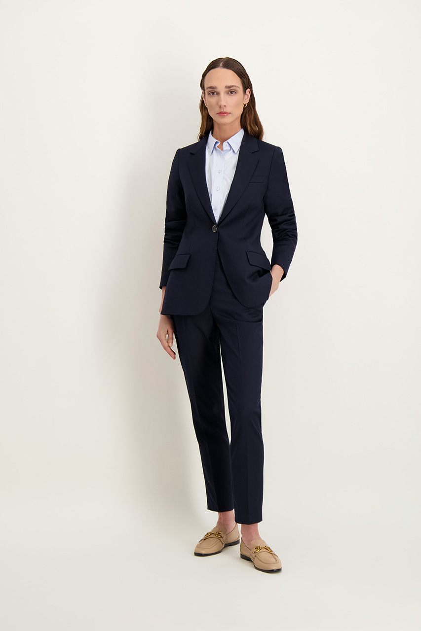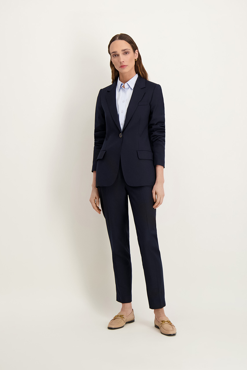 Marynarka taliowana. Uszyta z miękkiej, elastycznej i delikatnie strukturalnej tkaniny pochodzącej z włoskiej tkalni. W marynarce zastosowano elastyczną podszewkę w rękawach. Model posiada dwie kieszenie z patką oraz ozdobny szew AMF wzdłuż krawędzi. Ze spodniami (86396) z tej samej tkaniny tworzy garnitur. Modelka ma 174 cm wzrostu i prezentuje rozmiar 36. Wyprodukowano w Polsce.