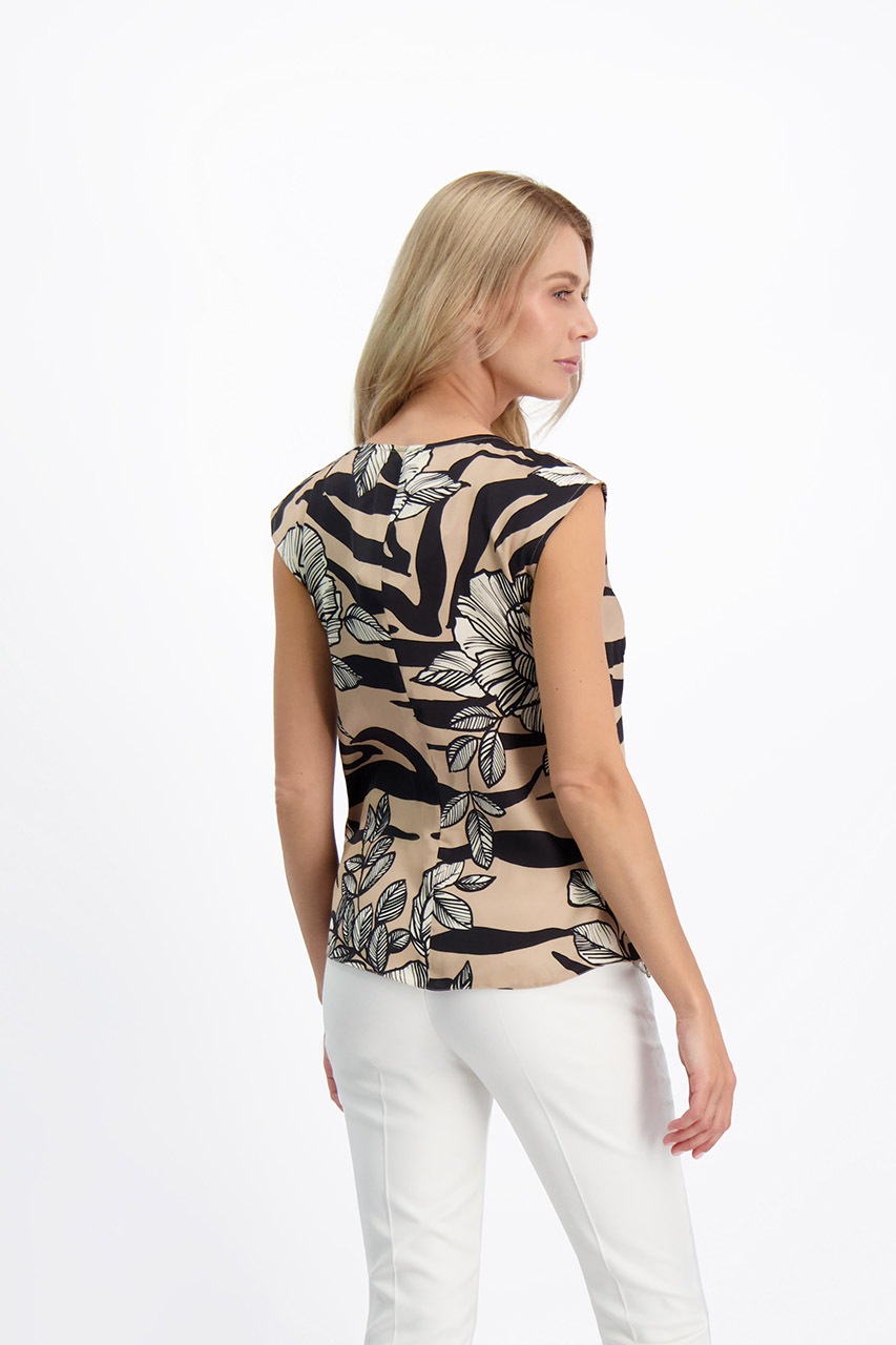 Elegancka bluzka damska uszyta z lekkiej i przewiewnej wiskozy o satynowym chwycie. Model łaczy w sobie ponadczasowe odcienie beżu, czerni i złamanej bieli. Bluzka z dekoltem w szpic, który pięknie podkreśla i wysmukla optycznie szyję. To propozycja, która fenomenalnie prezentuje się z marynarką i spodniami.