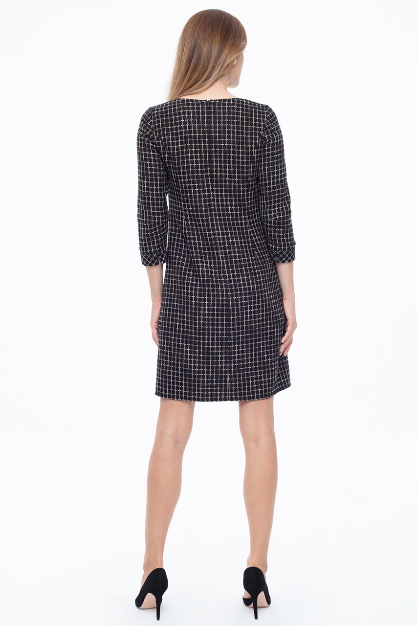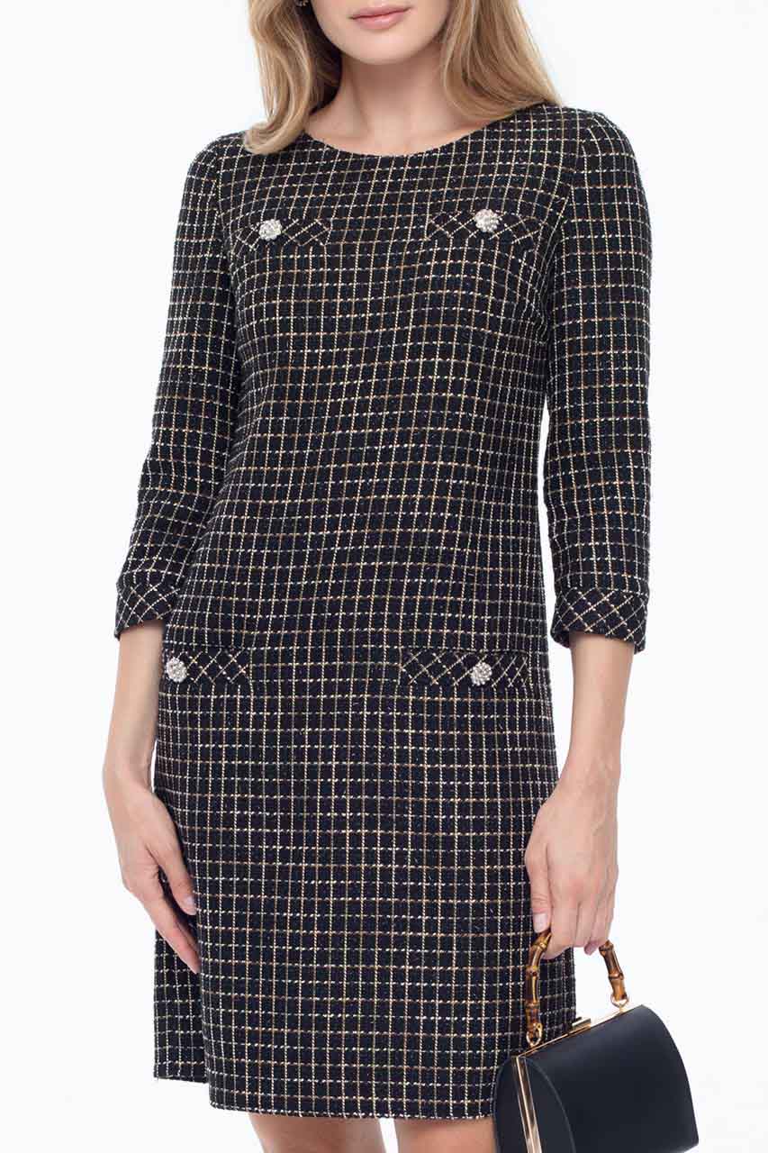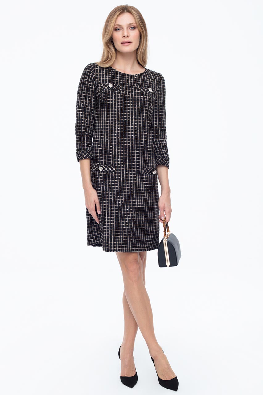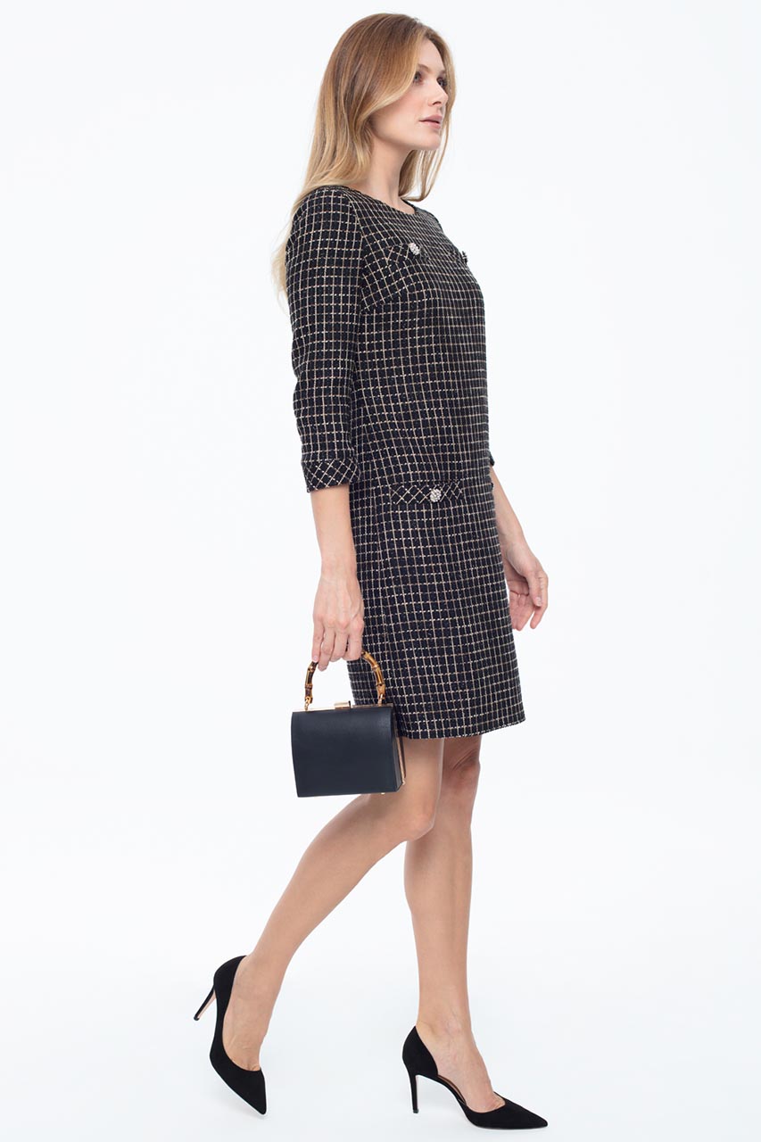 Sukienka damska o pudełkowym fasonie w stylu klasycznej "chanelki" w kratkę. Zdobią ją imitacje kieszeni z biżuteryjnymi guziczkami oraz strukturalna tkanina z połyskującą nitką. Sukienka posiada rękaw 3/4 oraz długość do kolana, która korzystnie wpływa na sylwetkę oraz pozwala zawsze wyglądać elegancko.