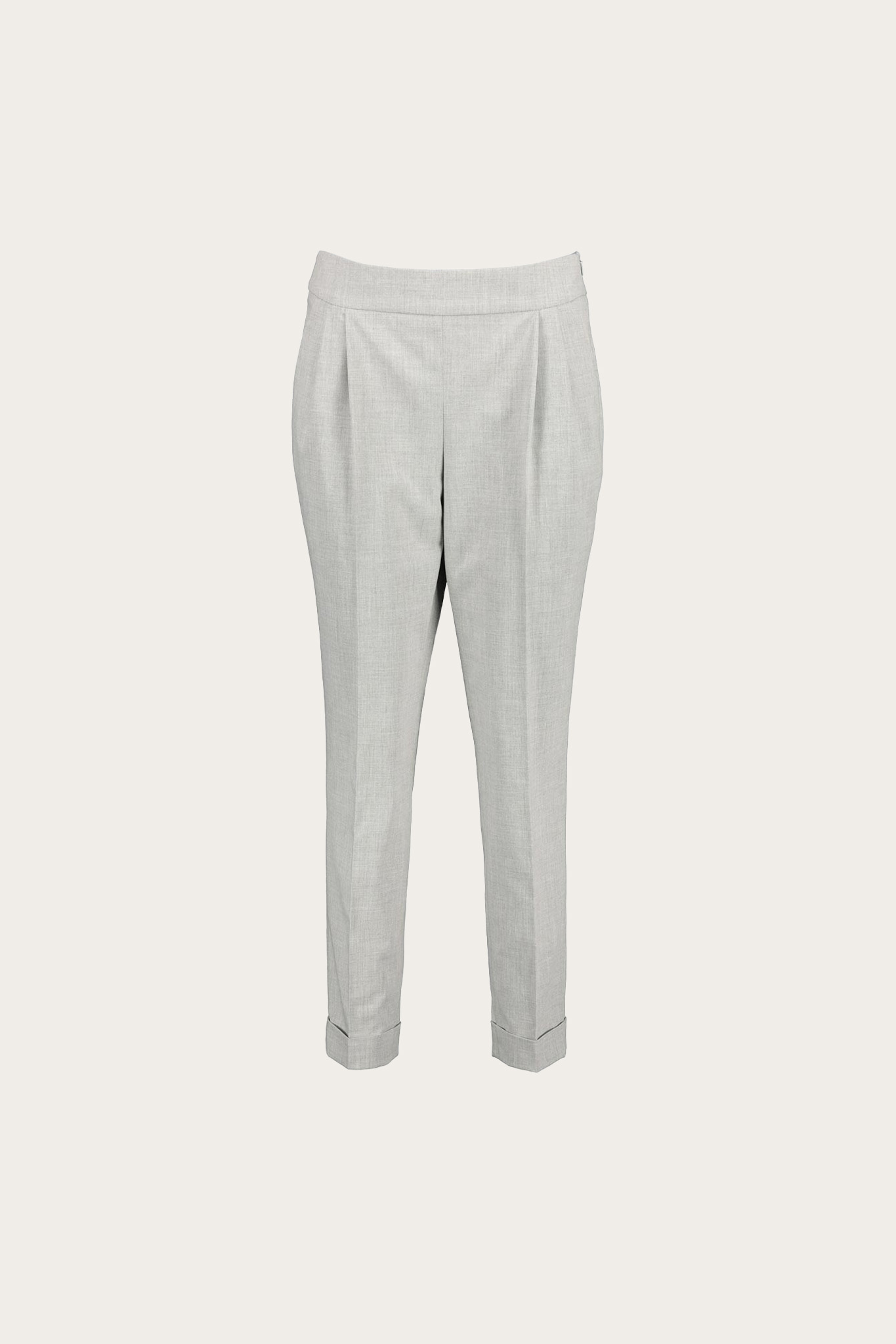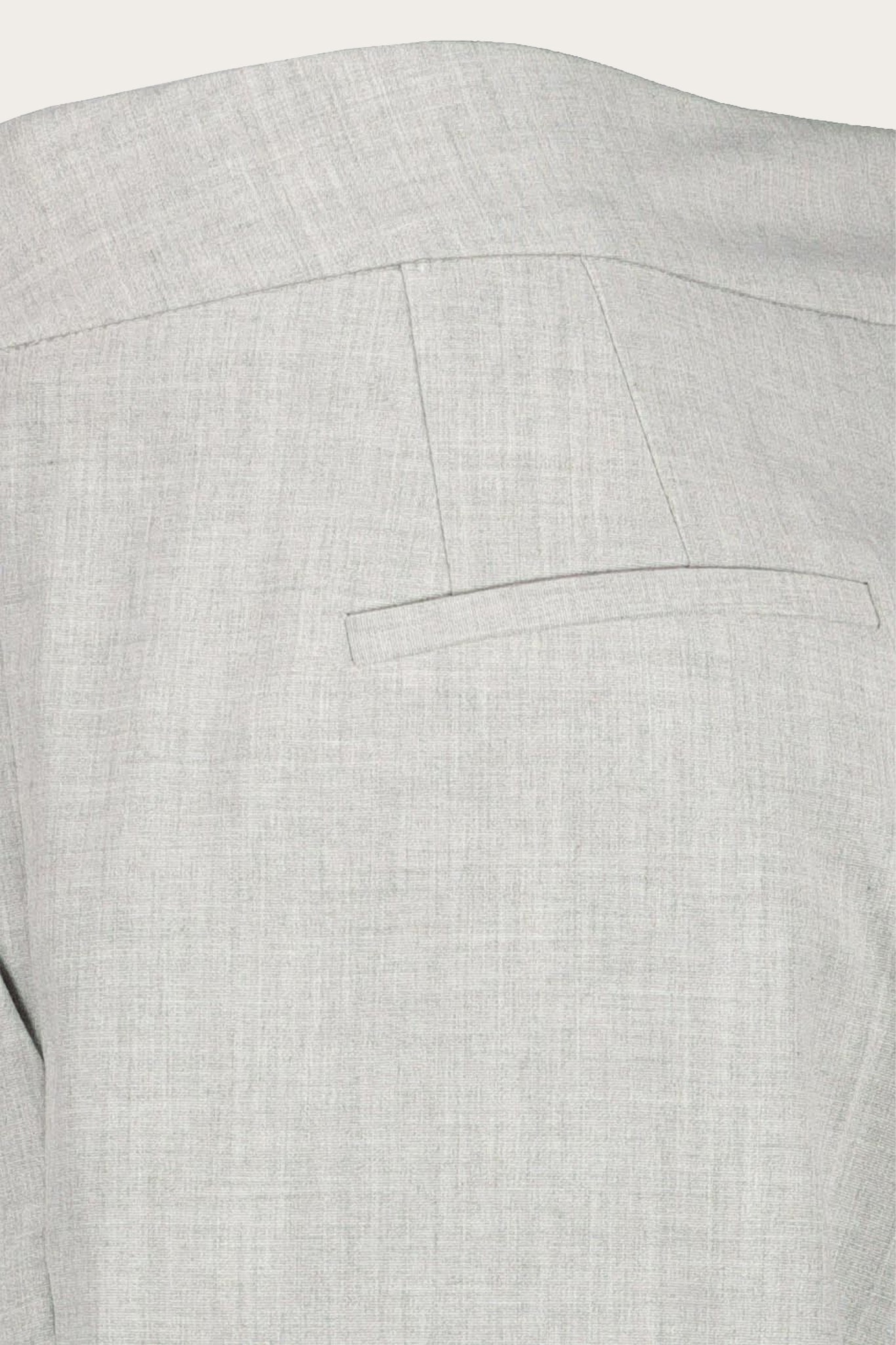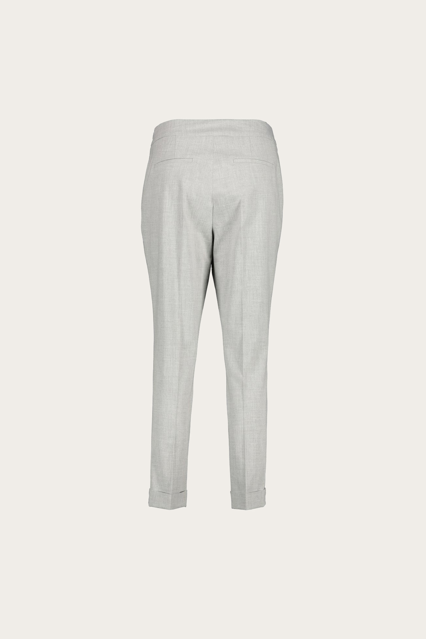Spodnie garniturowe z podwójnymi zakładkami oraz szerokim, gładkim pasem kryjącym. Posiadają zwężane nogawki z mankietami oraz kantem. Spodnie z marynarką z tej samej tkaniny (85438) tworzą garnitur. Modelka ma 170 cm wzrostu. Prezentuje rozmiar 36. Wyprodukowano w Polsce.
