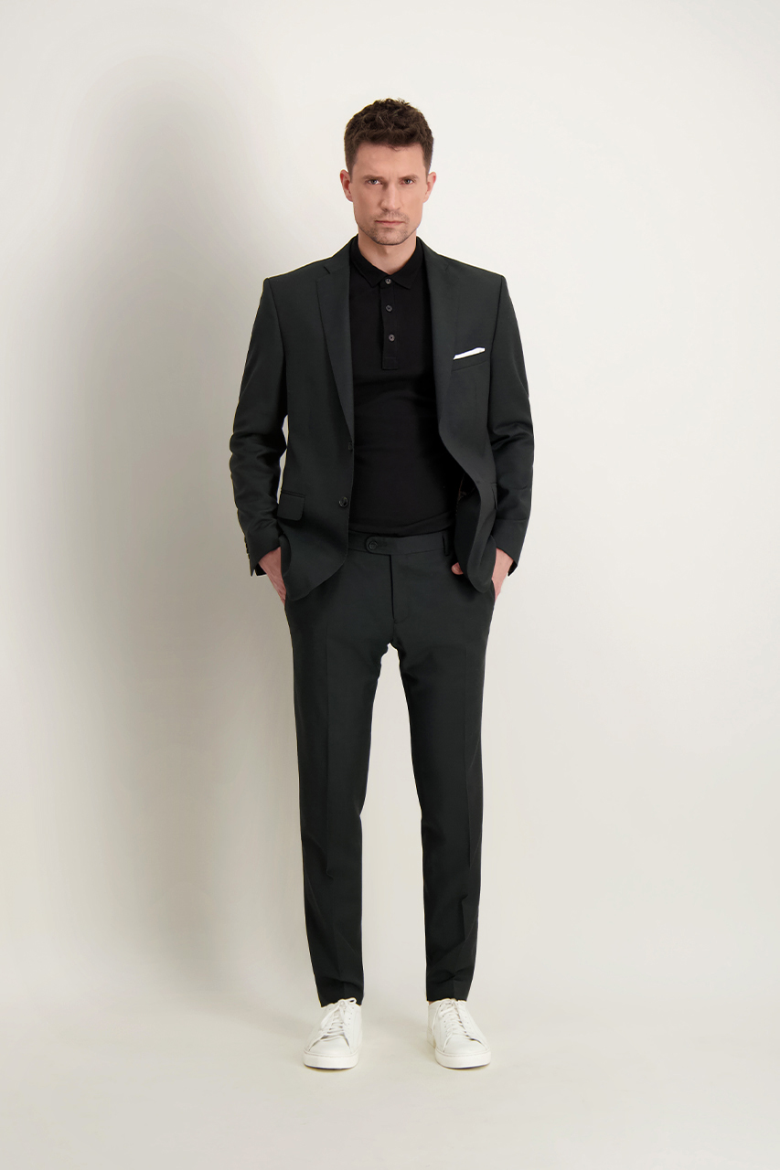 Garnitur w kolorze ciemnej zieleni. Uszyty z wysokiej jakości tkaniny virgin wool 100'S z mikro strukturą. Tkanina pochodzi z włoskiej, renomowanej tkalni Marlane. Garnitur o klasycznym fasonie. Marynarka posiada ozdobny szew AMF wzdłuż krawędzi, nawiązujący do tradycyjnego krawiectwa. Model ma 188 cm wzrostu i prezentuje rozmiar 50. Wyprodukowano w Polsce.