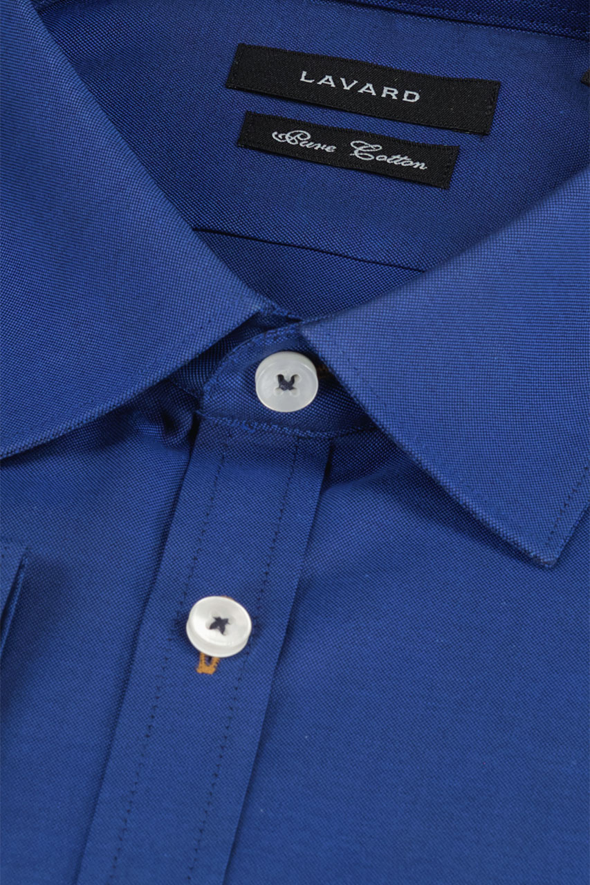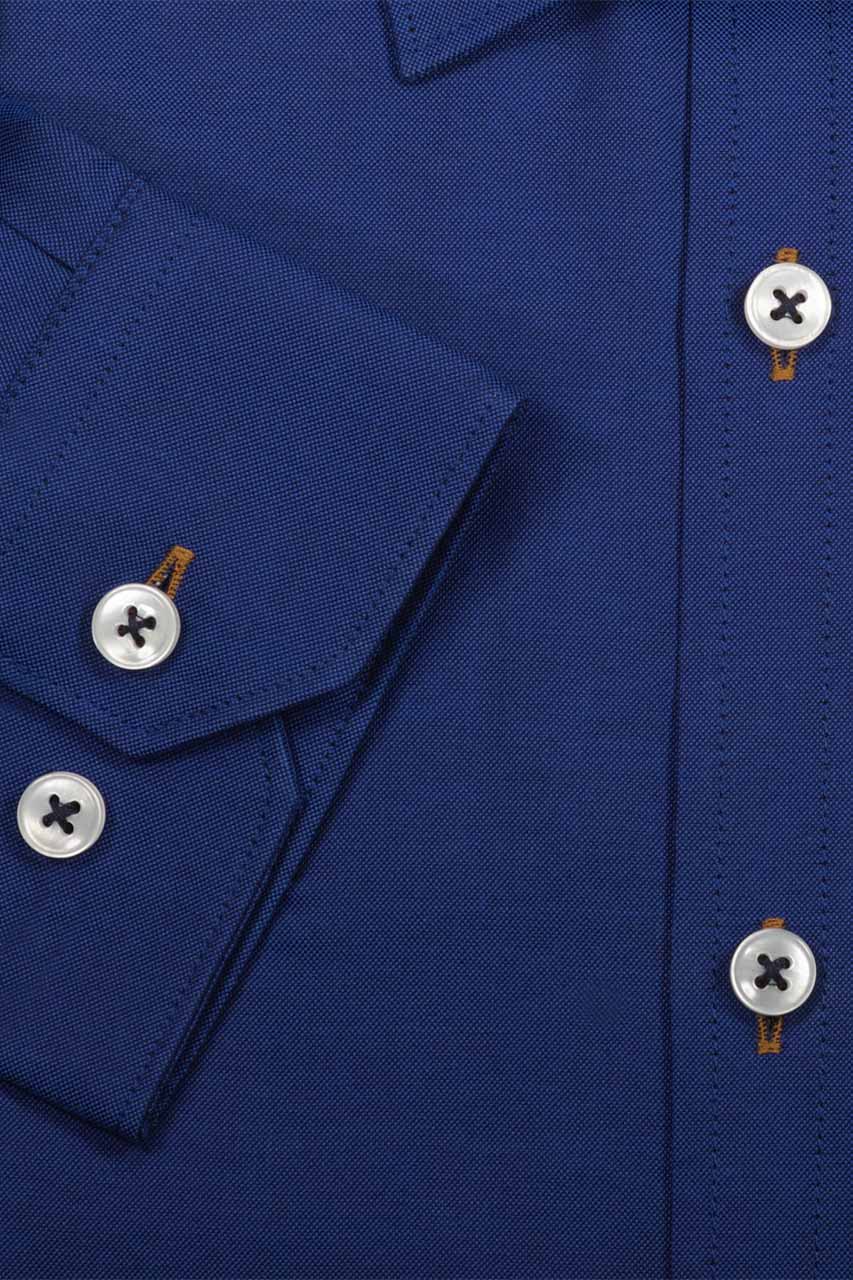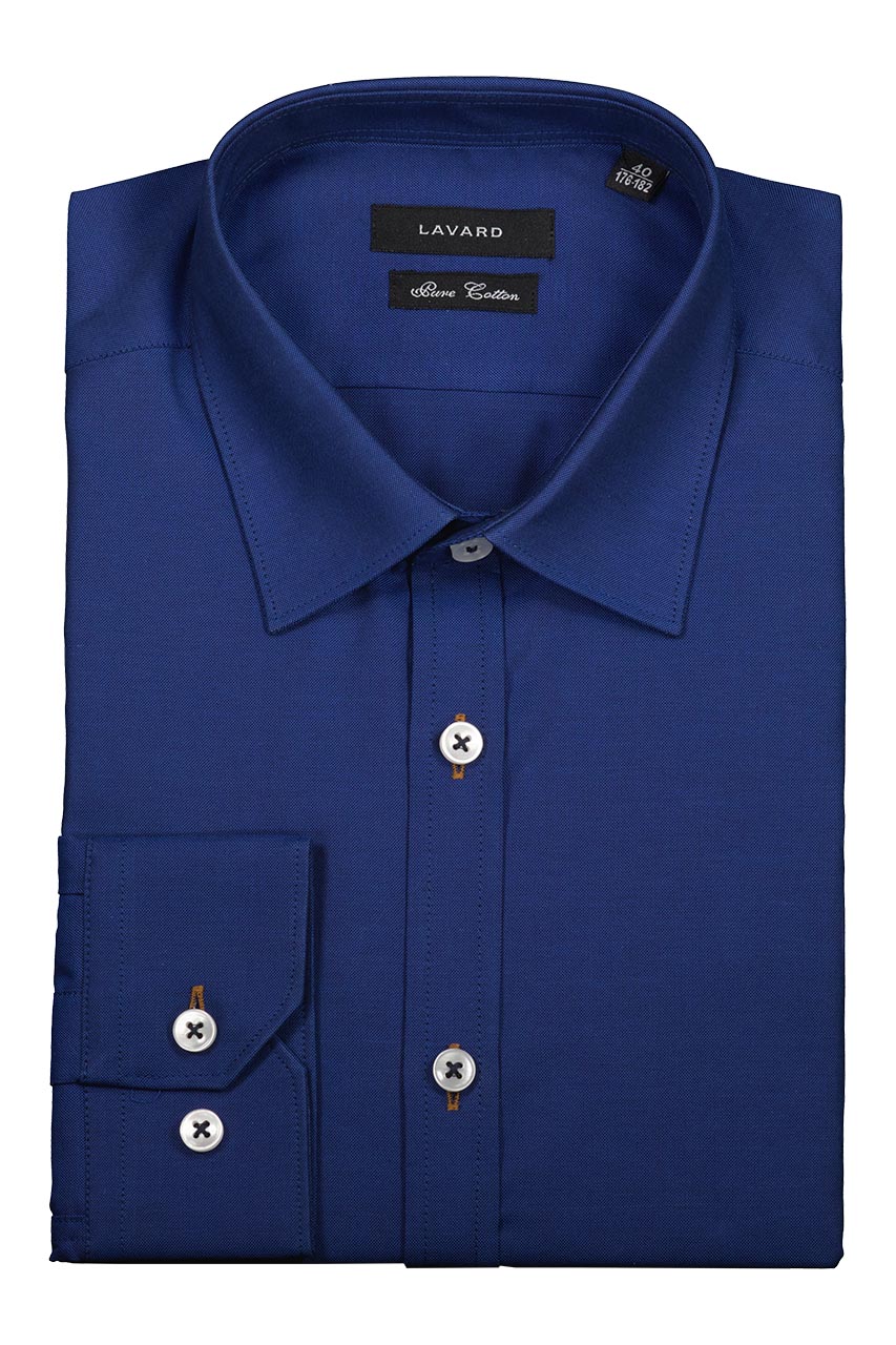 Gładka granatowa koszula męska o taliowanym fasonie slim. Został uszyta z bawełnianej tkaniny o jednolitej strukturze. Posiada tradycyjny kołnierzyk typu Kent oraz długi rękaw. Sprawdzi się zarówno w stylizacjach biznesowych z garniturem, a także w zestawach smart casualowych z jeansami oraz wełnianą marynarką. Jest oryginalną propozycją, która uzupełni kolekcję koszul każdego mężczyzny.