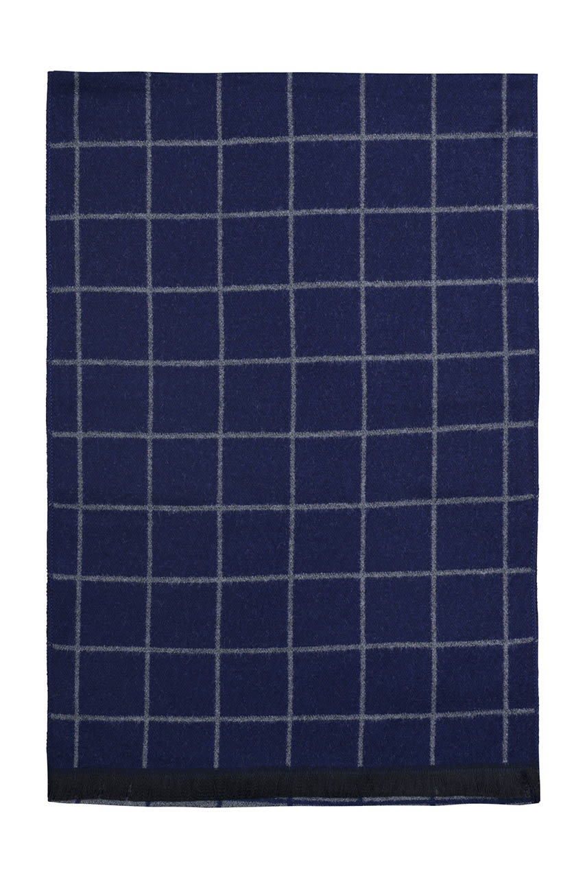 Granatowy, męski szal w kratę. Dwustronny, z drugiej strony dominuje kolor szary. Wykonany z gładkiego i przyjemnego w dotyku materiału. Sprawdzi się idealnie w casualowych, jesienno-zimowych stylizacjach.