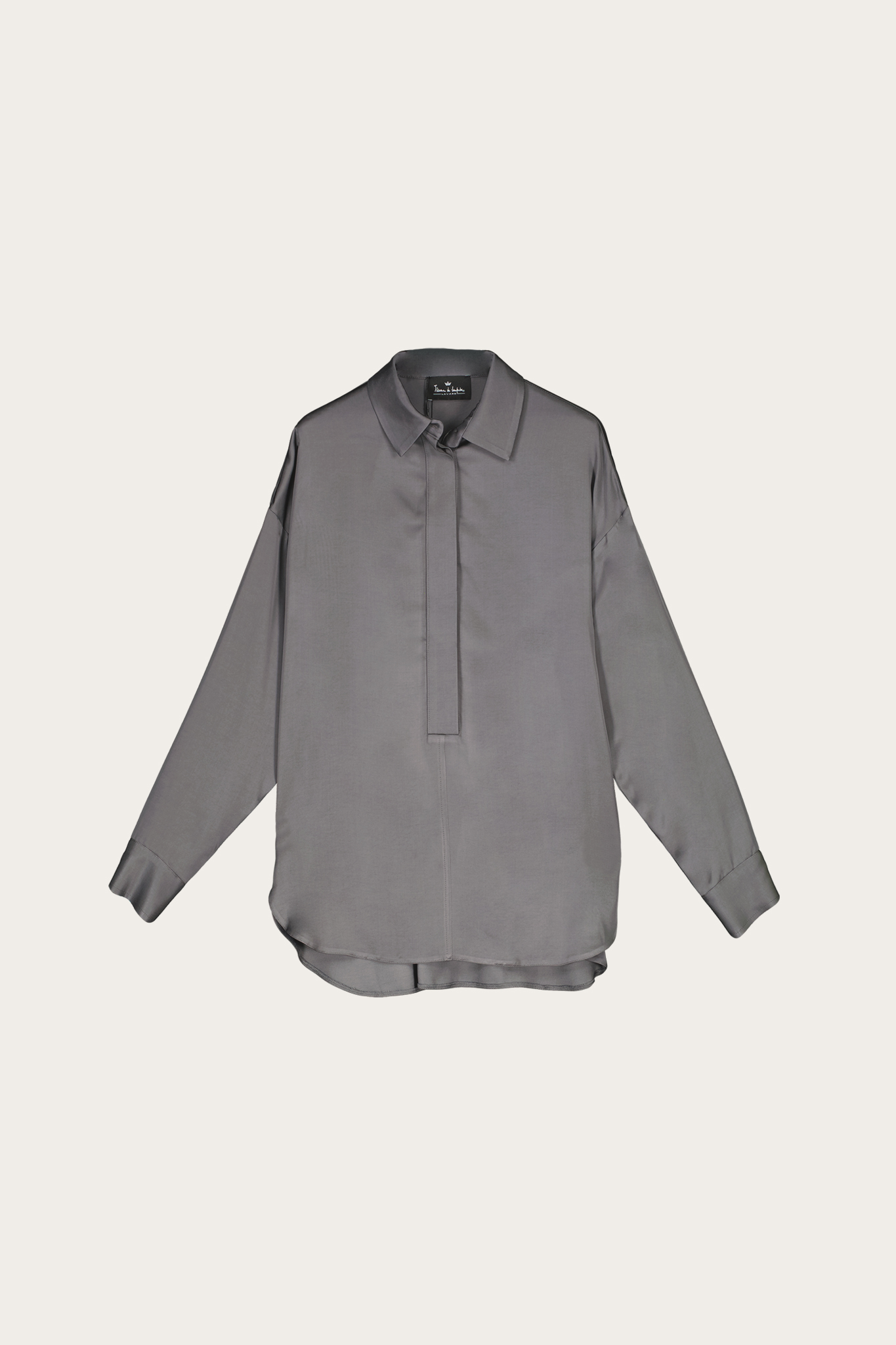 Koszula w kolorze stalowym wykonana z tkaniny satynowej o subtelnym połysku. Posiada kryte zapięcie.