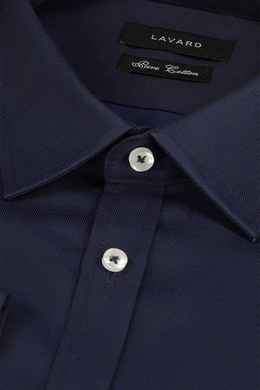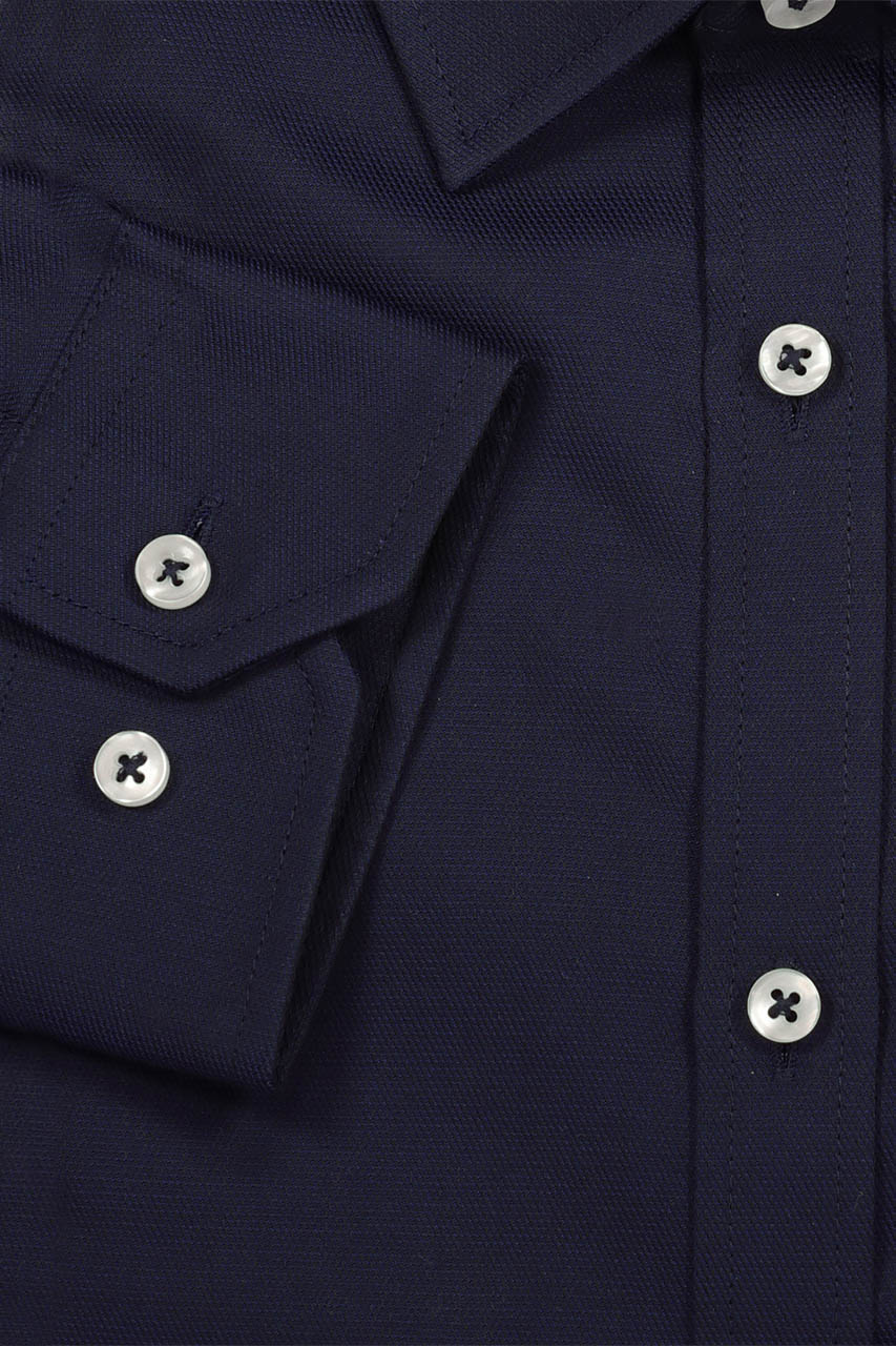 Granatowa koszula męska uszyta z wysokiej jakości bawełny z delikatną strukturą. Propozycja o dopasowanym kroju, doskonale podkreśli męską sylwetkę. Koszula świetnie prezentuje się solo z chinosami jak i z marynarką.