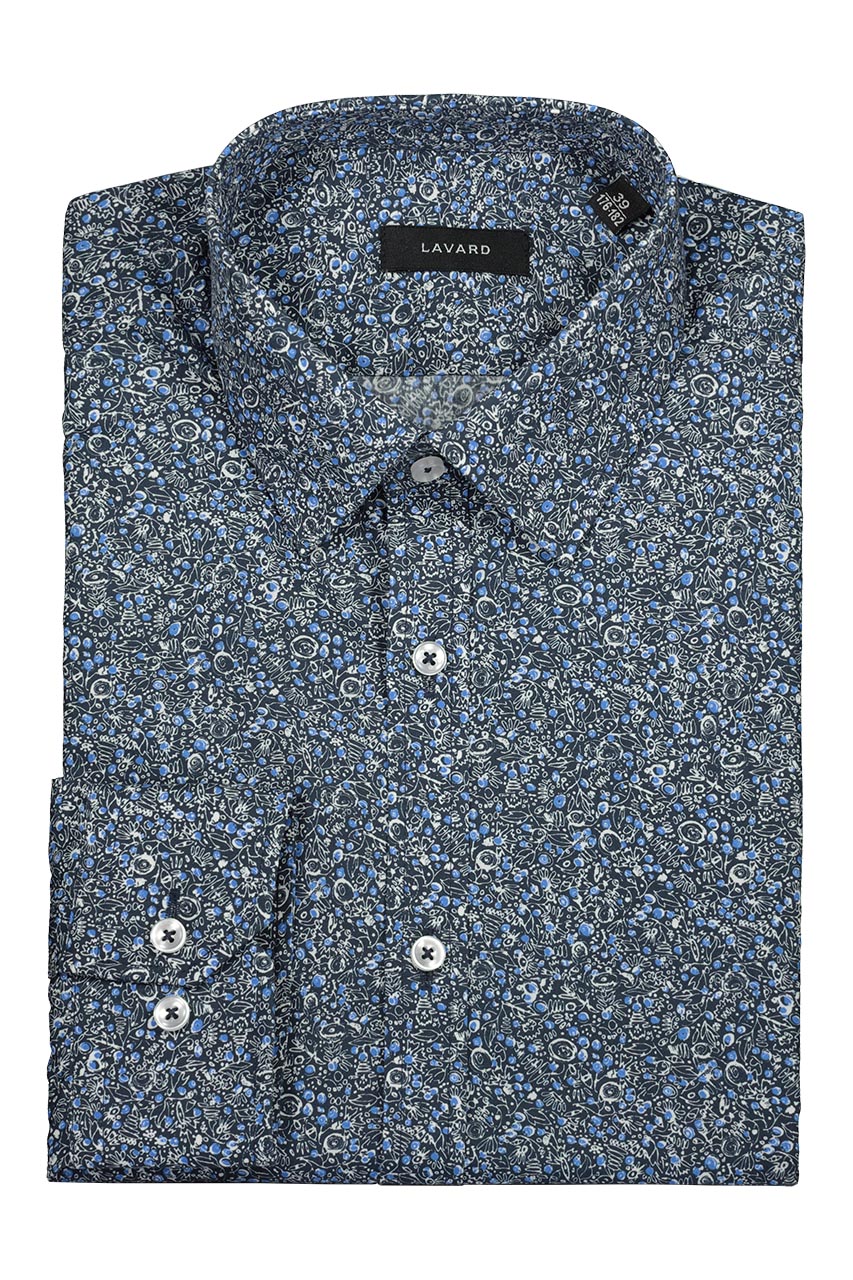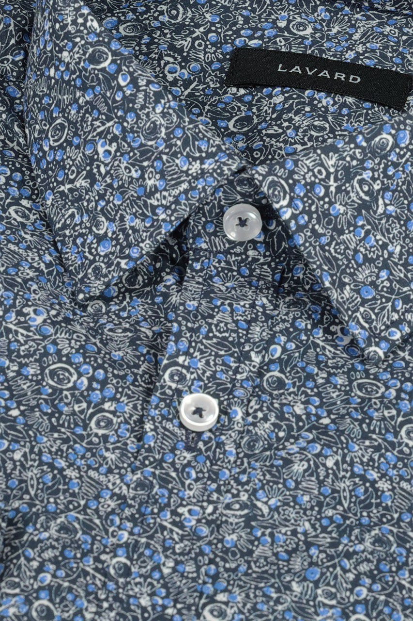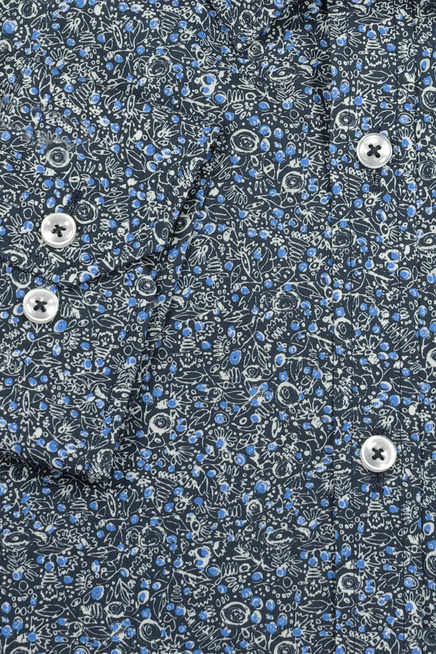 Granatowa koszula we wzory w ponadczasowych odcieniach granatu i bieli. Model wykonany z wysokiej jakości bawełny. Naturalna tkanina zapewnia bardzo wysoki komfort użytkowania. Koszula o modnym, dopasowanym kroju, pięknie podkreśla atuty sylwetki. Propozycja świetnie spisuje się w casualowych zestawieniach.