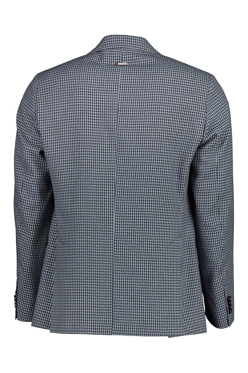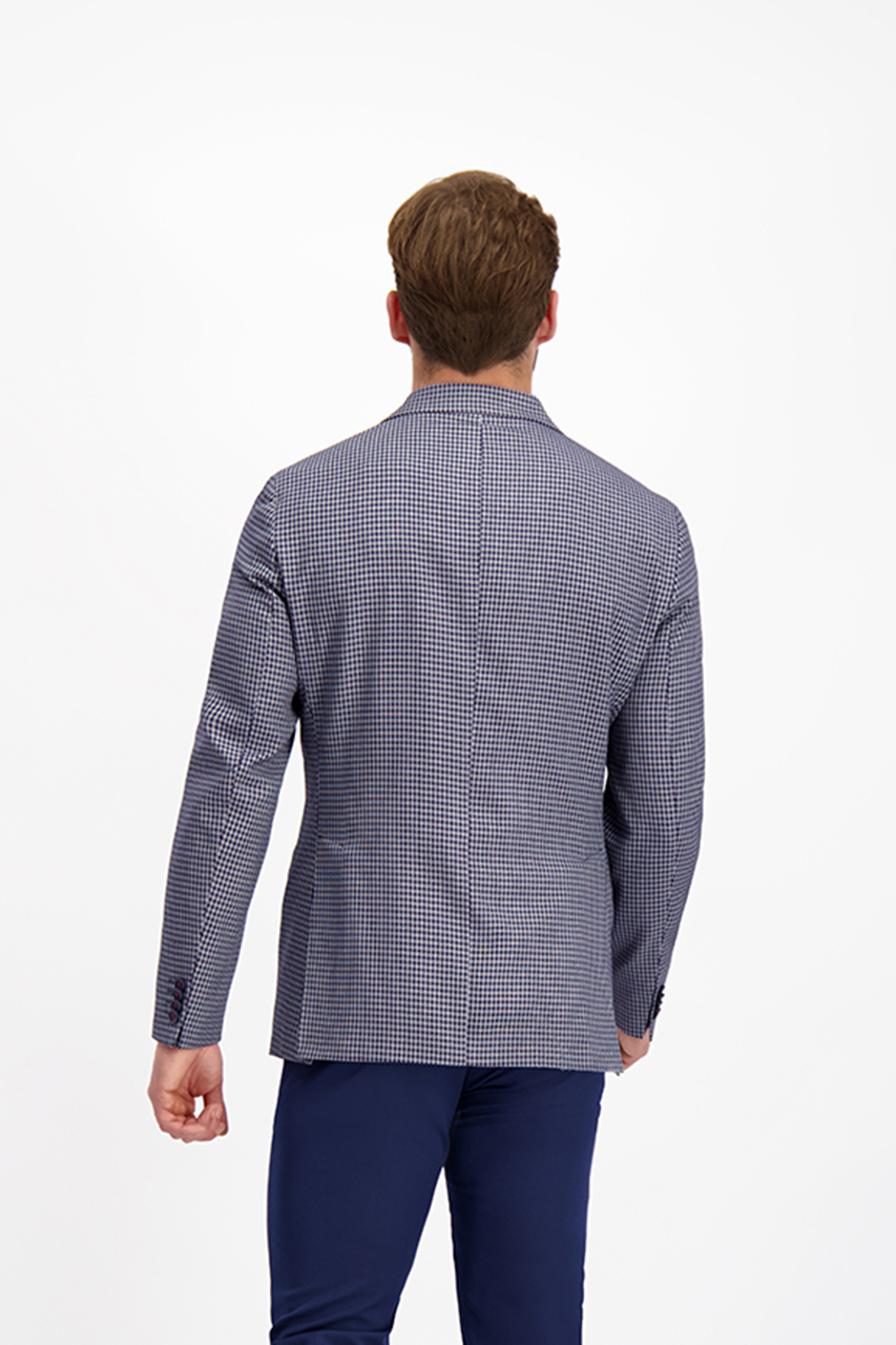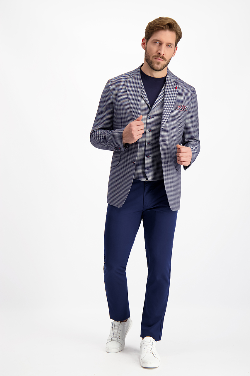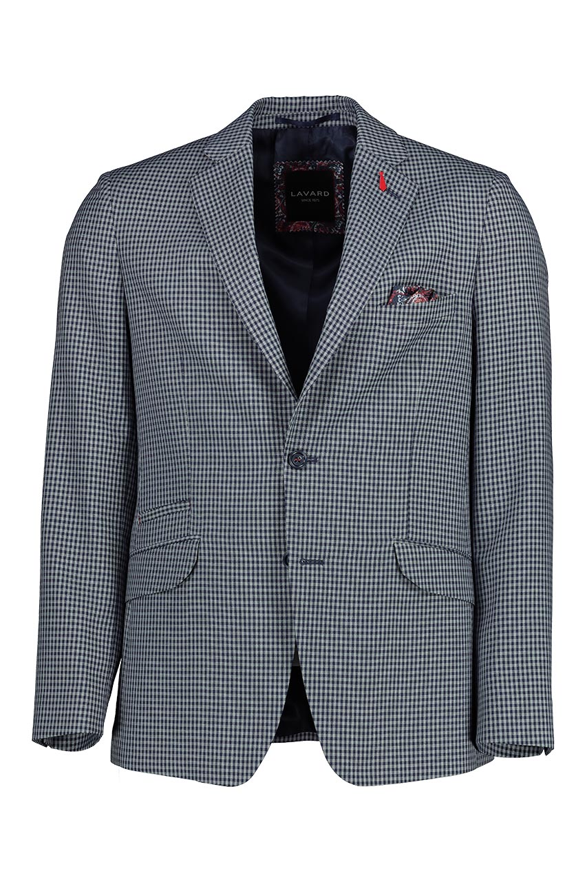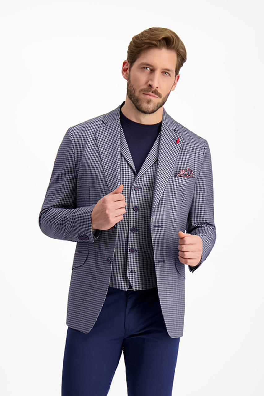 Casualowa marynarka męska wykonana w granatowej tonacji we wzór drobnej kraty. Uszyta z przyjemnego w dotyku materiału. Posiada szersze klapy oraz dwa rozcięcia z tyłu. Dwie kieszenie cięte z asymetryczną patką i zegarówka, oraz brustasza z wzorzystym workiem kieszeniowym. Dodatkowo ozdobny czerwony pin w kształcie krawata. Model fantastycznie urozmaici miejskie stylizacje. Świetnie prezentuje się zarówno z białą koszulą i spodniami typu chino jak i z jeansami i koszulką polo.