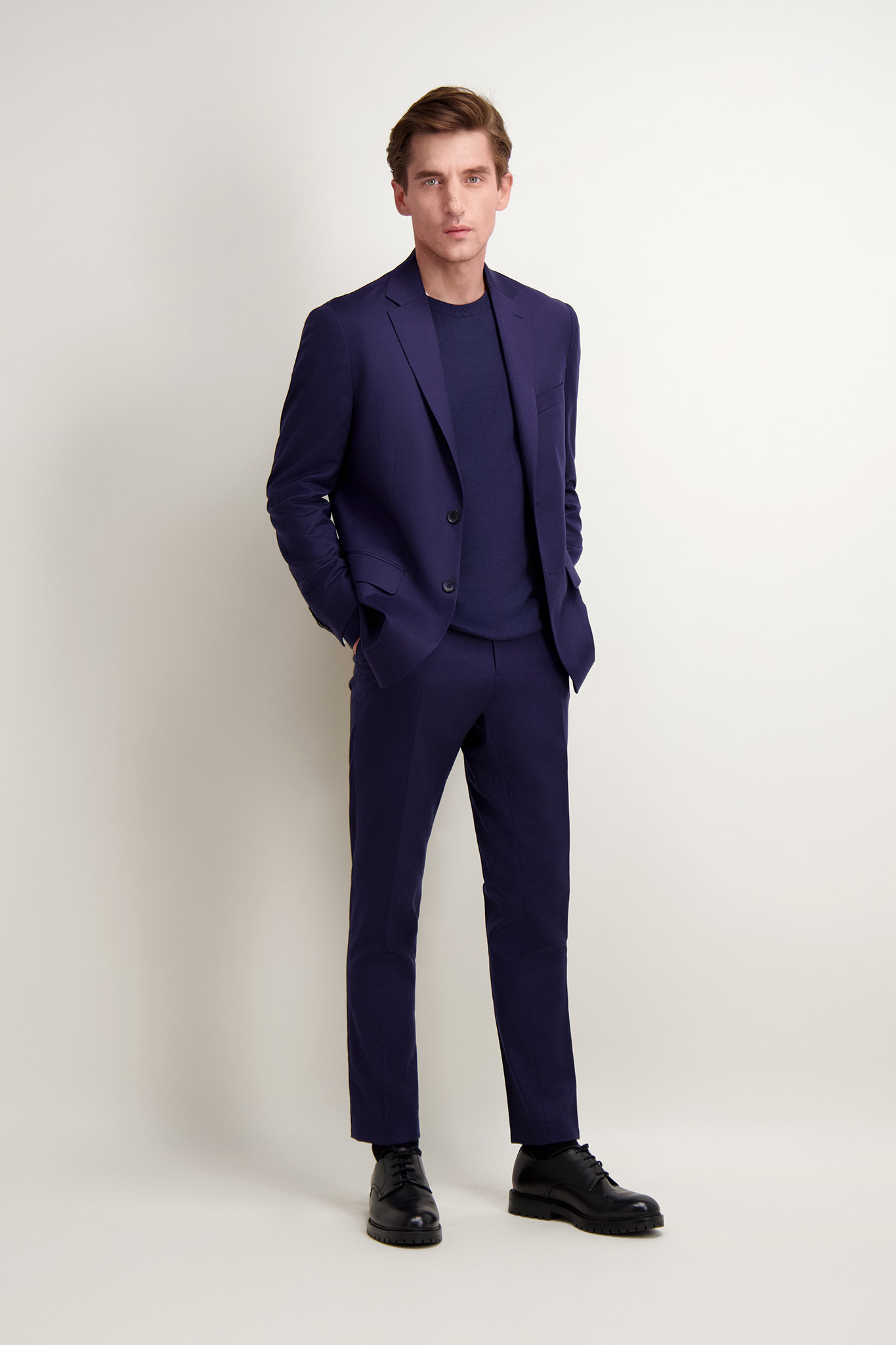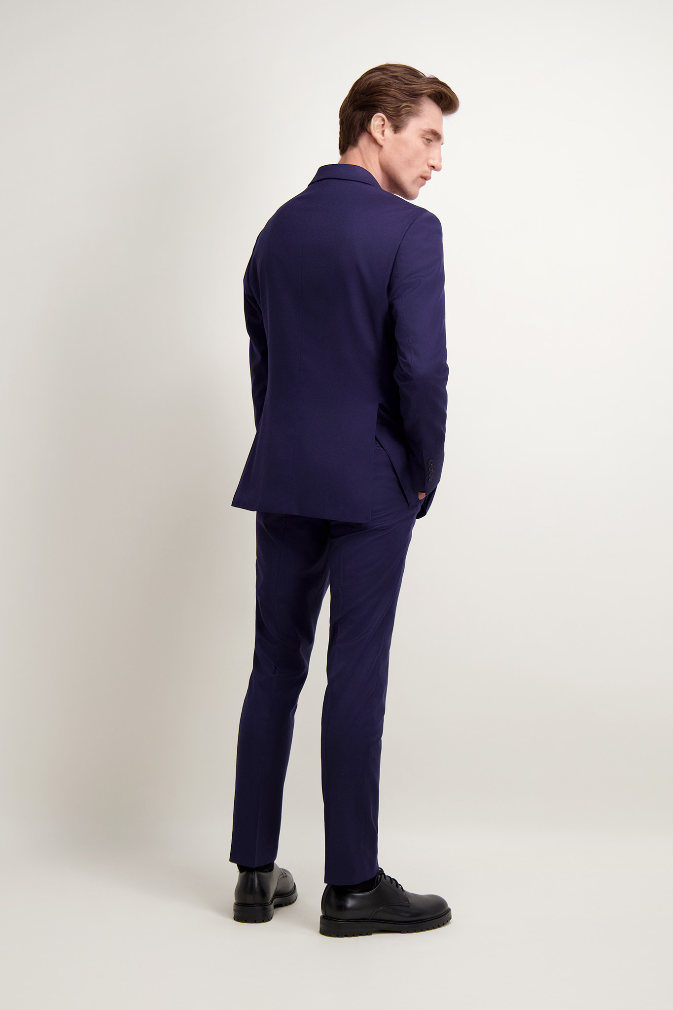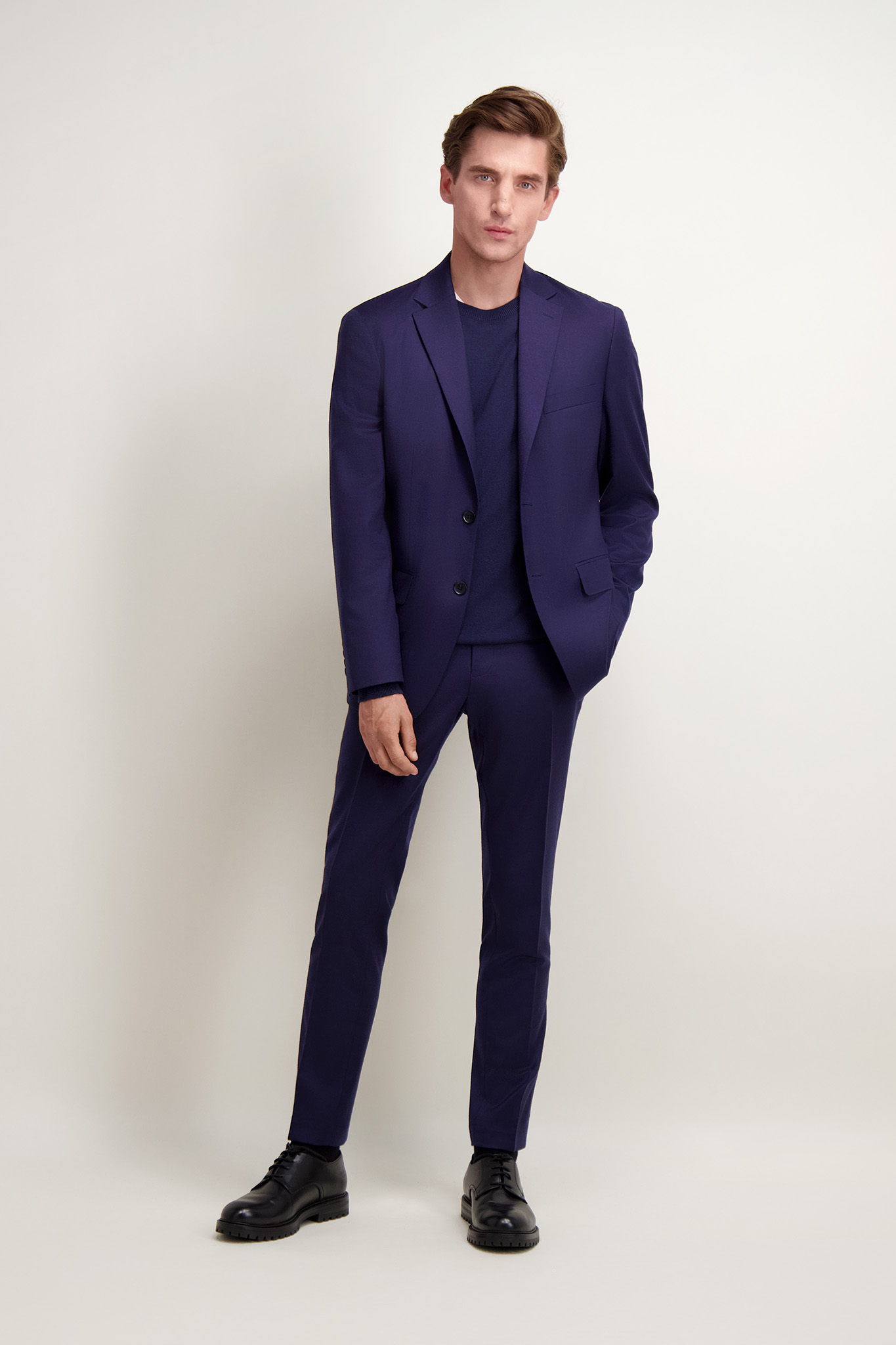 Elegancka granatowa marynarka męska o klasycznym, jednorzędowym kroju. Uszyta z wysokiej jakości tkaniny wełnianej z domieszką elastanu. Idealnie sprawdzi się zarówno w formalnych, jak i półformalnych stylizacjach. Posiada otwarte klapy, kieszenie z patkami. Jej ponadczasowy fason oraz dopracowane detale czynią ją doskonałym wyborem na każdą okazję. Ze spodniami (66416) tworzy garnitur.