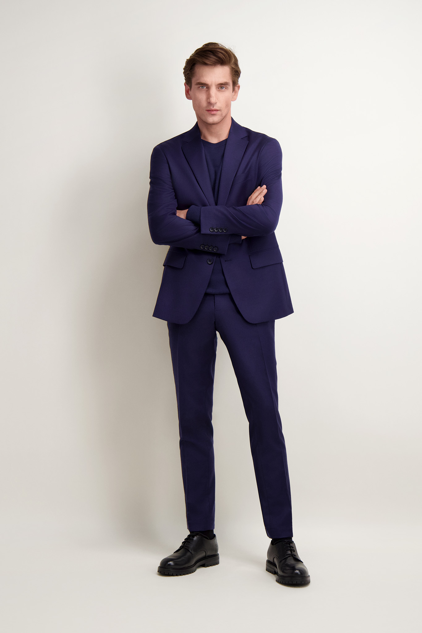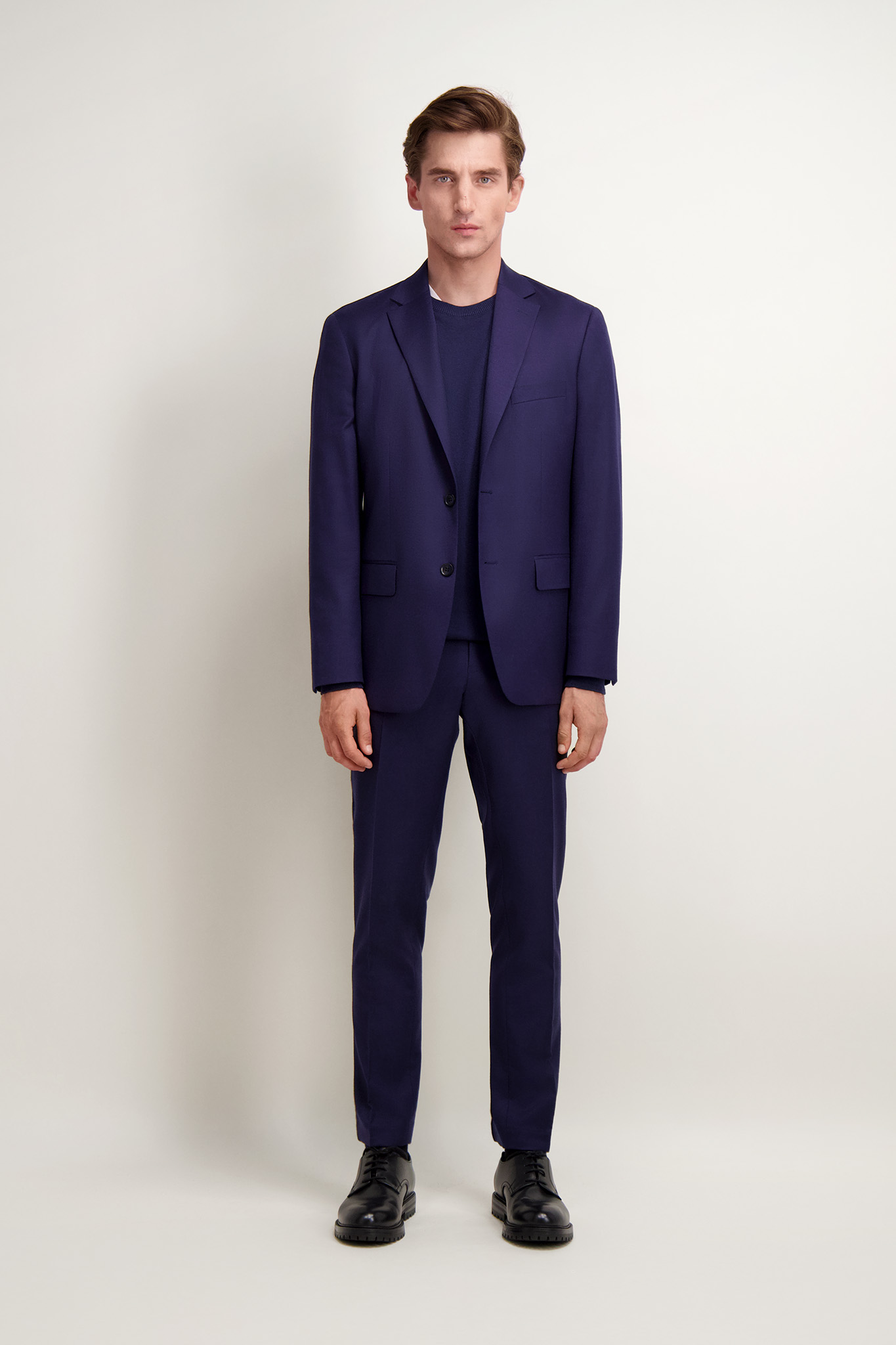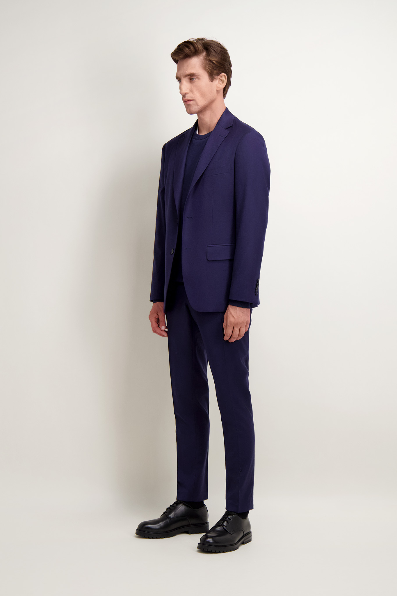 Elegancka granatowa marynarka męska o klasycznym, jednorzędowym kroju. Uszyta z wysokiej jakości tkaniny wełnianej z domieszką elastanu. Idealnie sprawdzi się zarówno w formalnych, jak i półformalnych stylizacjach. Posiada otwarte klapy, kieszenie z patkami. Jej ponadczasowy fason oraz dopracowane detale czynią ją doskonałym wyborem na każdą okazję. Ze spodniami (66416) tworzy garnitur.