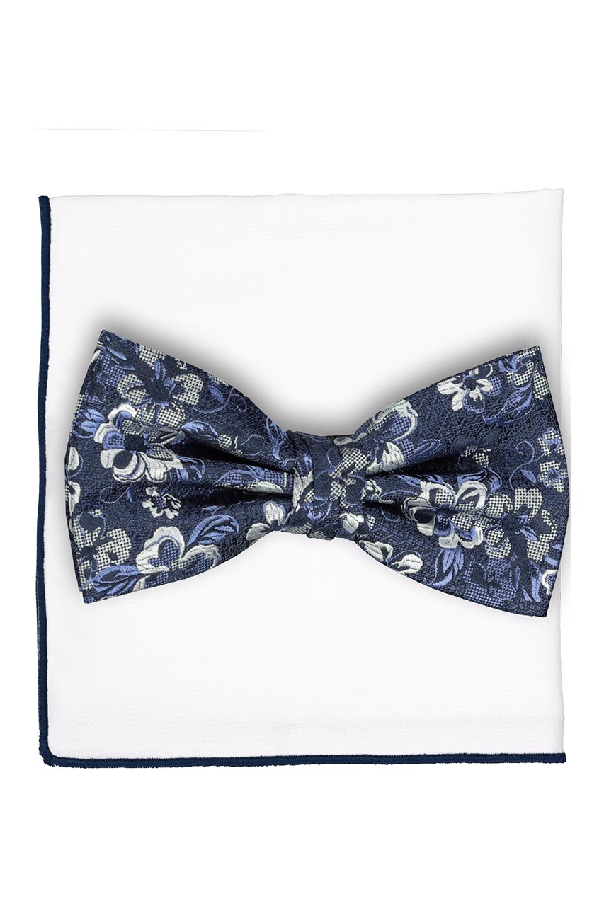 Granatowa mucha w niebieskie kwiaty. Piękny model z lekkim połyskiem. Posiada wygodną regulację. Fantastycznie prezentuje się zarówno z koszulą i kamizelką jak i z eleganckim garniturem.