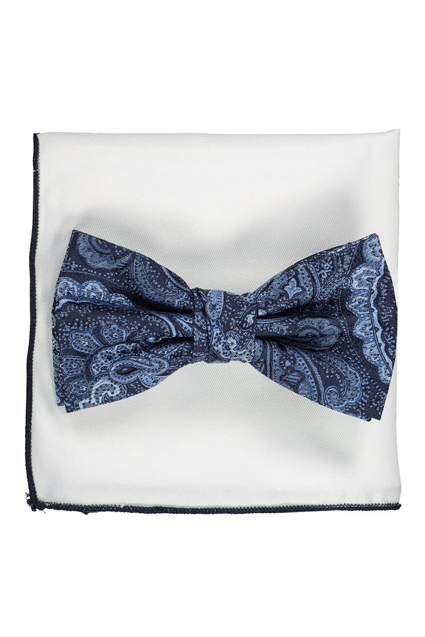 Granatowa mucha w wzór paisley. Piękny, wzorzysty model, który sprawdzi się zarówno z garniturem jak i z casualową marynarką. Posiada wygodną regulację z tyłu na guziki. W zestawie poszetka w białym kolorze.