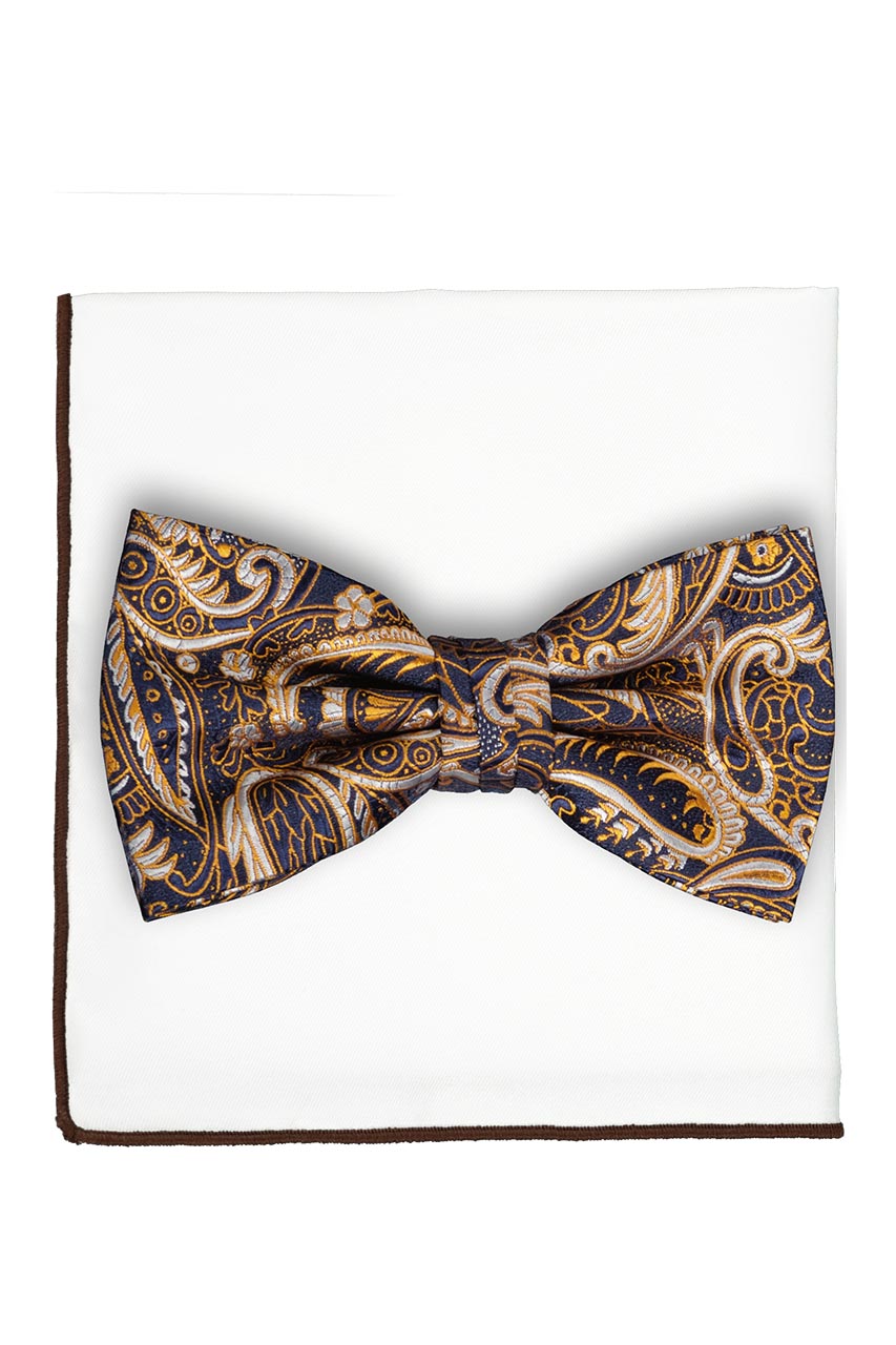Granatowa mucha ze wzorem w kolorze camelu i chłodnego beżu. Mucha posiada wygodną regulację z tyłu, dzięki temu możemy idealnie ją dopasowawać. Mucha będzie świetnym dodatkiem do eleganckich i smart casualowych zestawień.