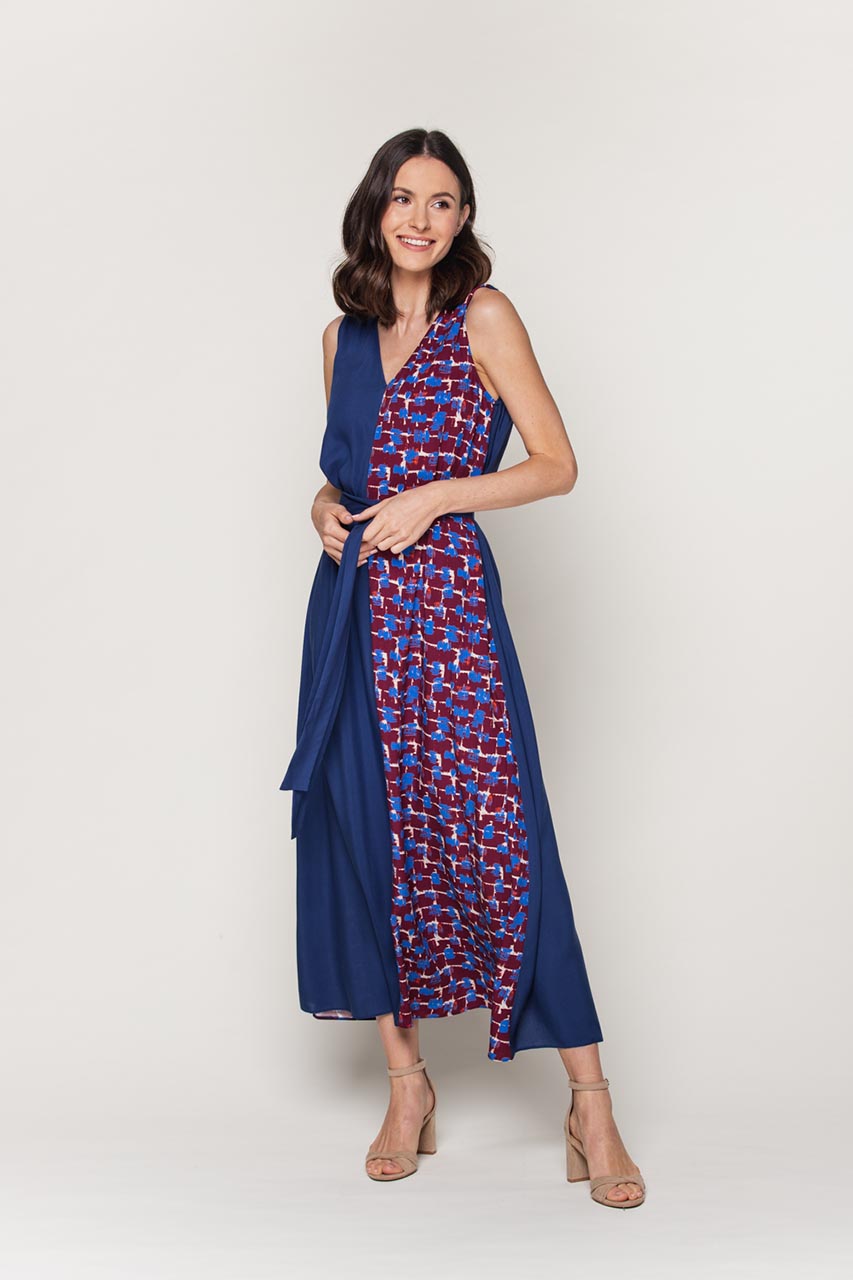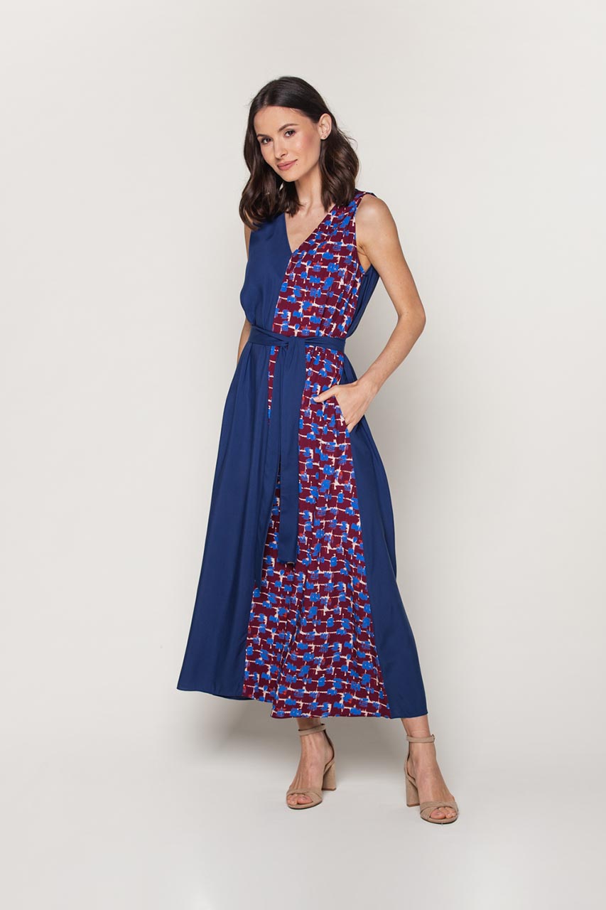 Granatowa sukienka z oryginalnym wzorem, który z pewnością zwróci uwagę i wyróżni w tłumie. Model uszyty z lekkiej i zwiewnej wiskozy, co znacznie podnosi komfort użytkowania zwłaszcza podczas letnich dni. Model z szarfą, która pięknie zaznaczy talię. Dodatkowo, dekolt v-neck optycznie wydłuży szyję i podkreśli dekolt. Model pięknie prezentuje się na każdego typu sylwetce. Modelka ma 176 cm wzrostu i ma na sobie rozmiar 36.