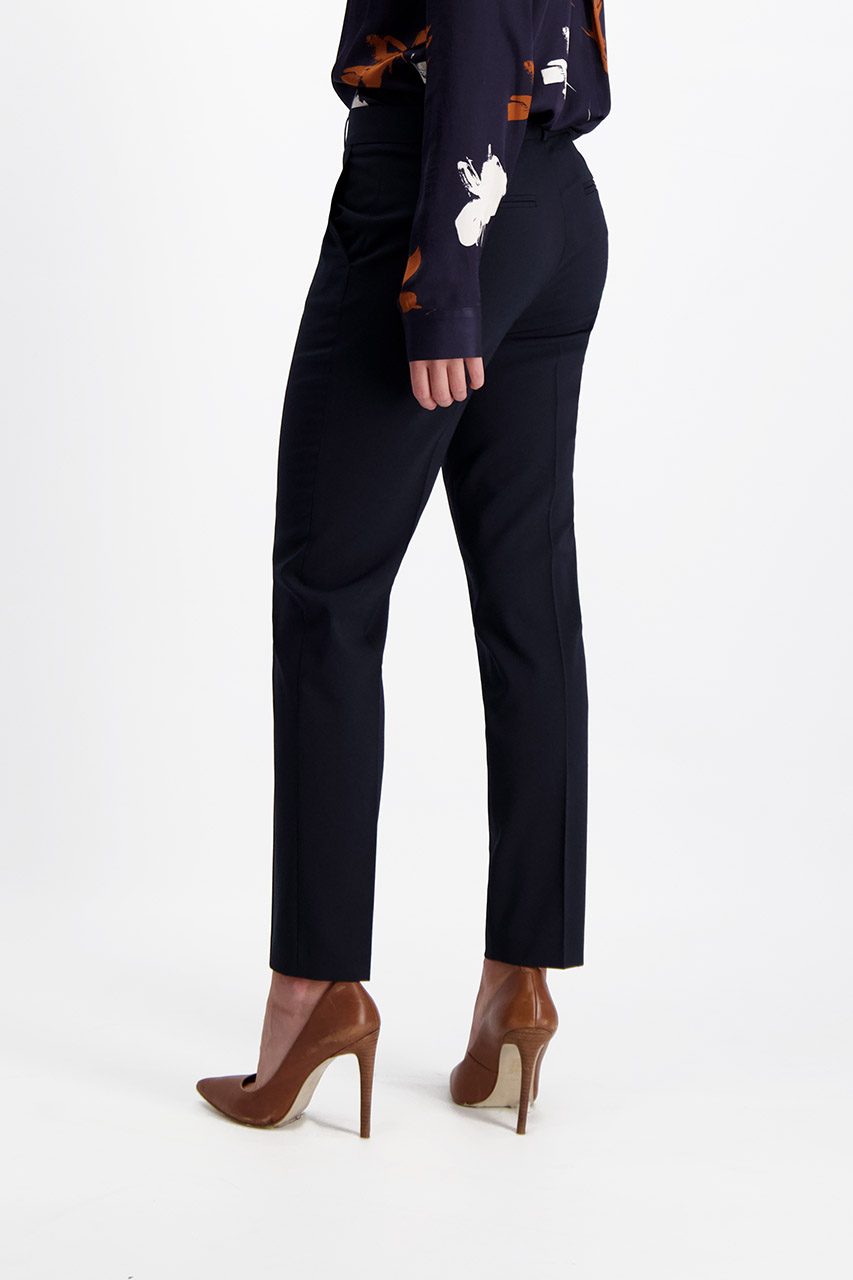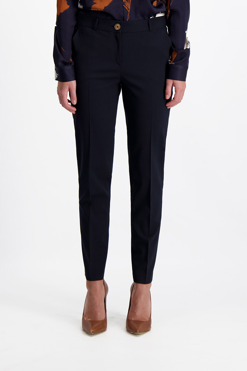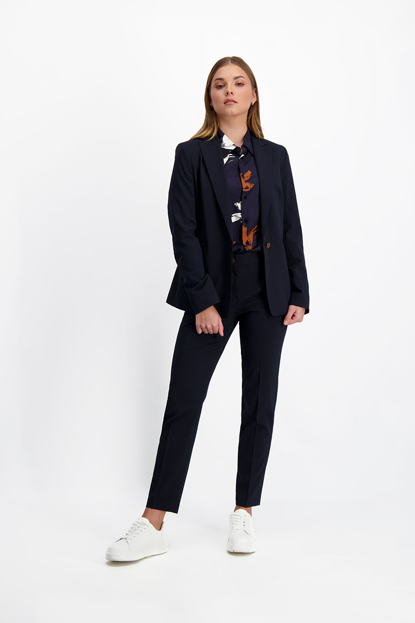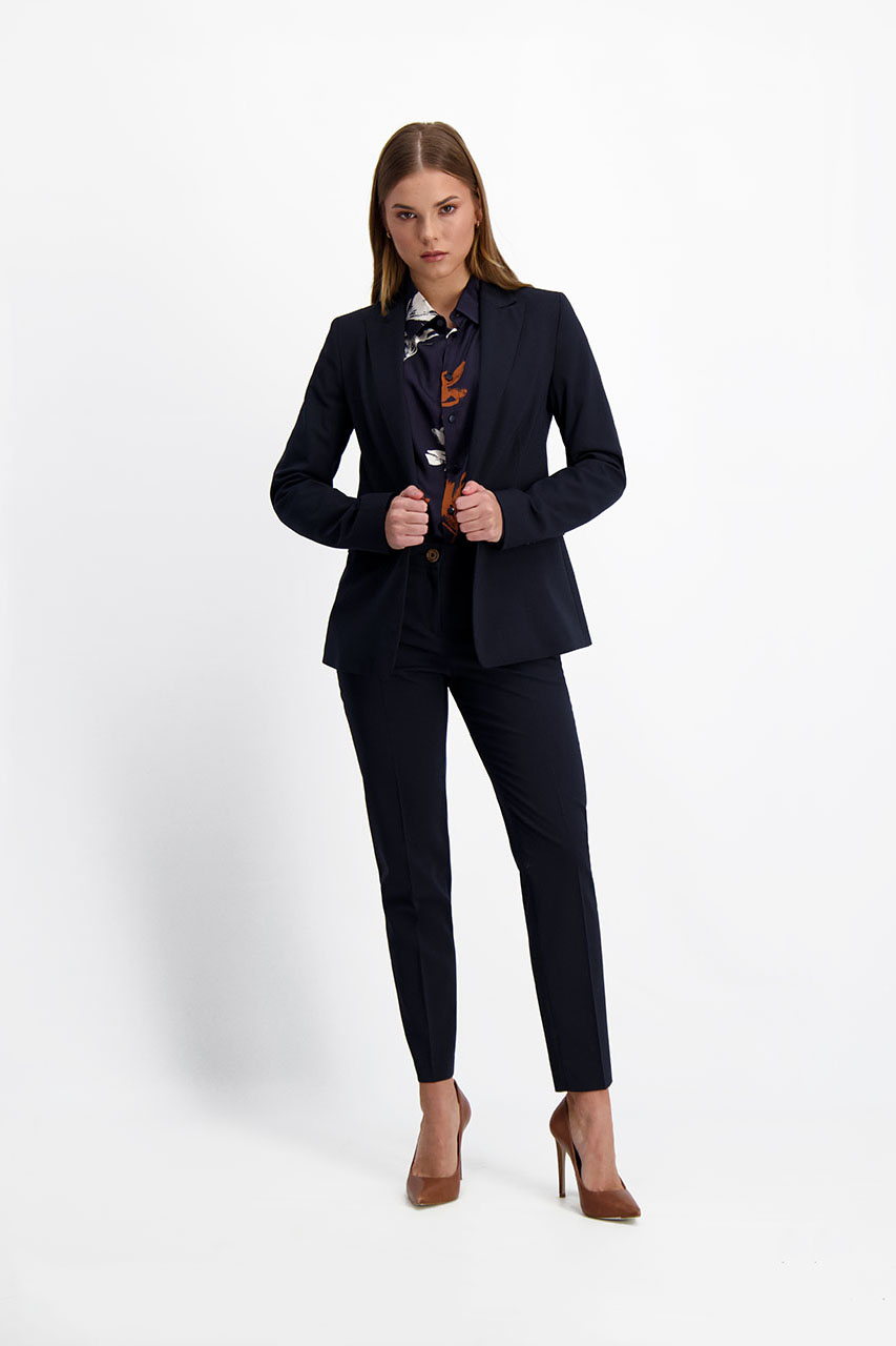 Cygaretki damskie w granatowym odcieniu to fason spodni, który jest jednym z najbardziej eleganckich, a zarazem ponadczasowych propozycji. Oferowany model został uszyty z miękkiej tkaniny o znacznej zawartości wiskozy. Posiada zwężane nogawki, które doskonale eksponują atuty kobiecej sylwetki. Cięte kieszenie i pas zapinany na guzik to elementy, które w subtelny sposób nawiązują do dedykowanej marynarki. Spodnie w granatowym odcieniu sprawdzą się w każdej sytuacji – z białą koszulą i marynarką stworzą klasyczny zestaw do pracy. Można je także ciekawie skomponować w zestawie o nieco bardziej casualowym charakterze, na przykład z kardiganem, t-shirtem oraz mokasynami. Ich fason oraz kolor pozwala na tworzenie rozmaitych stylizacji, które będą prezentować się szykownie na każdej kobiecej sylwetce. Modelka ma 171 cm wzrostu. Prezentuje rozmiar 36.