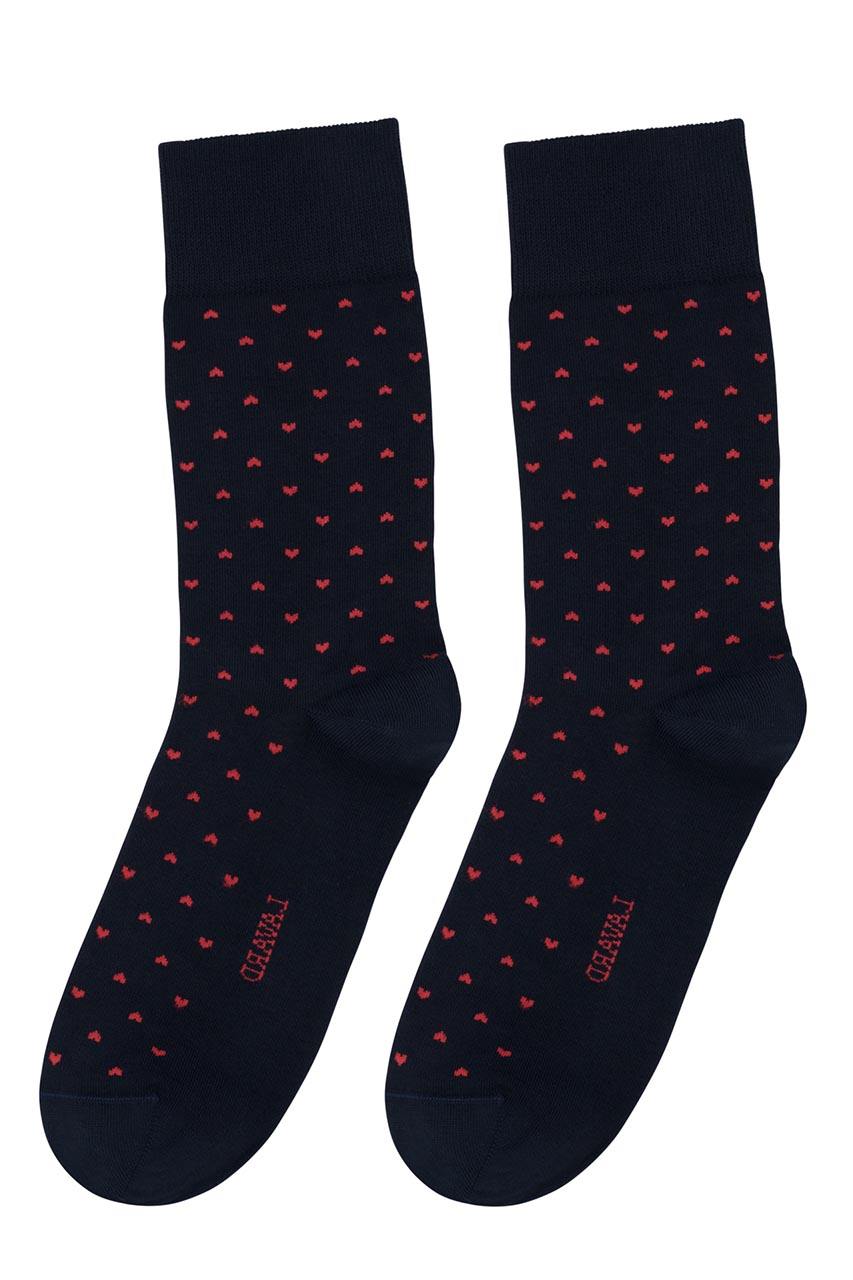 Granatowe skarpety w piękny i oryginalny wzór serduszek w czerwonym odcieniu. Wykonane z dobrej jakości bawełny. Dodadzą charakteru każdej casualowej stylizacji. Idealne dla odważnych, pewnych siebie mężczyzn.