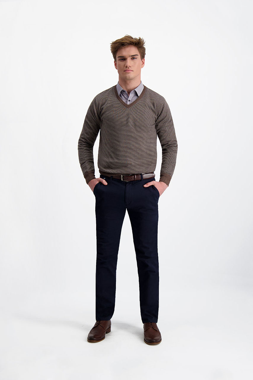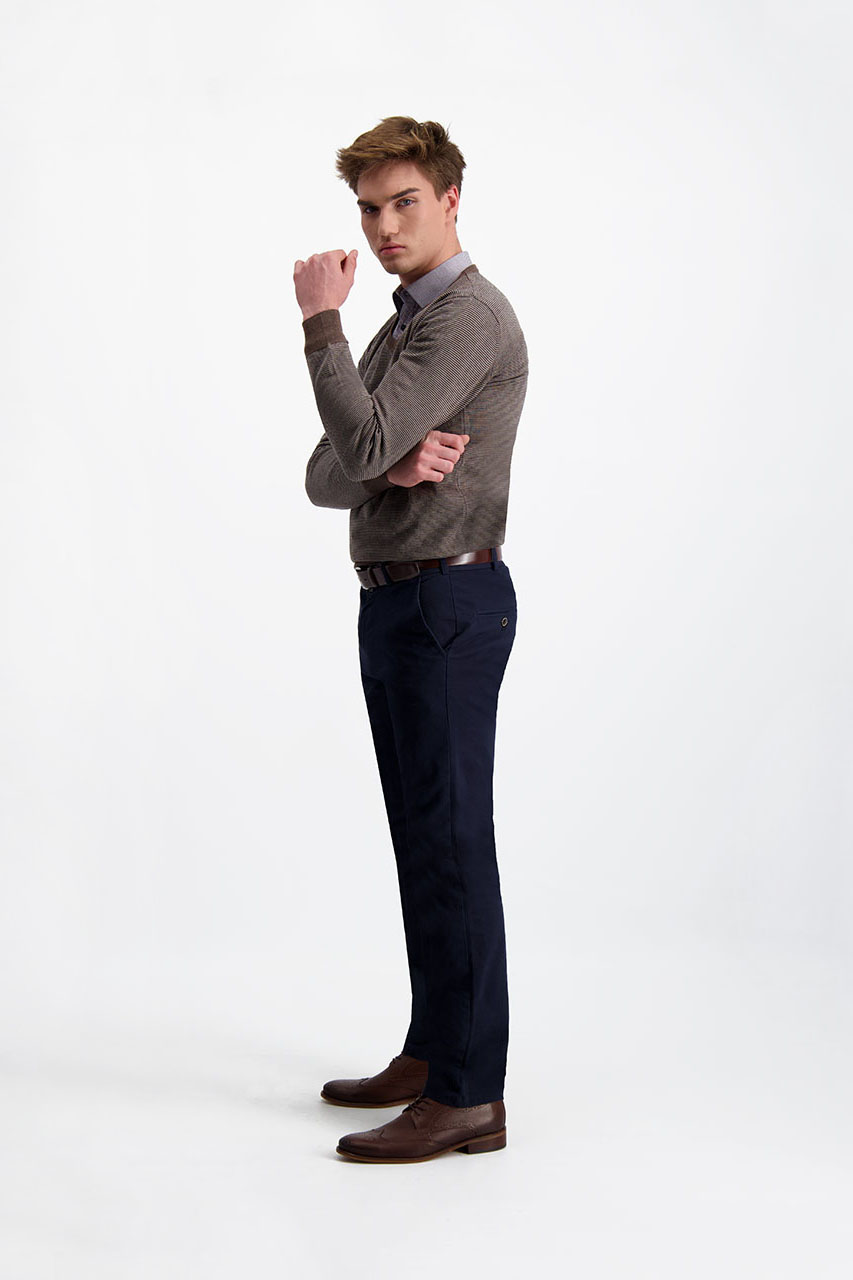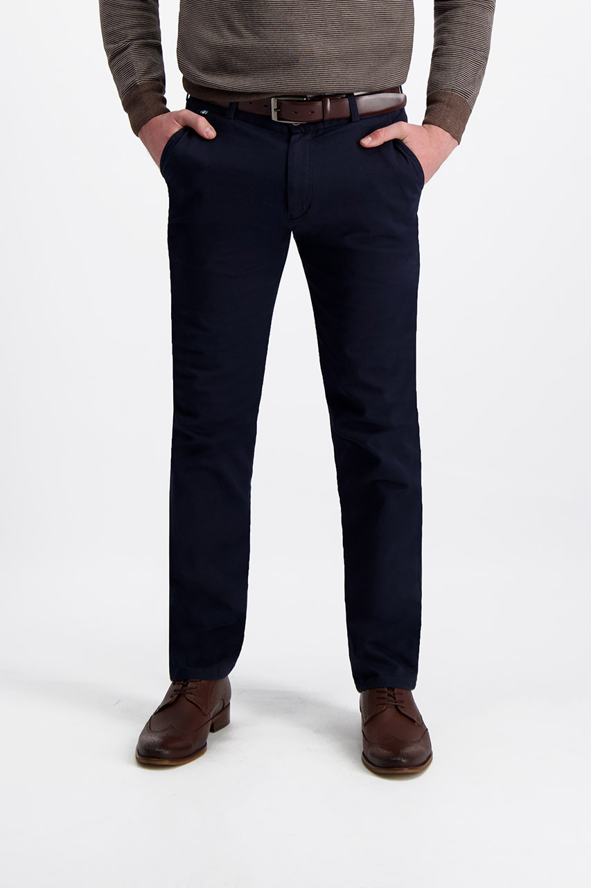 Granatowe spodnie chino to absolutna podstawa w męskiej szafie. Są doskonałą bazą do tworzenia wielu stylizacji. Bardzo dobrze czują się w towarzystwie beżów, brązów, błękitów i camelu. Model o dopasowanym kroju, wykonany z wysokiej jakości bawełny. Klasyczna propozycja, która zawsze będzie strzałem w dziesiątkę.