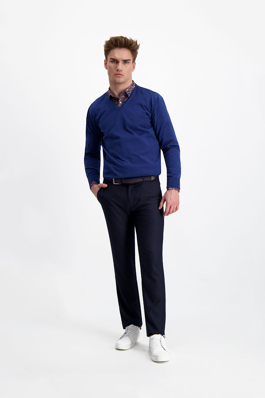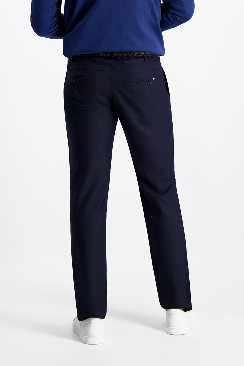 Spodnie chinos w kolorze głębokiego granatu wykonane z przyjemnej w dotyku tkaniny w delikatny mikro wzór. Świetny dopasowany model do casualowych zestawień. W towarzystwie marynarki i koszuli wspaniale spisze się w pracy, natomiast z golfem i sneakersami stworzy niebanalny codzienny zestaw "after hours".