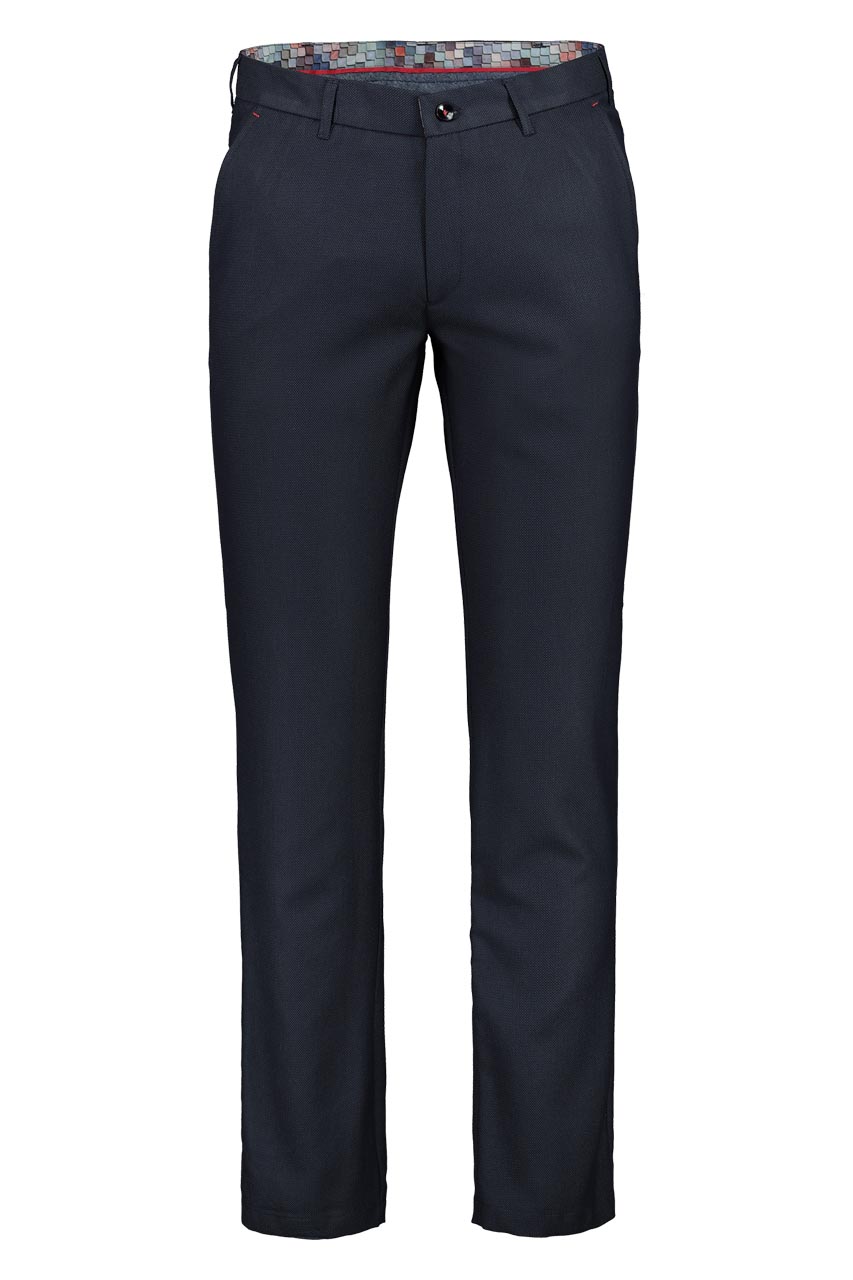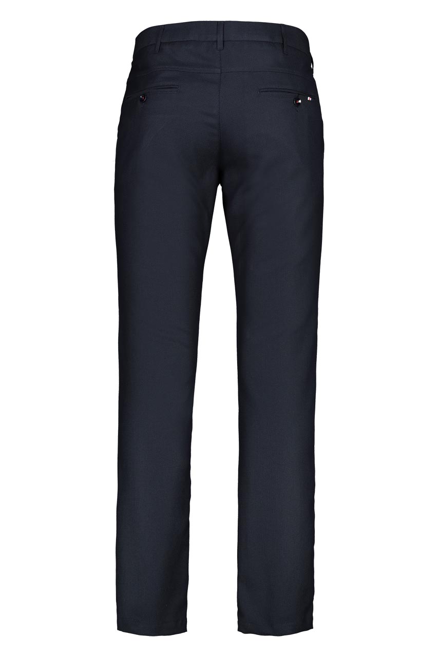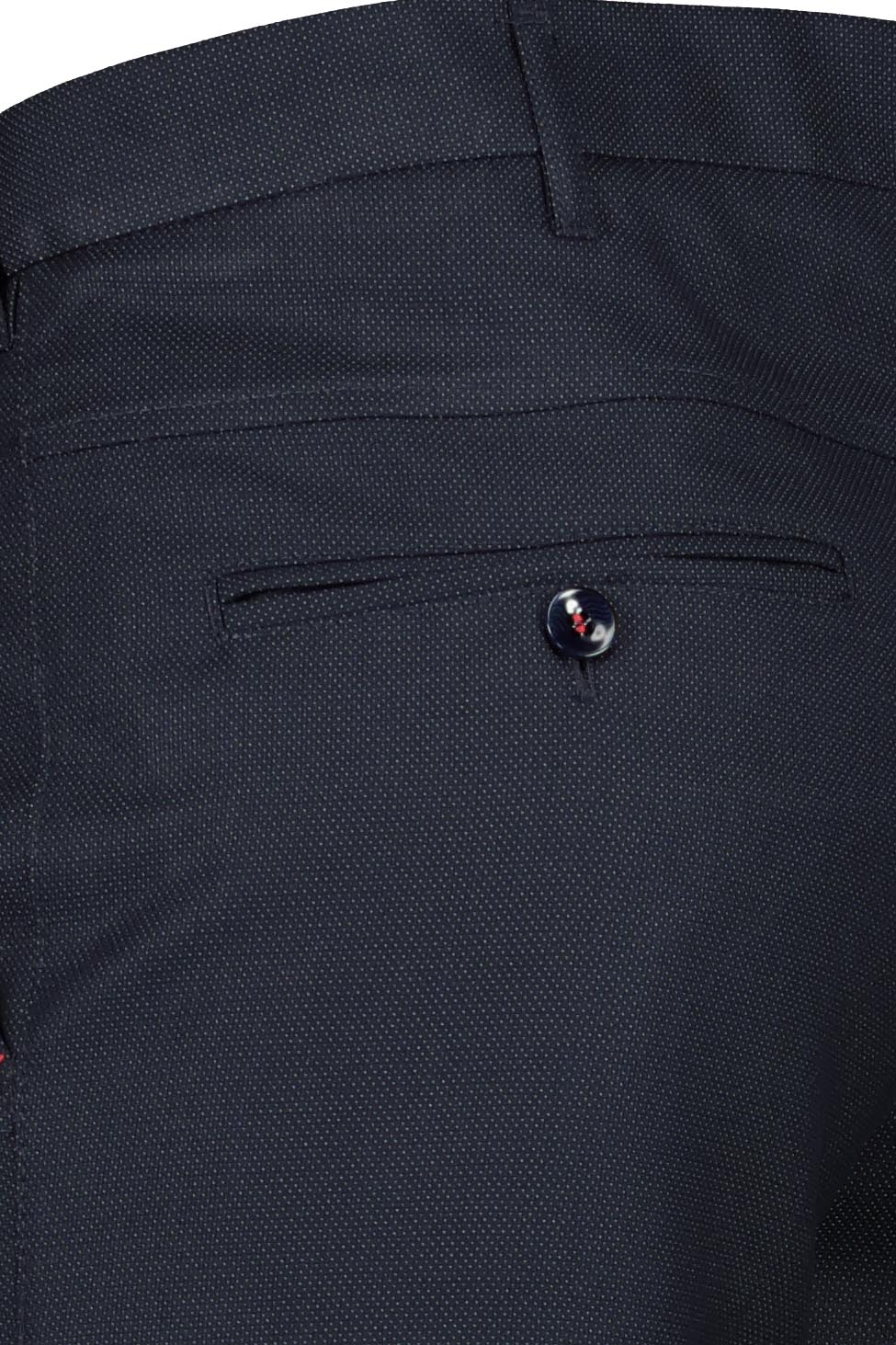Spodnie chinos w kolorze głębokiego granatu wykonane z przyjemnej w dotyku tkaniny w delikatny mikro wzór. Świetny dopasowany model do casualowych zestawień. W towarzystwie marynarki i koszuli wspaniale spisze się w pracy, natomiast z golfem i sneakersami stworzy niebanalny codzienny zestaw "after hours".