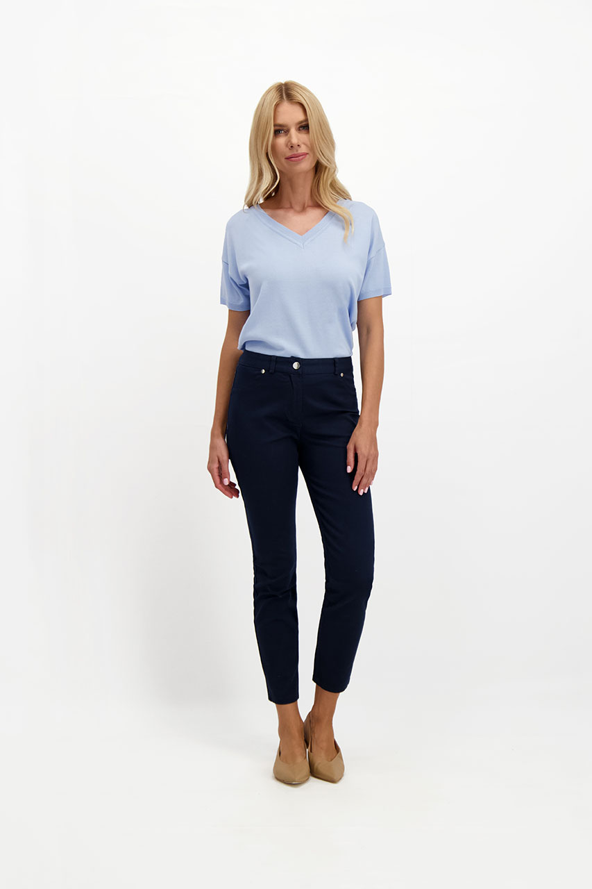 Granatowe spodnie damskie z lekko zwężaną nogawką. Zostały uszyte z elastycznej bawełnianej tkaniny, która rewelacyjnie dopasowuje się do sylwetki oraz korzystnie wpływa na komfort użytkowania. Spodnie posiadają ozdobne akcenty w postaci białych przeszyć na biodrach oraz tylnych kieszeniach. Są świetną propozycją casualową na co dzień, a także w sytuacjach, kiedy musimy zrezygnować z tradycyjnych jeansów. W zestawieniu z białą koszulą oraz kraciastą marynarką będą oryginalnym zestawem smart casualowym, który warto wybrać do pracy. Modelka ma 175 cm wzrostu. Prezentuje rozmiar 36.