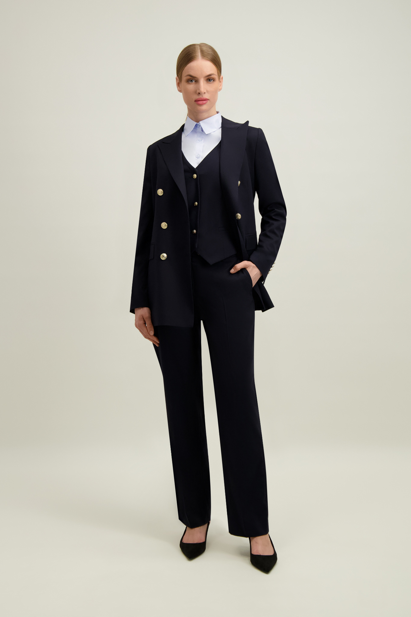 Spodnie z marynarką (87502 lub 87403) z tej samej tkaniny tworzą garnitur. Z tej samej linii występują również spodnie (87503) i kamizelka (87504).