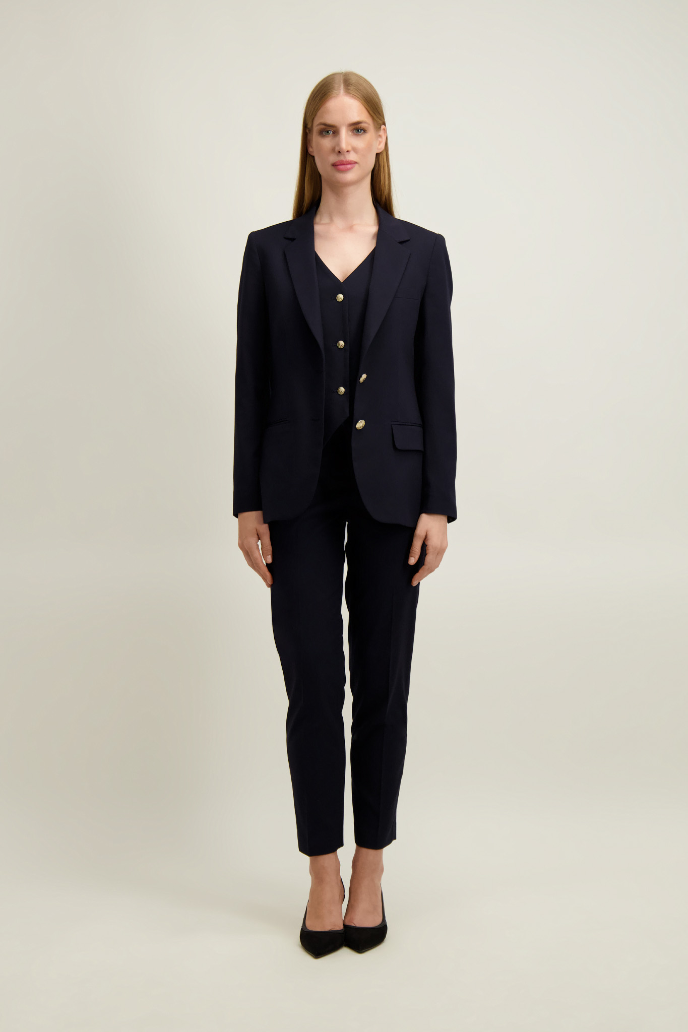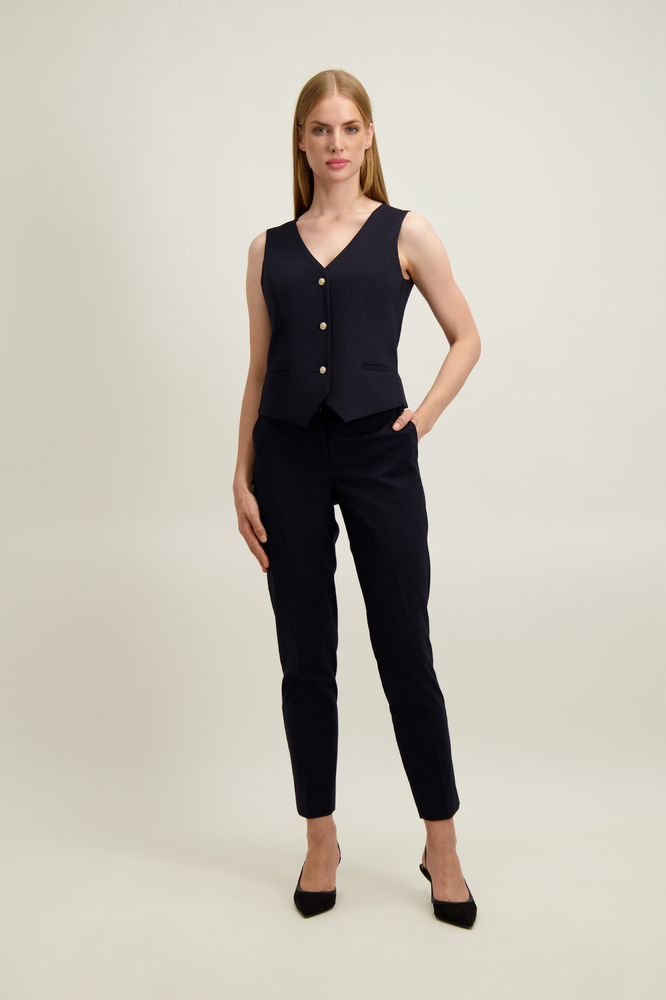 Spodnie z marynarką (87502 lub 87403) z tej samej tkaniny tworzą garnitur. Z tej samej linii występują również spodnie (87404) i kamizelka (87504).