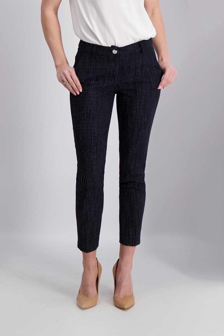 Granatowe spodnie damskie wykonane z przyjemnej w dotyku tkaniny przeplatanej srebrną nitką. Piękny, klasyczny fason w oryginalnym wykonaniu przypadnie do gustu każdej wymagającej kobiecie, która lubi niebanalne rozwiązania. Spodnie zapinane na zamek i guzik. Posiadają dwie wygodne kieszenie chino. Spodnie z marynarka z tej samej tkaniny tworzą świetny zestaw godny każdej stylowej kobiety. Modelka ma 177 cm wzrostu. Prezentuje rozmiar 36.