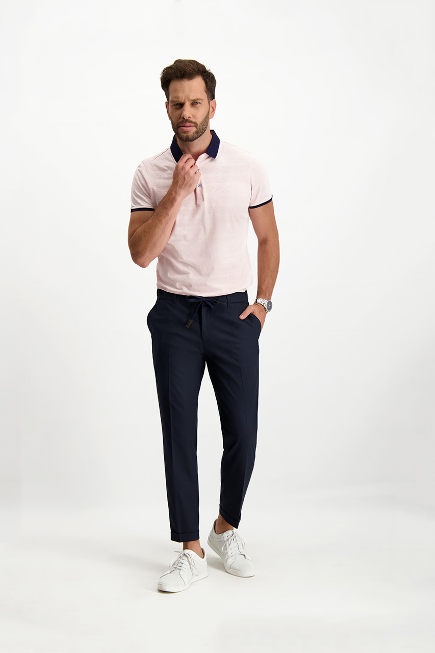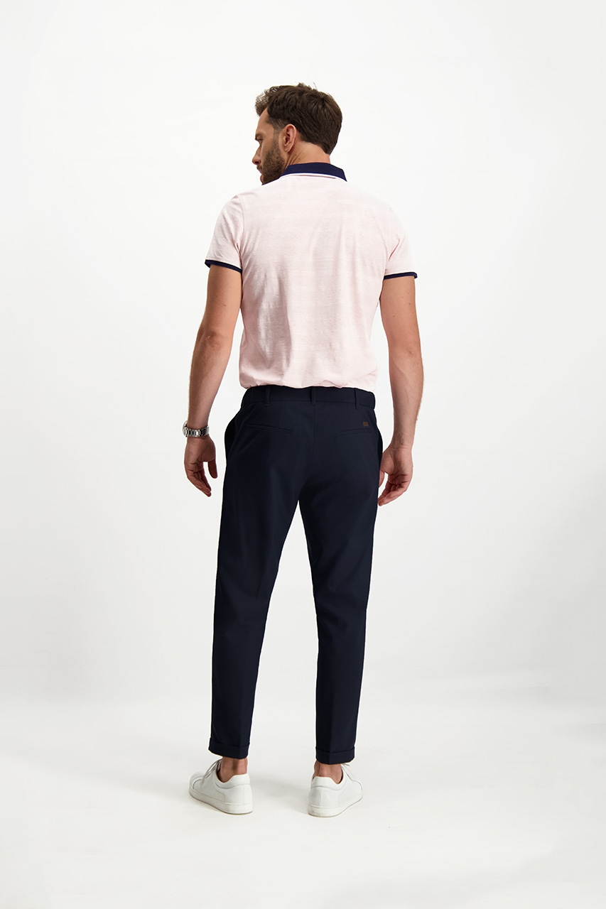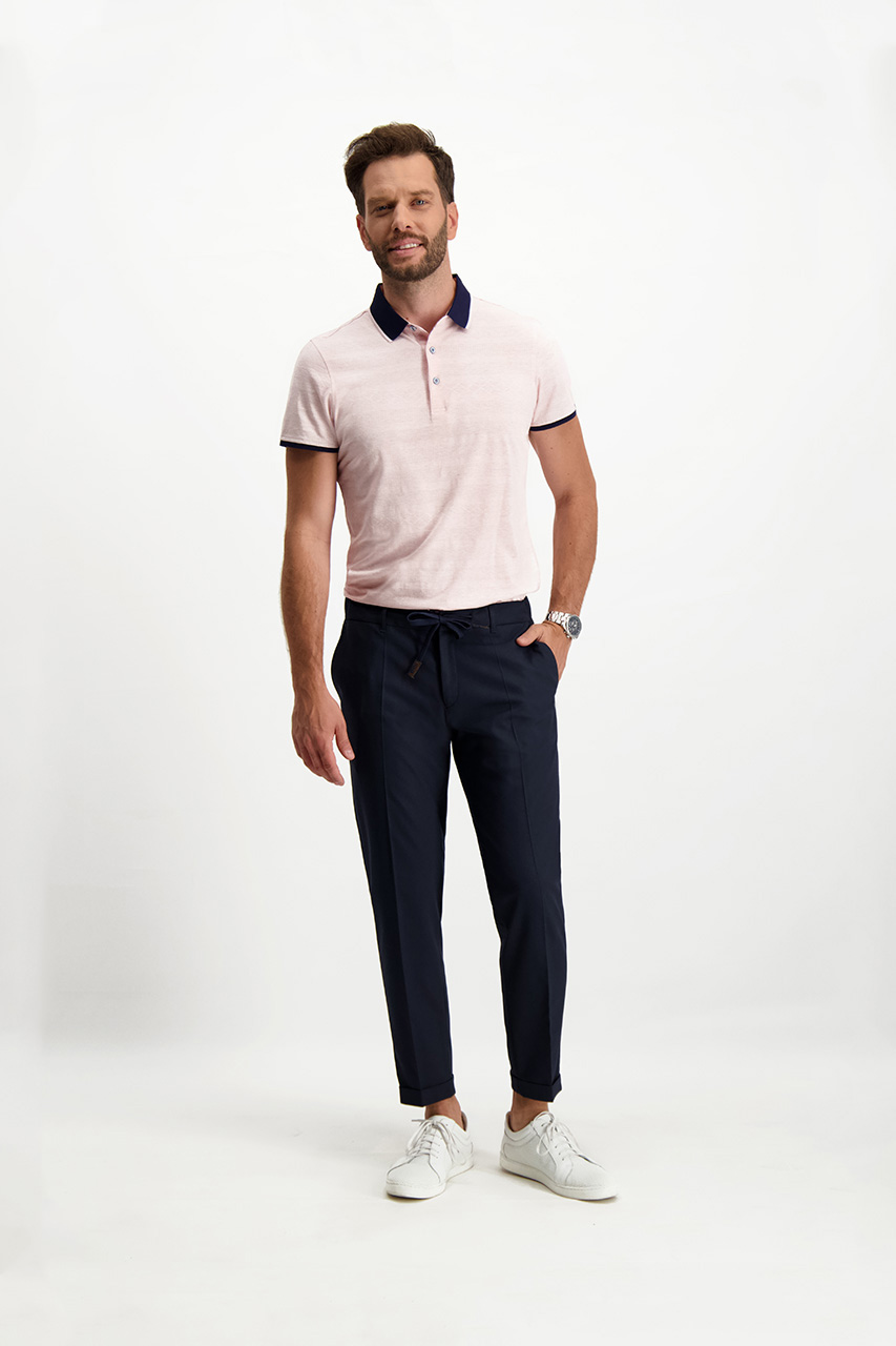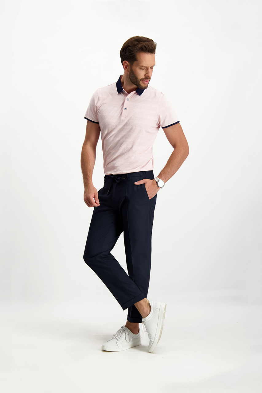 Granatowe spodnie męskie o kroju joggerów to połączenie swobody i szyku. Zostały uszyte z tkaniny garniturowej, co nadaje im nuty elegancji. Spodnie wyróżnia pas z troczkami, cięte kieszenie, a także nogawki z kantem oraz mankietami. Dzięki regulowanej gumce w pasie można dowolnie dopasować je do własnej sylwetki, co tylko podwyższa komfort ich użytkowania na co dzień. Jest to nowoczesna propozycja do stylizacji casualowych, w których króluje biały t-shirt oraz lekkie sneakersy. Spodnie przypadną do gustu się zwłaszcza tym panom, którzy chcą wzbogacić swoją garderobę o świeży i nowoczesny akcent, jakim bez wątpienia jest oferowany model.