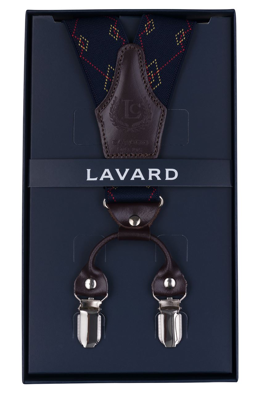 Granatowe szelki męskie w żółte romby z czerwonymi akcentami. Zapinane na klipsy. Idealnie pasują do mniej formalnej stylizacji.