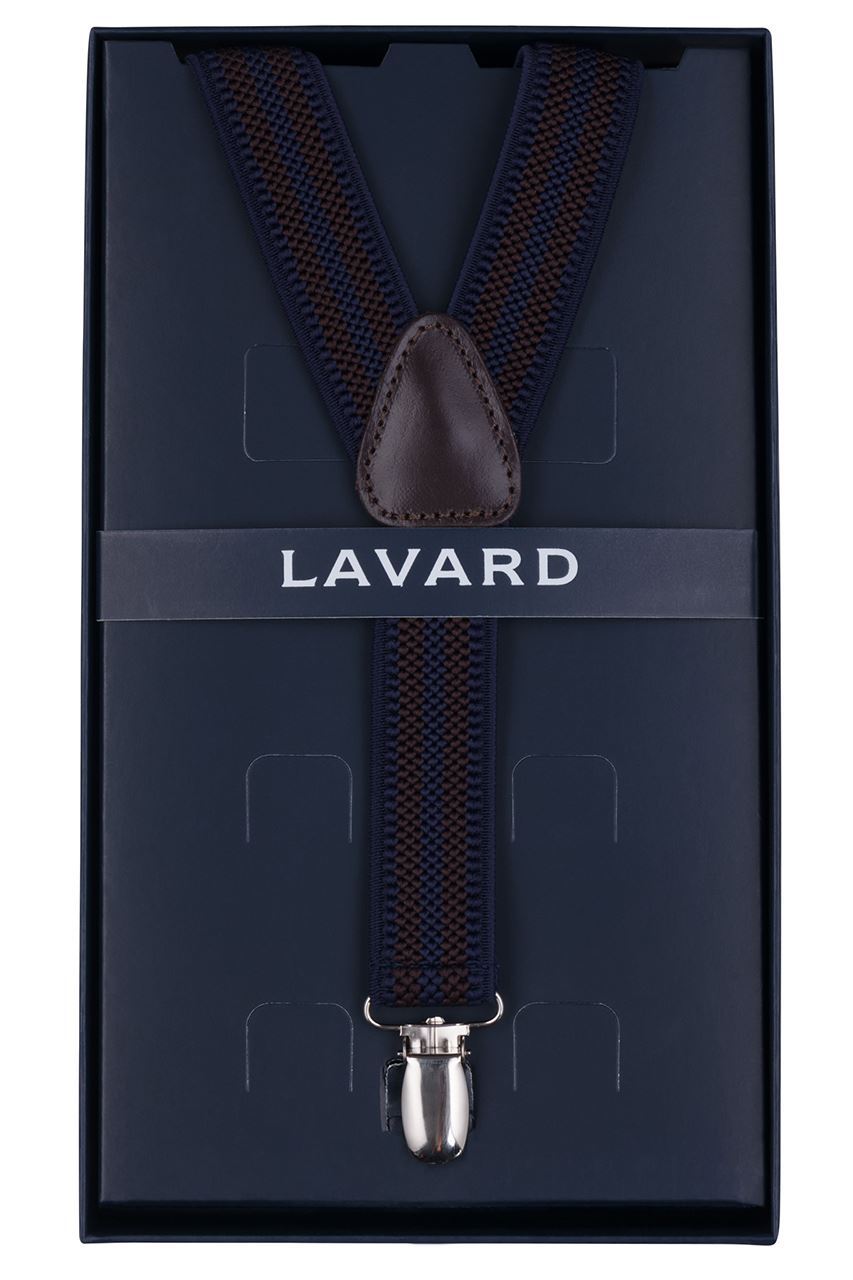 Granatowe szelki w w brązowe pasy. Zapinane na klipsy. Są idealnym dodatkiem do mniej formalnego stroju, szczególnie w połączeniu z ciemnobrązowymi butami.