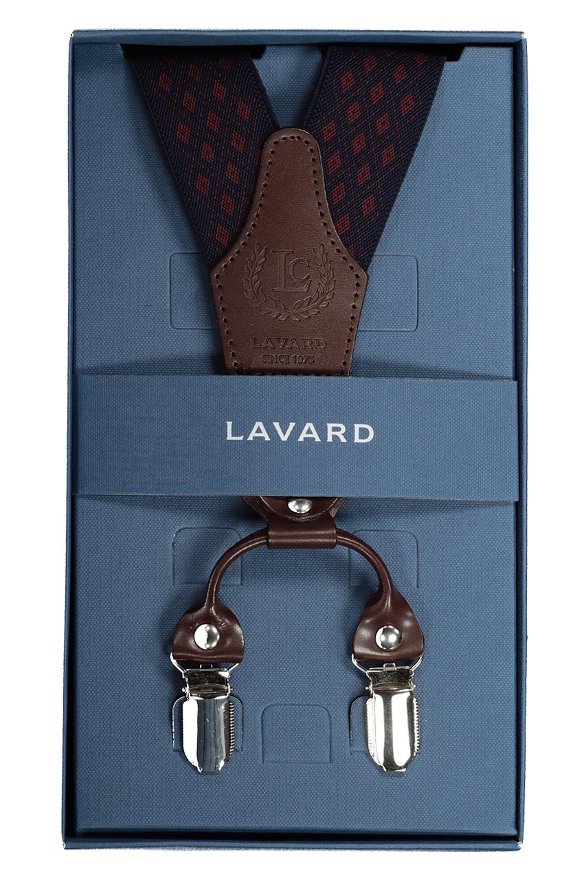 Granatowe szelki w bordowy wzór rombów. Stonowany model dla panów ceniących klasyczne rozwiązania. Posiadają metalowe klamry i regulację długości. Element naturalnej skóry dopełnia całości.