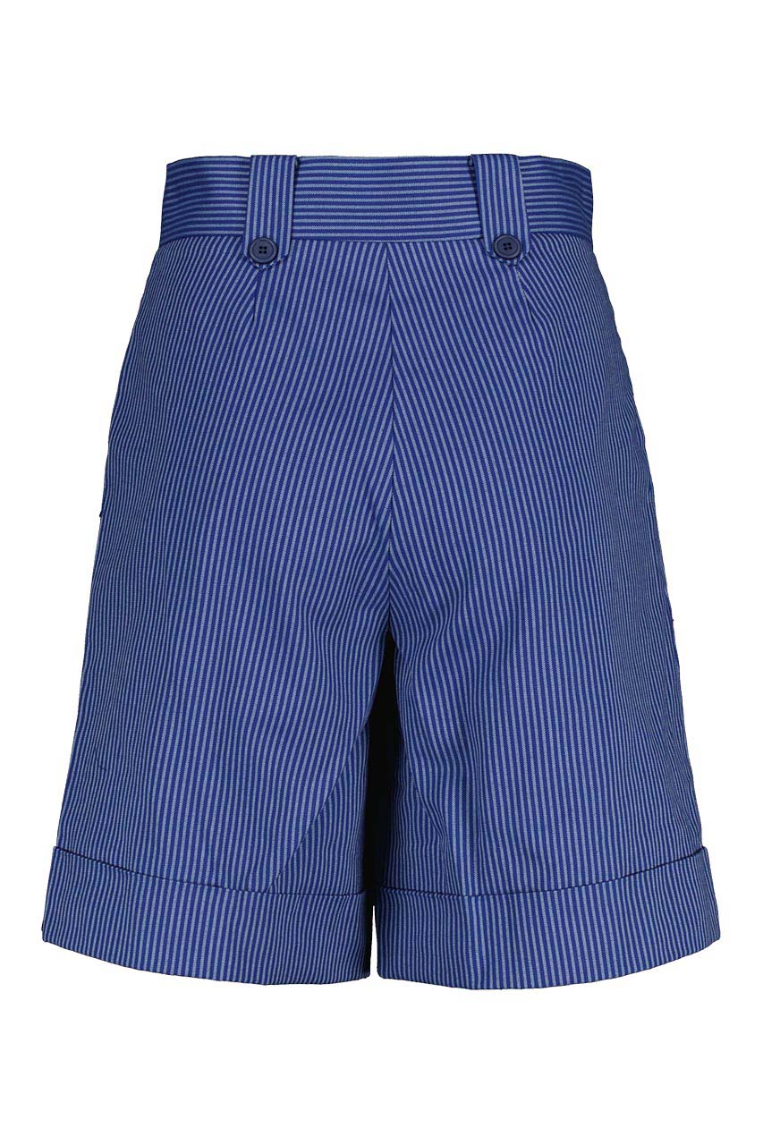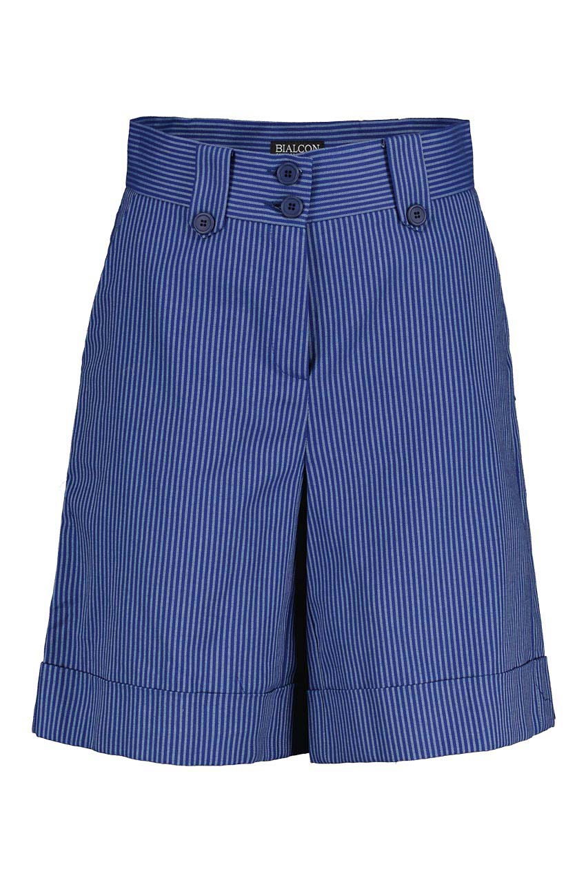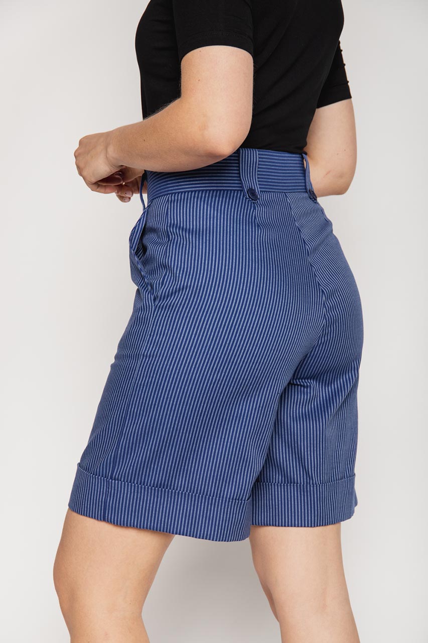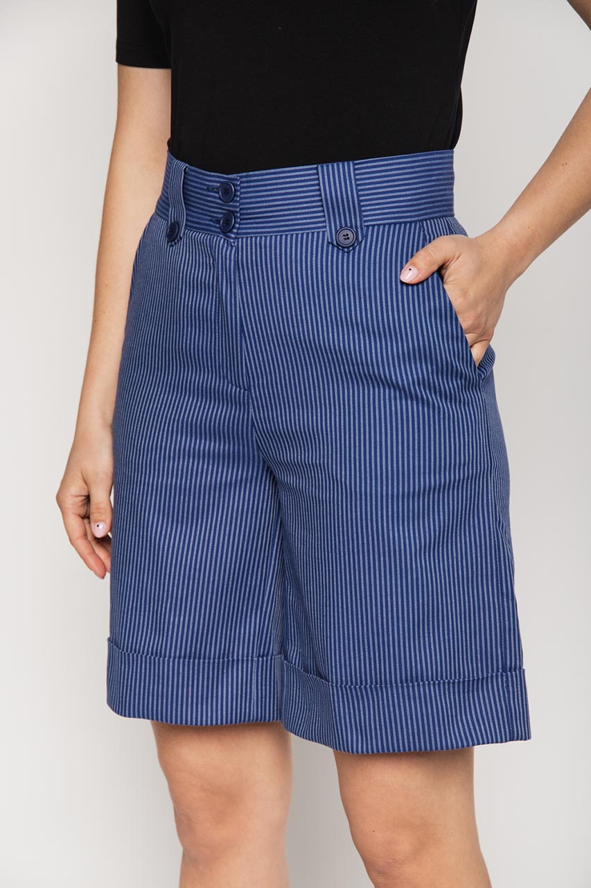 Szorty damskie w eleganckim wydaniu to wyjątkowa propozycja na letnie okazje. Proponowany model został wykonany z bawełnianej tkaniny w drobne granatowe prążki. Zdobią go szlufki z guzikami, a także podwójne zapięcie i szerokie mankiety. Na komfort użytkowania korzystnie wpływają kieszenie boczne oraz długość nogawki do połowy uda. To bez wątpienia świetna casualowa propozycja, którą warto zestawić z klasycznym t-shirtem oraz sneakersami. Sprawdzą się znakomicie podczas weekendowego wypadu za miasto, spotkania z przyjaciółmi lub wyjścia na plażę.