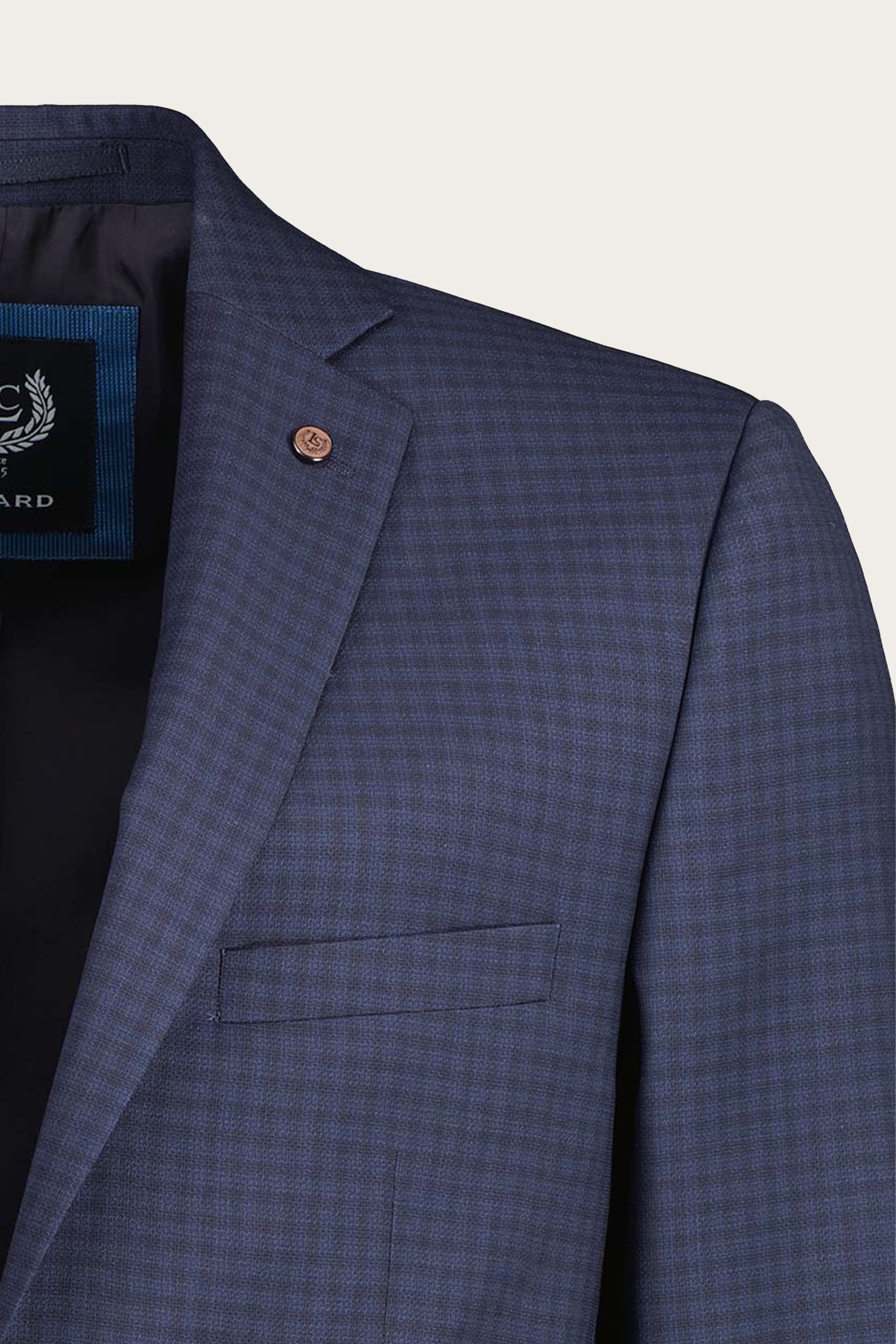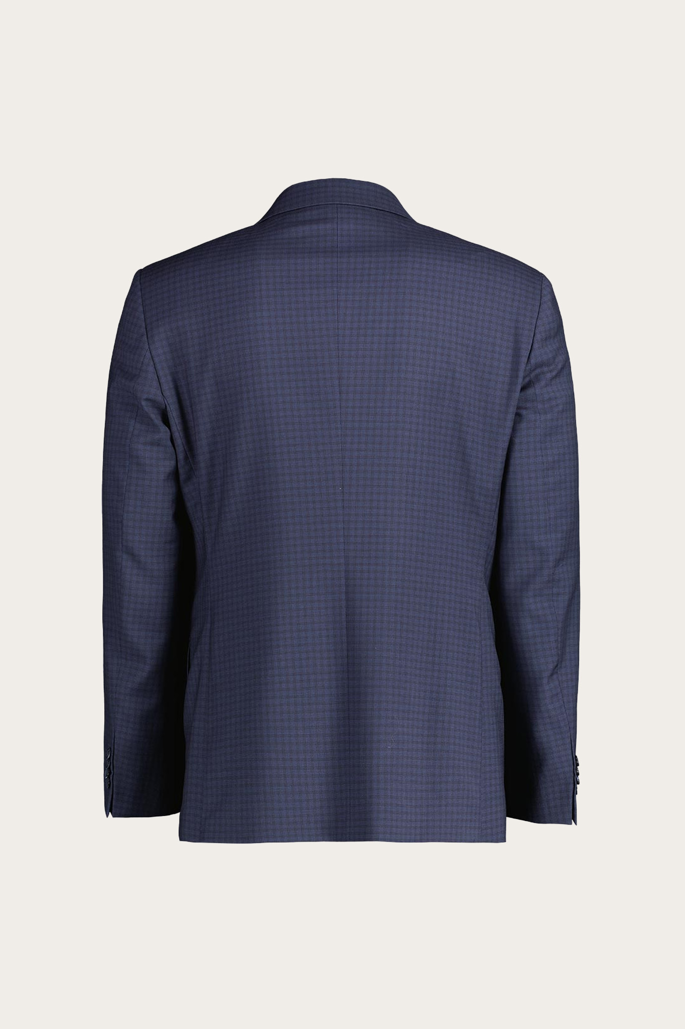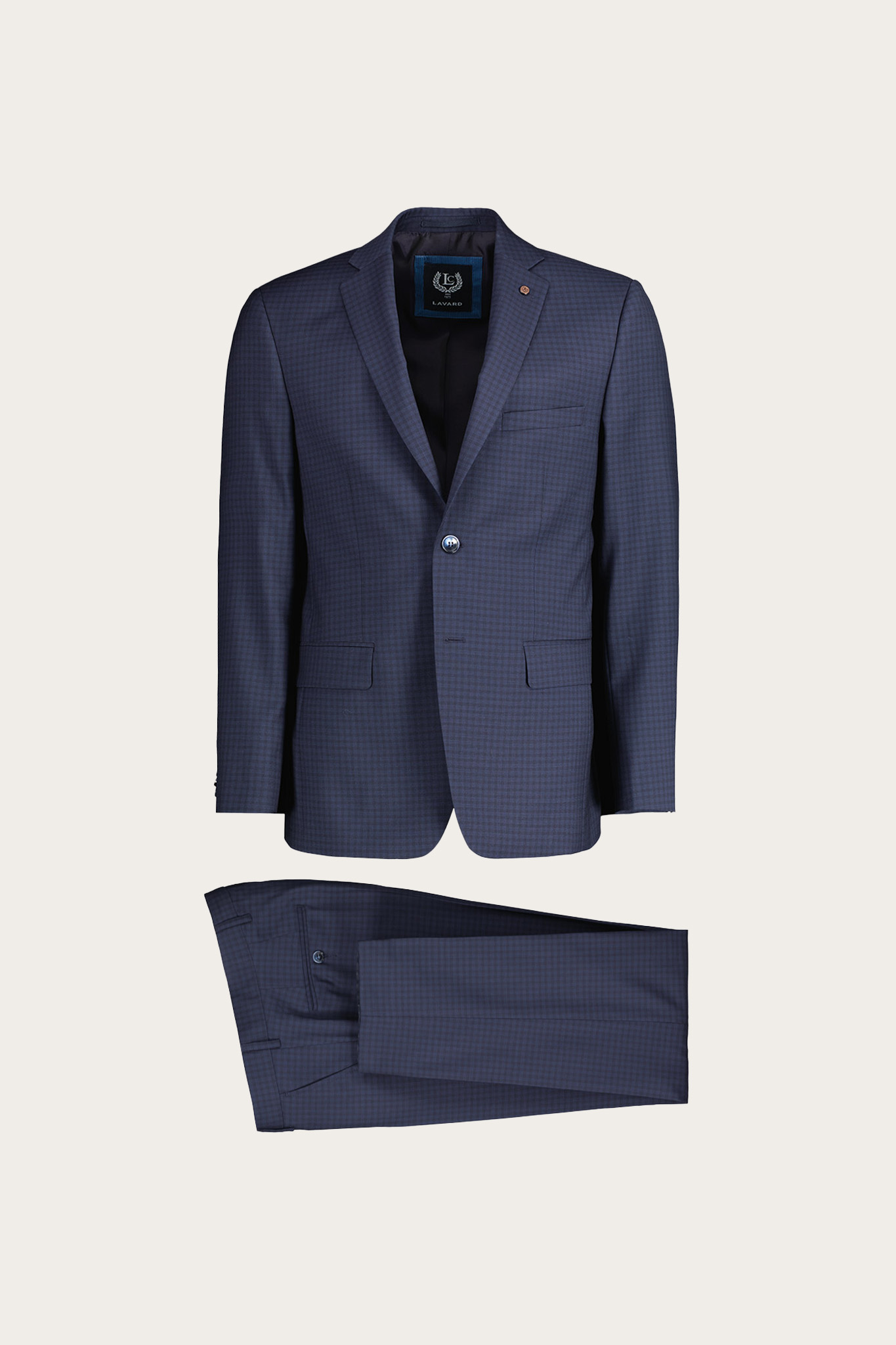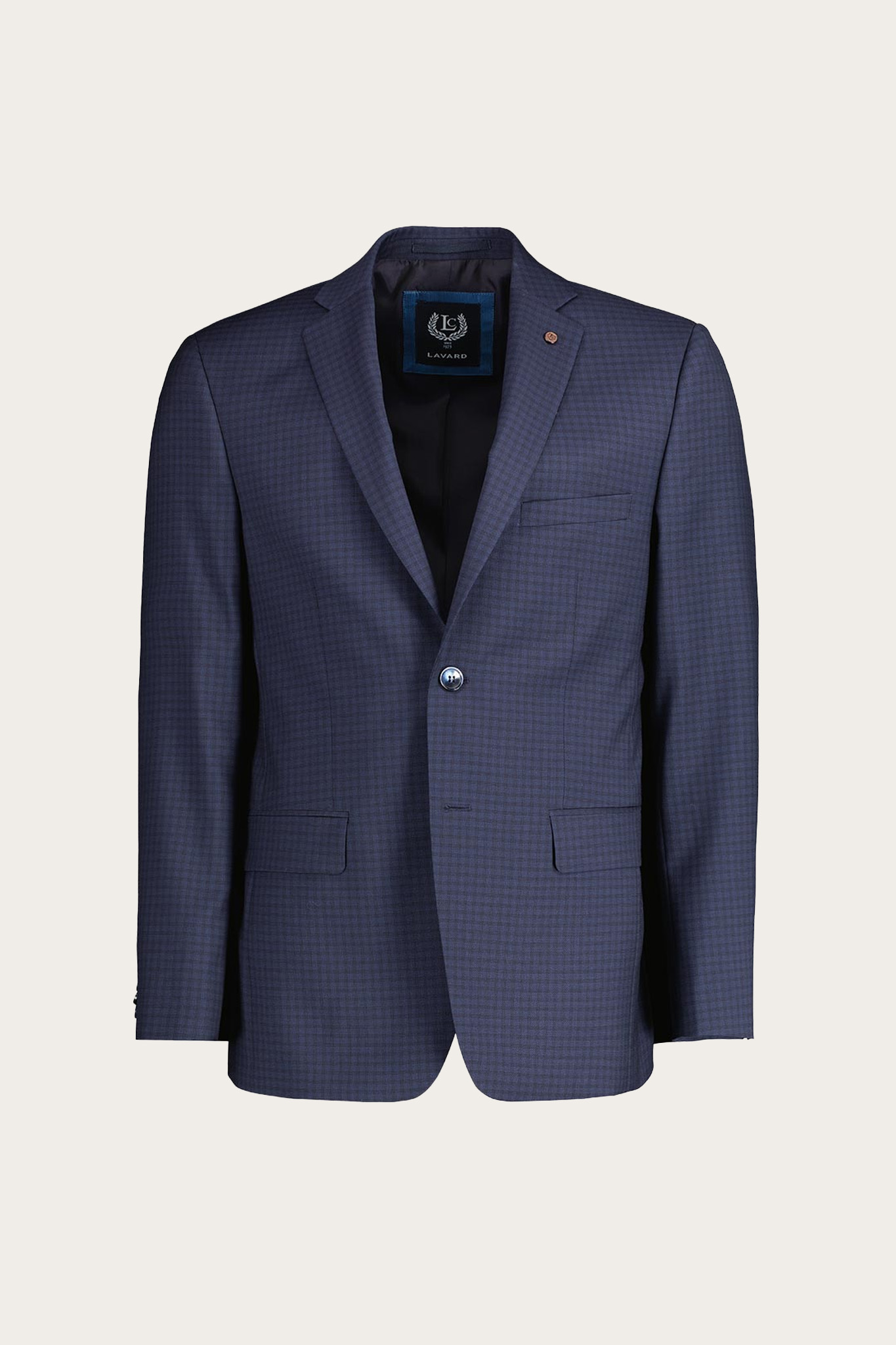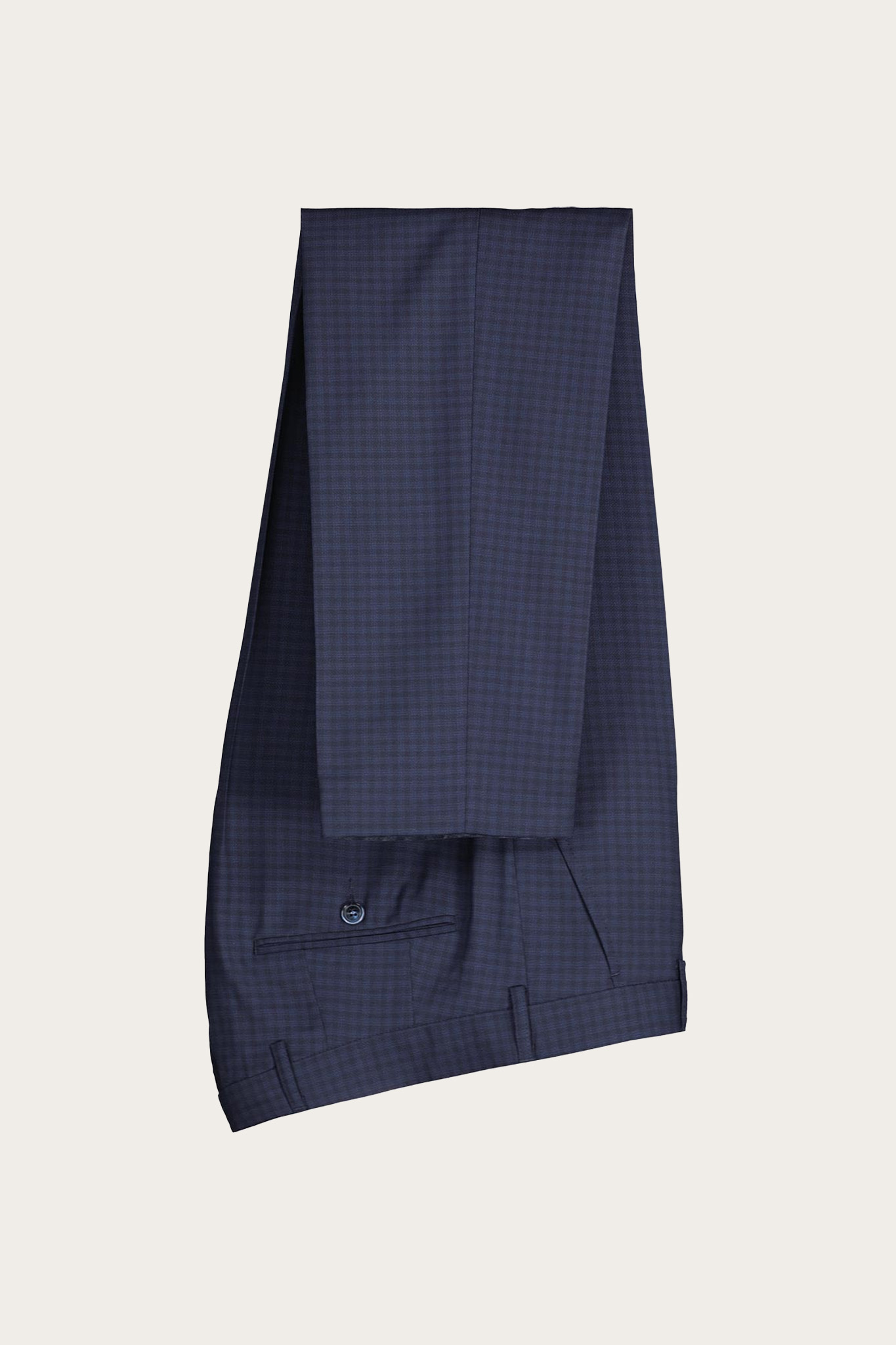 Garnitur uszyty z wełnianej tkaniny w drobną kratkę. Posiada dwie kieszenie z patką oraz otwarte klapy. Wyprodukowano w Polsce.