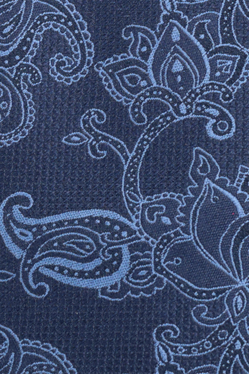 Granatowy krawat w błękitny wzór to elegancka propozycja do wielu stylizacji. Świetnie prezentuje się z granatowym garniturem i białą koszulą jak i z mniej formalną marynarką.