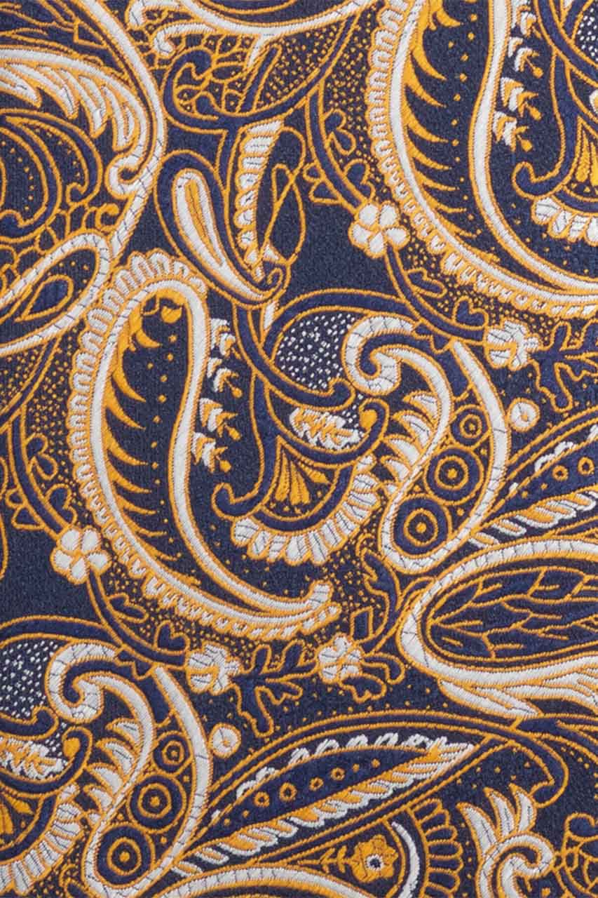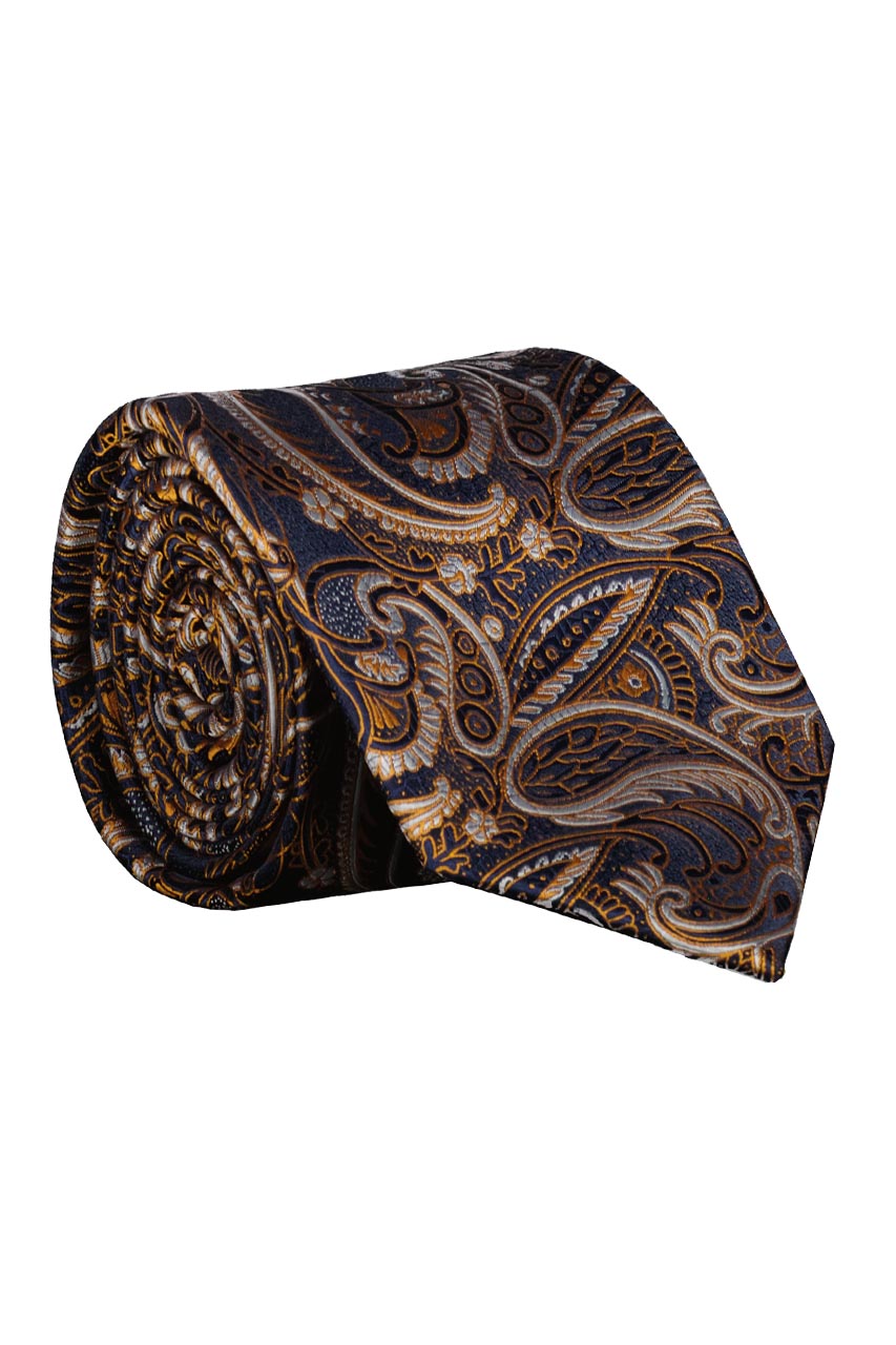 Granatowy krawat we wzory w odcieniach camelu i jasnego szarego. Niebanalny model wykonany z lekko połyskującej tkaniny. Idealny zarówno do casualowych jak i eleganckich zestawień.