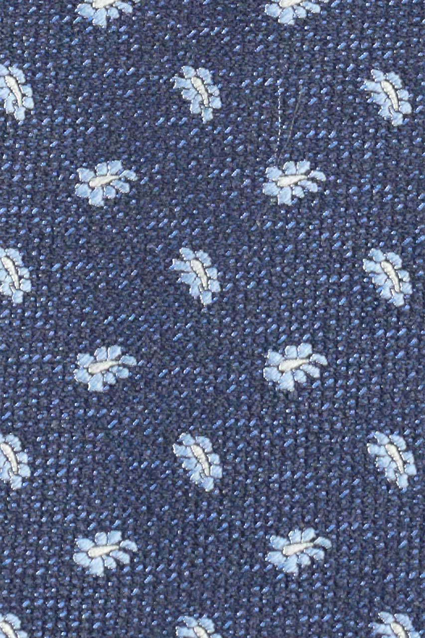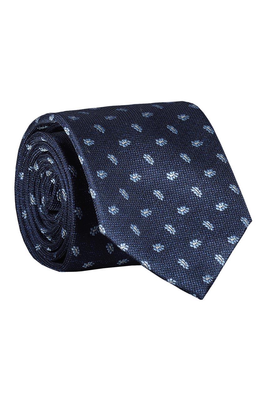 Granatowy krawat w drobne kwiatki to fantastyczny model, który świetnie pasuje do mniej formalnych zestawień. Wykonany z lekko połyskującej tkaniny z delikatną strukturą jest doskonałą propozycją do casualowych marynarek.