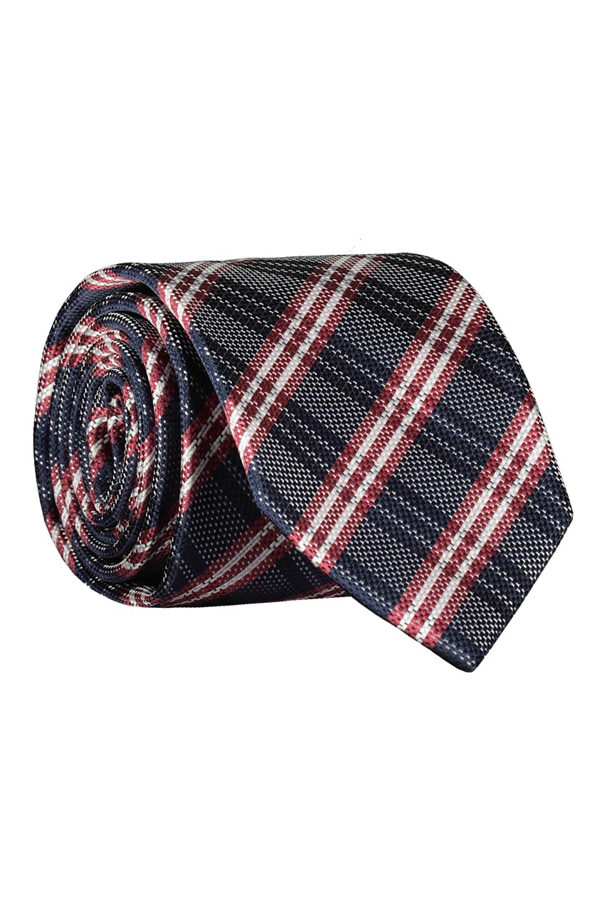 Granatowy krawat w skośne pasy, które układają się w wzór kraty. Model w ponadczasowej kolorystyce granatu, czerwieni oraz bieli. Idealny do miejskich zestawień.