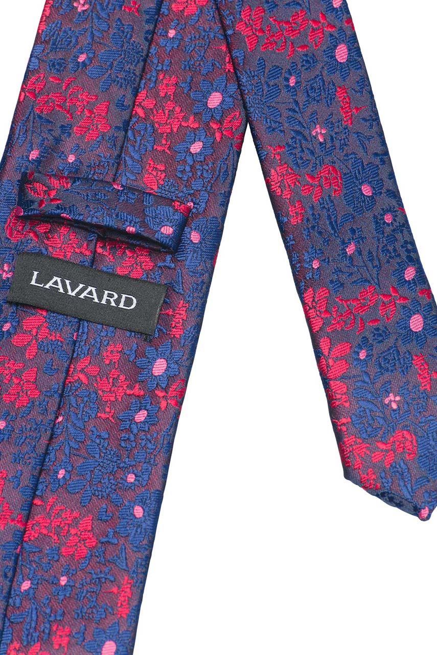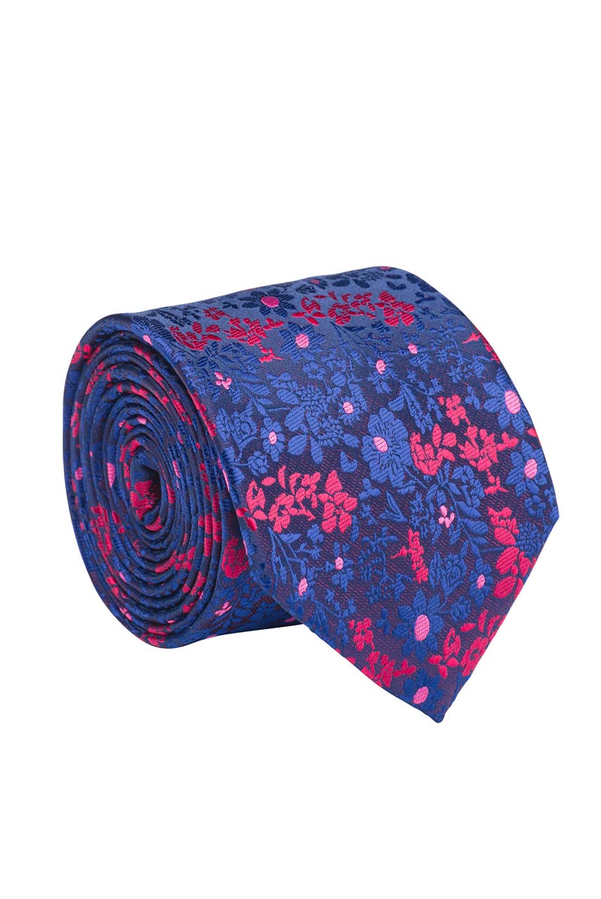 Granatowy krawat we wzór niebiesko-bordowych kwiatów. Wykonany z delikatnie połyskującej tkaniny o widocznej strukturze.