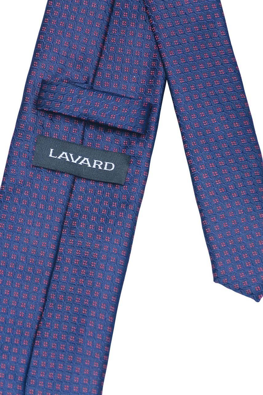Granatowy krawat z ozdobnym geometrycznym wzorem koloru czerwonego. Znakomicie prezentuje się z białą lub błękitną koszulą.