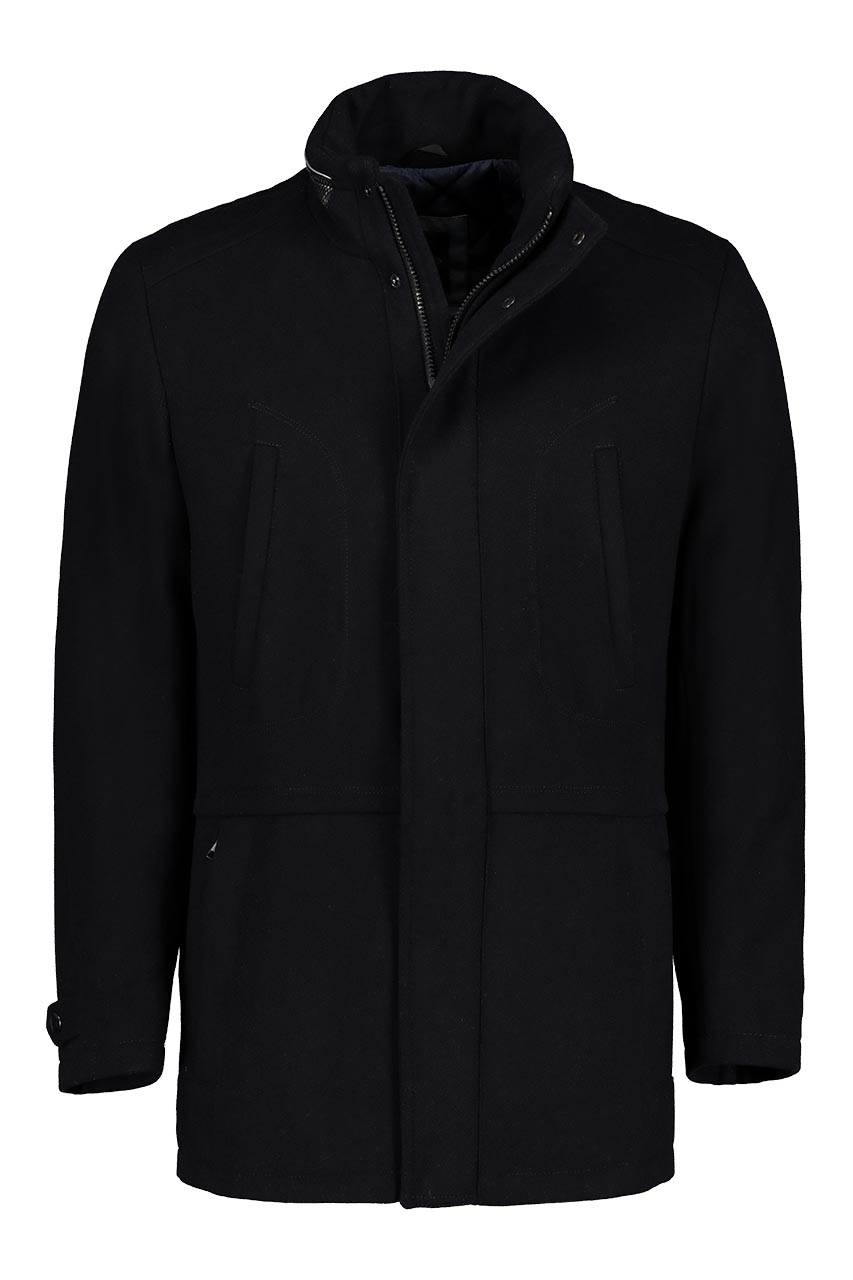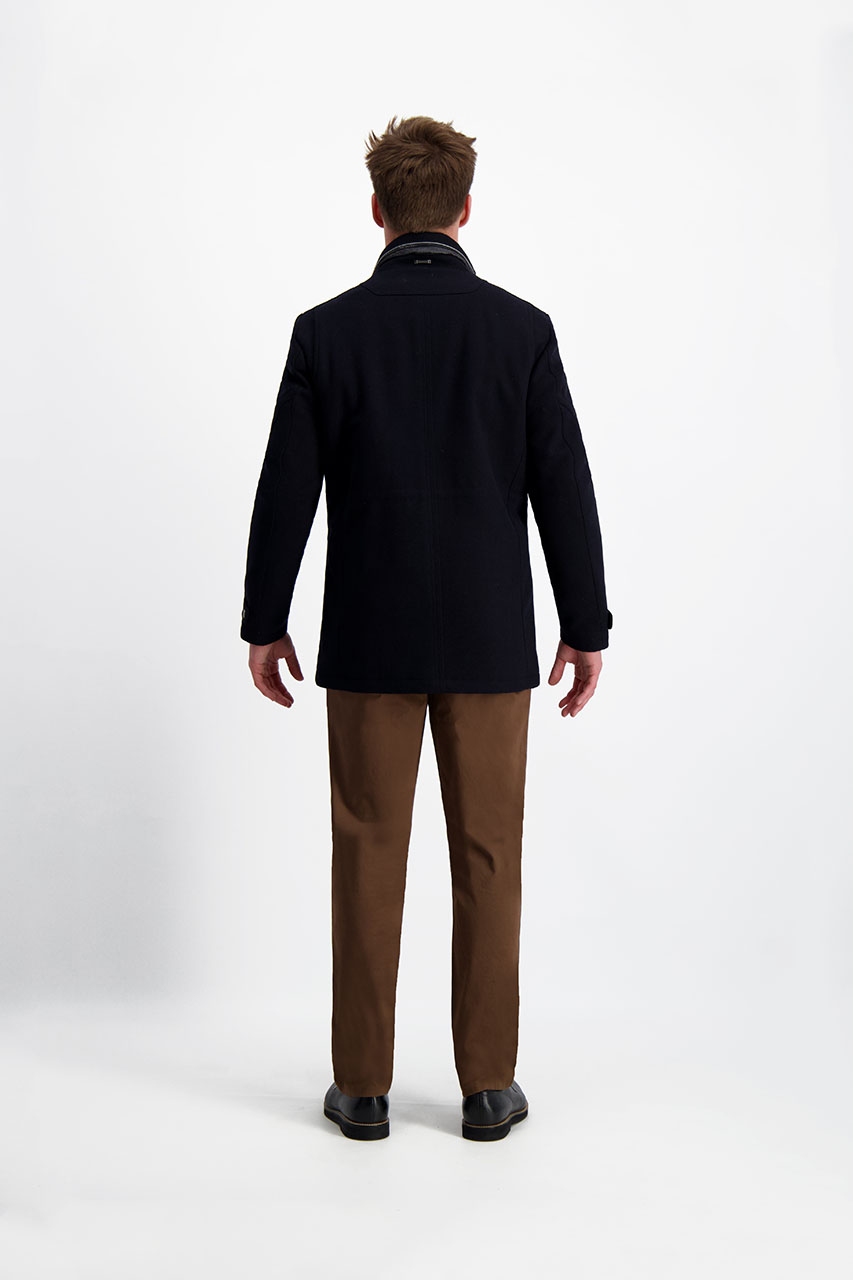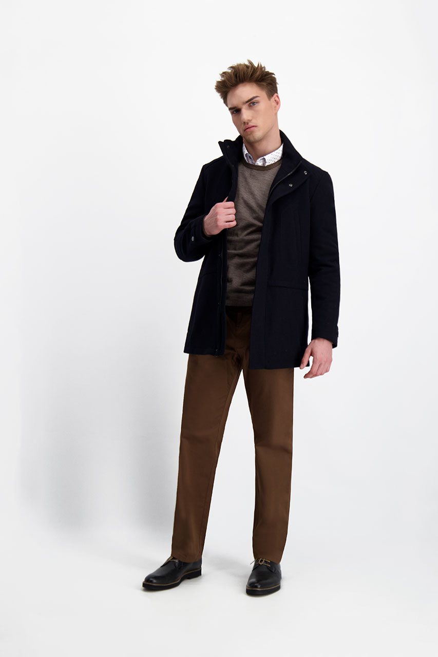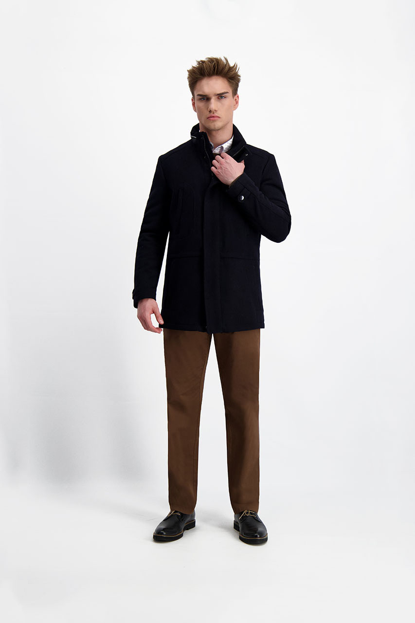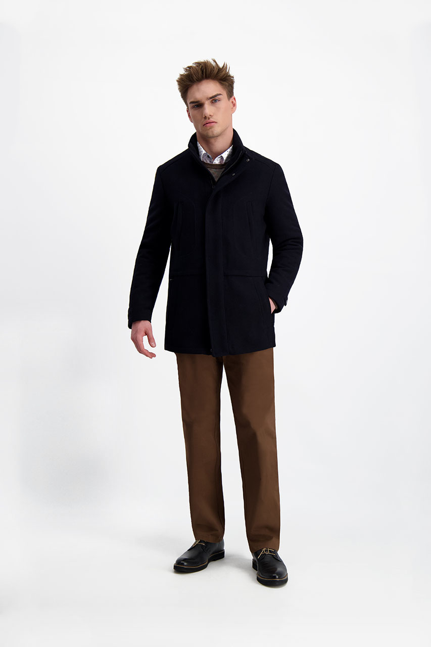 Granatowy płaszcz męski o regularnym, klasycznym kroju. Model z wieloma,praktycznymi kieszeniami. Zapinany na zamek i napy. Ozdobna stójka przełamuje nieco formalny charakter płaszcza. To propozycja doskonała do eleganckich oraz casualowych stylizacji.
