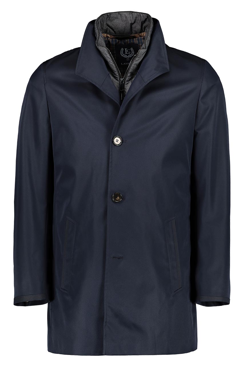 Granatowy płaszcz męski wykonany z tkaniny o właściwościach wodoodpornych oraz wiatroodpornych. Ponadczasowy model z panelem docieplającym w szarym odcieniu, który można odpiąć. Nowoczesna propozycja o klasycznym fasonie. Zapinana na zamek i guziki. Posiada dwie kieszenie skośne. Płaszcz świetnie prezentuje się zarówno z garniturem jak i z spodniami chino i z golfem.
