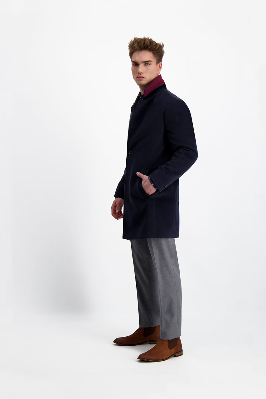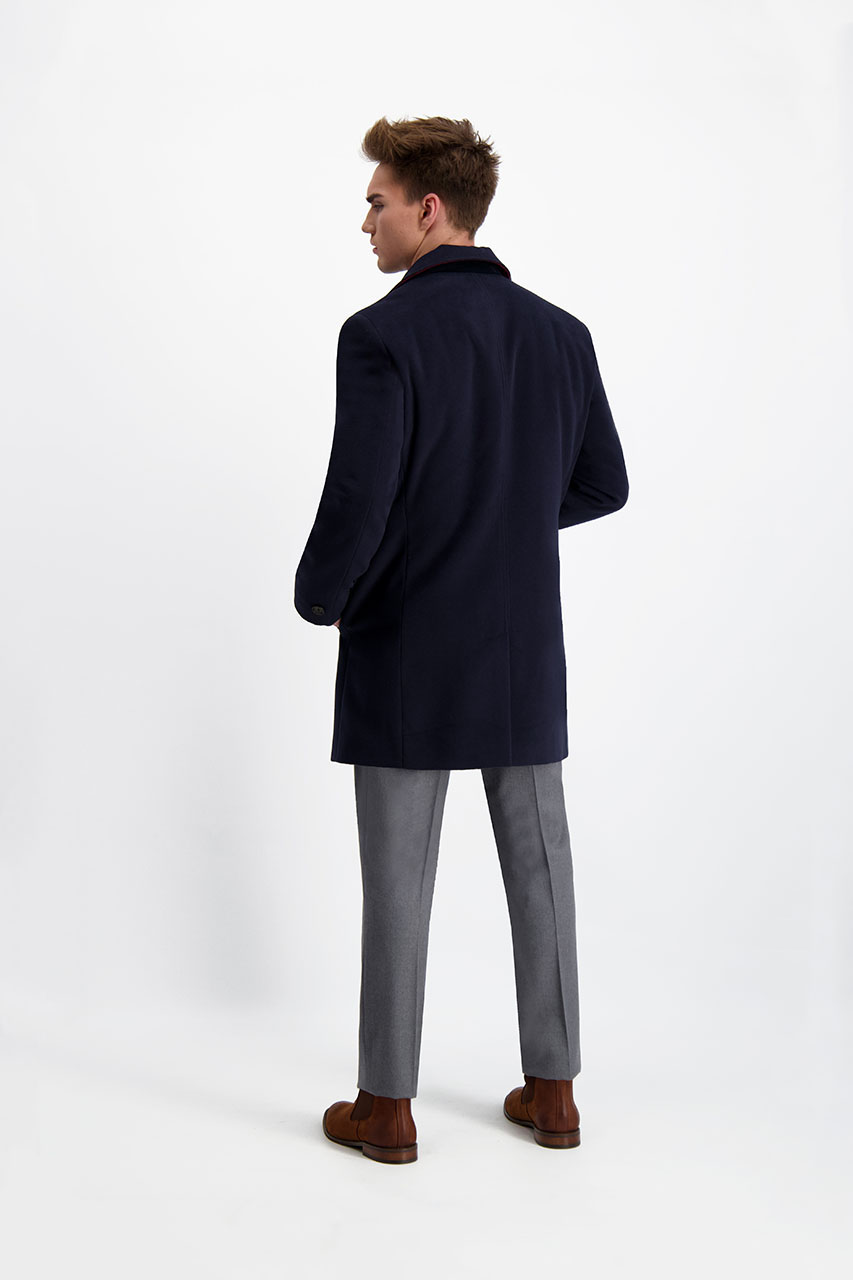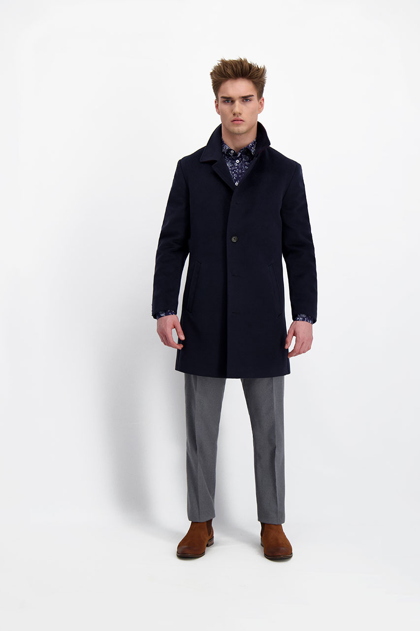 Granatowy płaszcz męski wykonany z bardzo przyjemnej w dotyku tkaniny. Piękny, klasyczny model o dopasowanym kroju zapinany na guziki. Posiada dwie cięte kieszenie oraz ozdobne podszycie kołnierza wzorzystym filcem w granatowe i czerwone wzory. Niezwykle szykownie prezentuje się z garniturem. Płaszcz stanowi obowiązkową pozycję w szafie każdego eleganckiego mężczyzny.