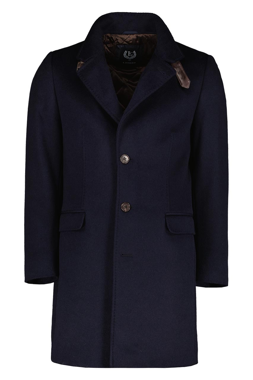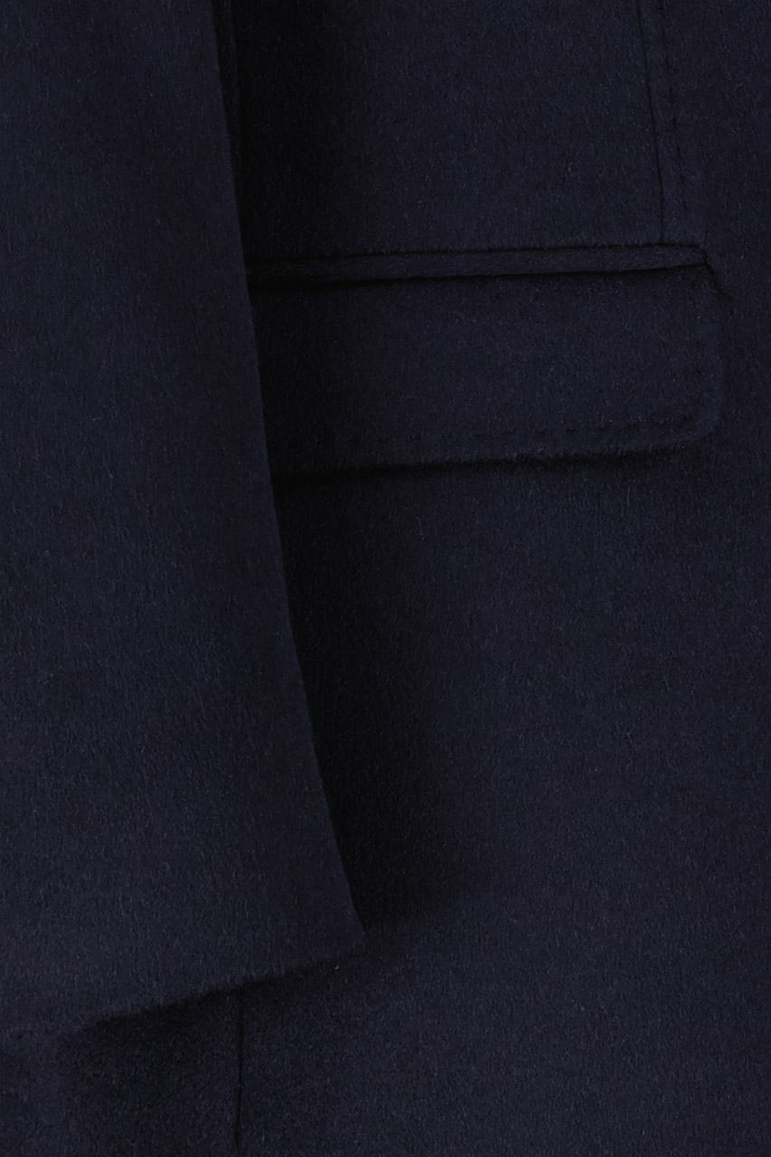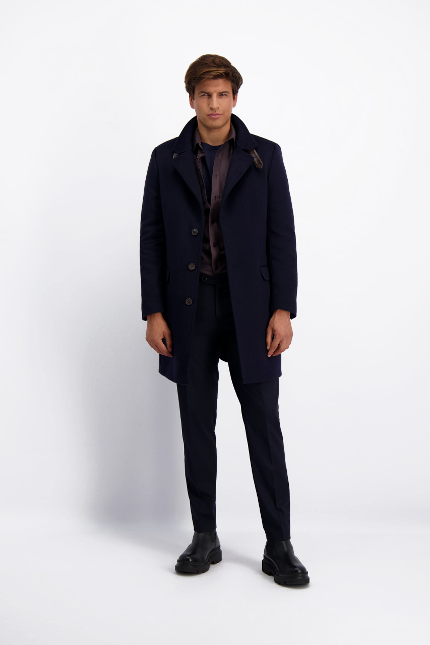 Wełniany płaszcz w granatowym kolorze, uszyty z włoskiej tkaniny Comistra. Model ocieplony. Płaszcz zapinany na guziki. Posiada dwie kieszenie zakończone patką oraz ozdobną sprzączkę przy kołnierzu. Model o kroju super modern. Wzrost modela: 187 cm; rozmiar 50.