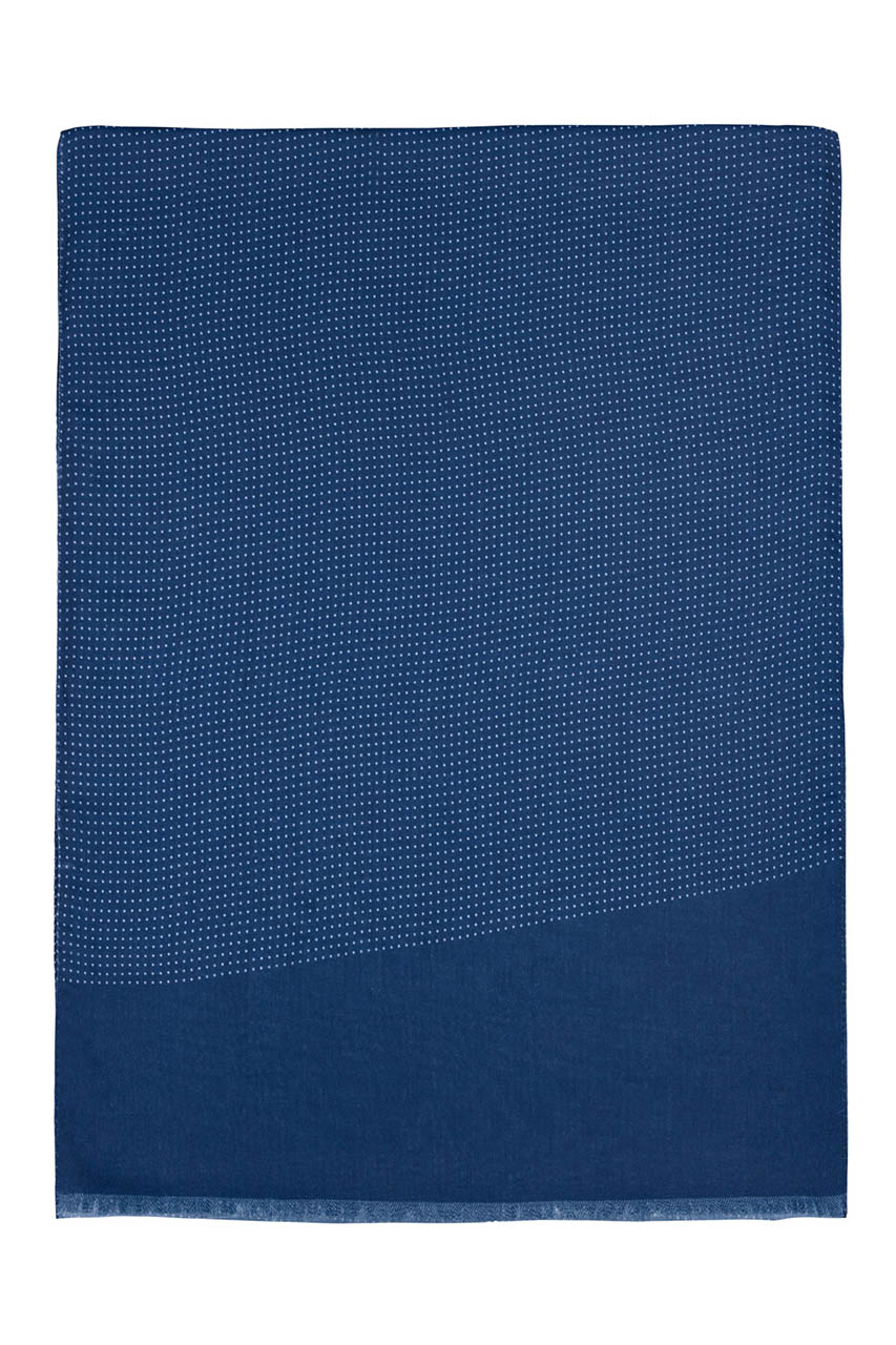 Męski granatowy szal w białe, drobne kropki. Wykonany z delikatnego, lekko transparentnego materiału. Wymiary szalika to 50x180 cm. Doskonały dodatek do miejskich stylizacji.