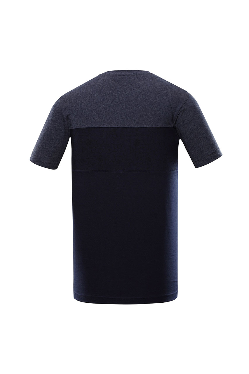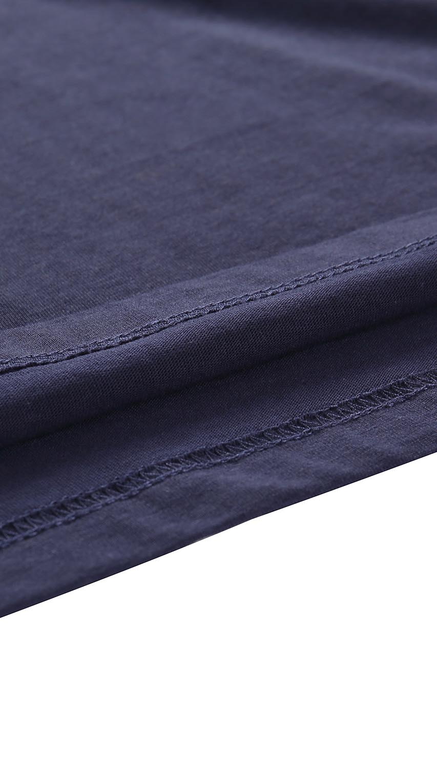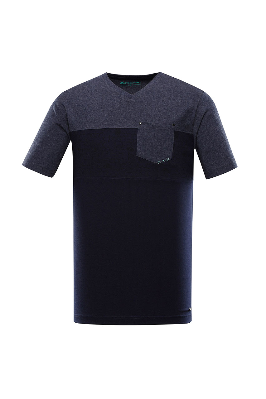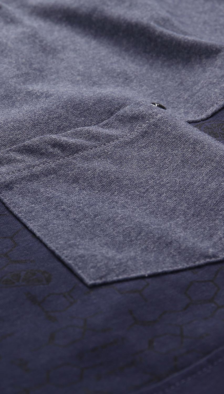 Granatowy t-shirt z dekoltem V-neck. Uszyty z wysokiej jakości bawełny uzyskiwanej w procesie technologicznym sprzyjającym naturze. Naturalne włókna zapewniają wysoki komfort użytkowania i wygodę. Co więcej, tkanina bawełniana jest przyjazna dla osób uczulonych i cierpiących na alergie. Koszulka o regularnym kroju, doskonale układa się na sylwetce. To model z łączonych tkanin, który fantastycznie odnajdzie się podczas, spacerów czy spotkań z przyjaciółmi.