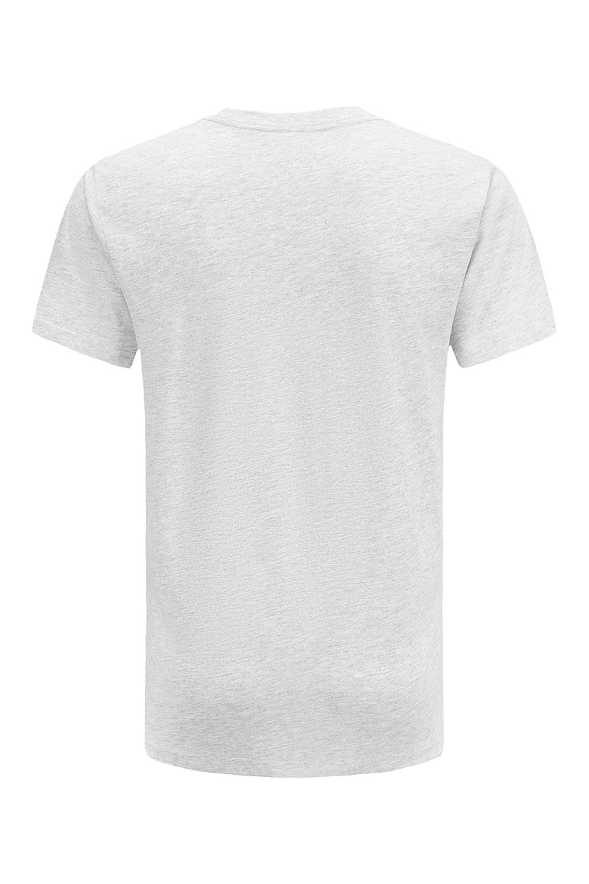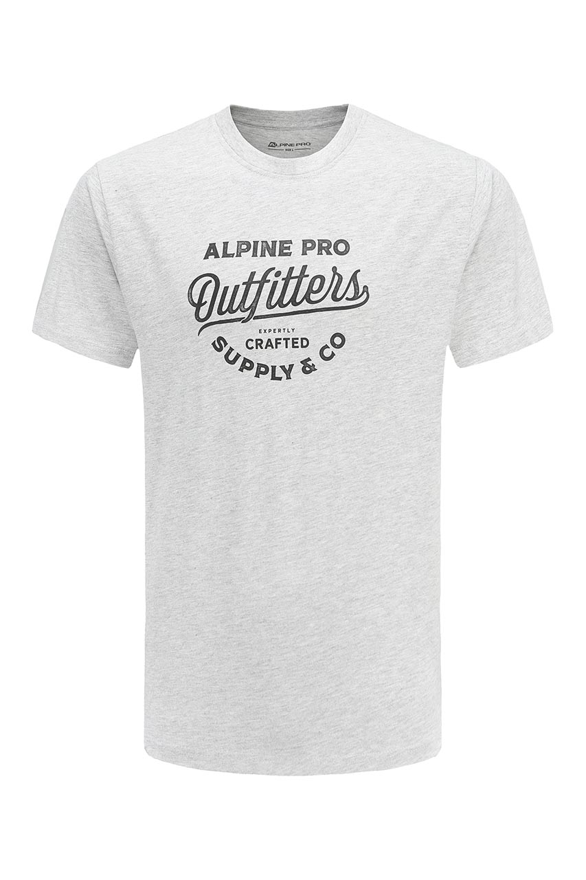 Klasyczny, jasnoszary t-shirt męski z krótkim rękawem. Został uszyty z miękkiej oraz przyjaznej dla skóry bawełny. Posiada okrągły kołnierzyk oraz ozdobny nadruk z przodu. Koszulka ma tradycyjny fason, dlatego świetnie sprawdzi się nie tylko na co dzień, ale także podczas aktywności fizycznej. To dobra propozycja do noszenia z chinosami, jeansami, a także spodniami trekkingowymi.