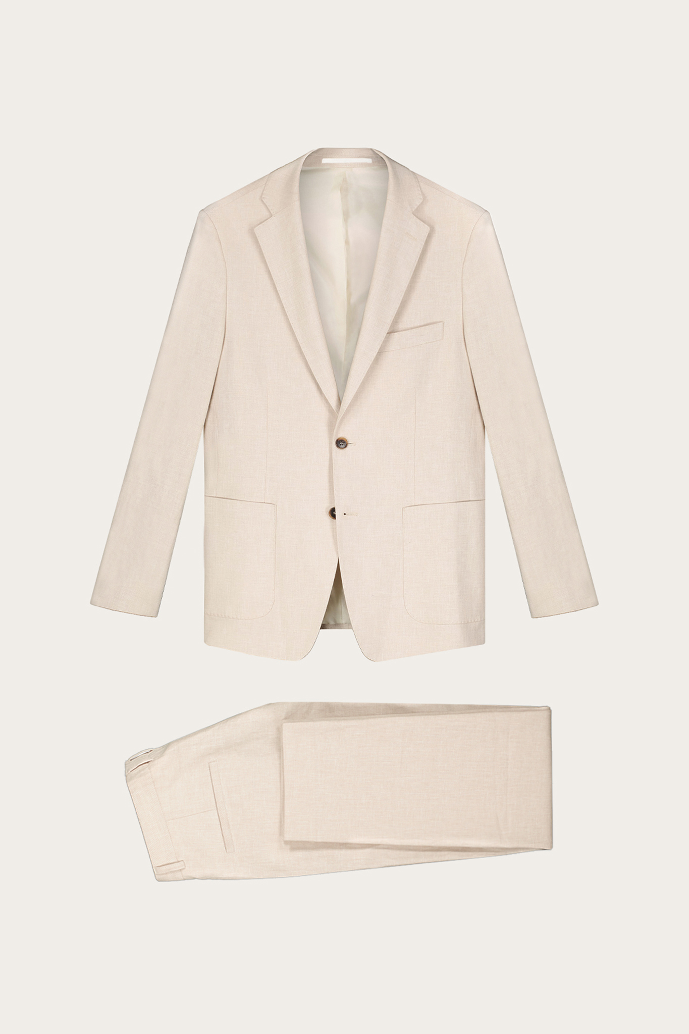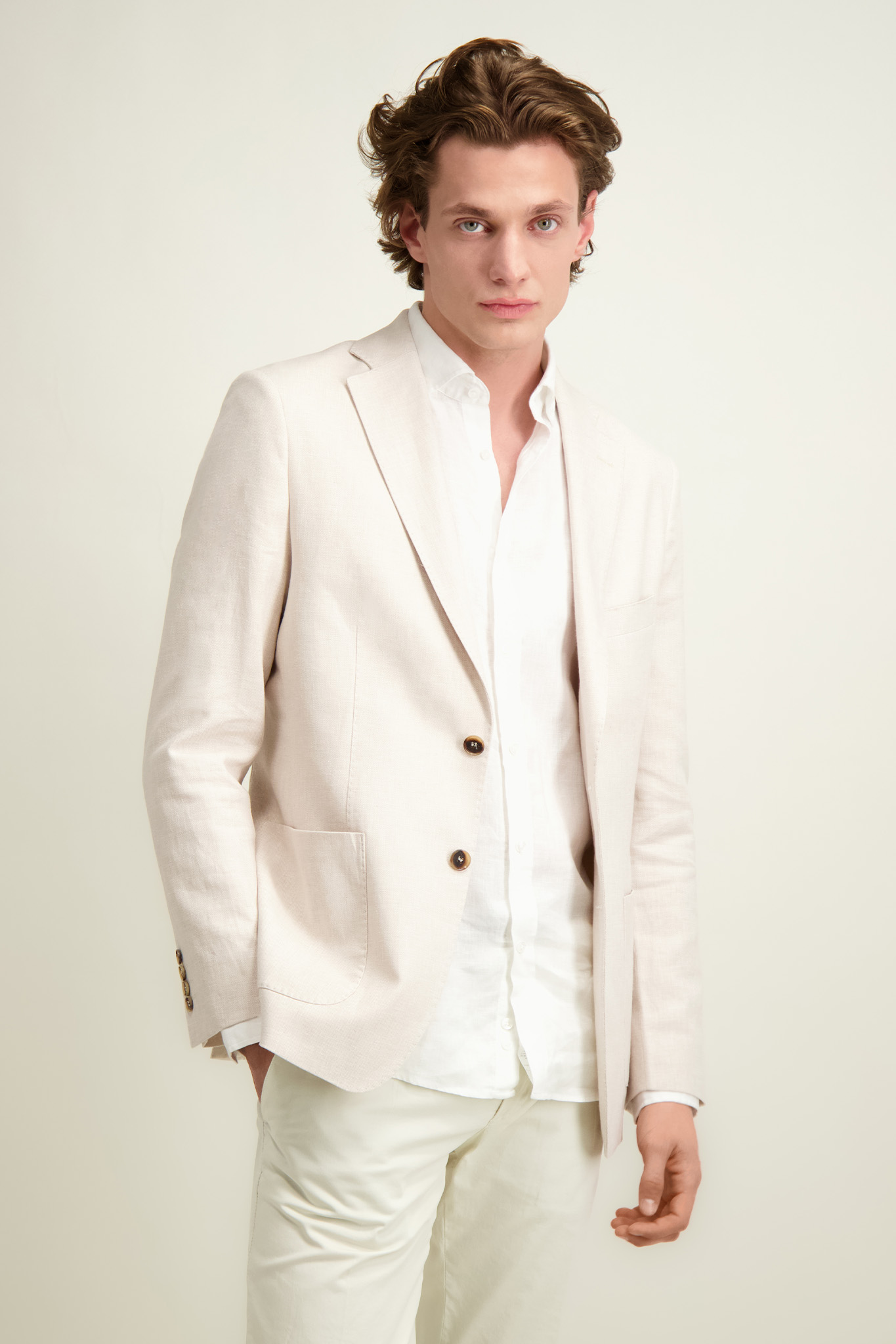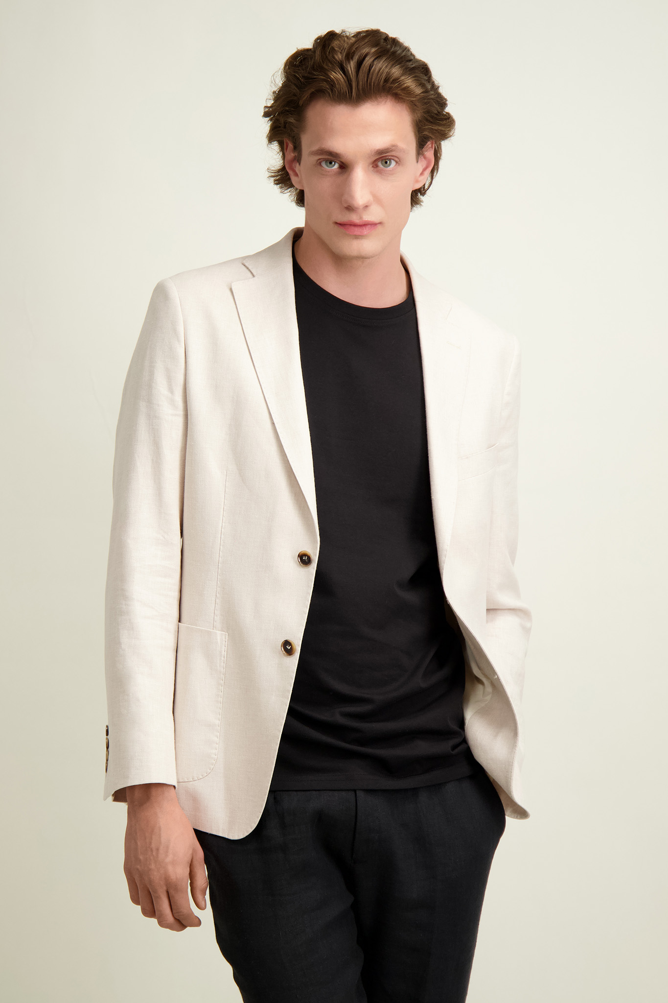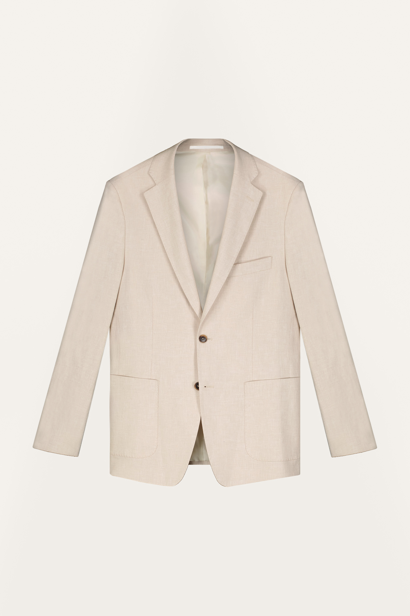 Jednorzędowa marynarka męska w kolorze beżowym. Uszyta z tkaniny z lnem i bawełną. Posiada otwarte klapy oraz dwie nakładane kieszenie. Ze spodniami (66440) tworzy garnitur.